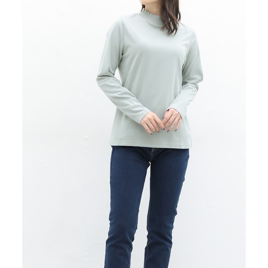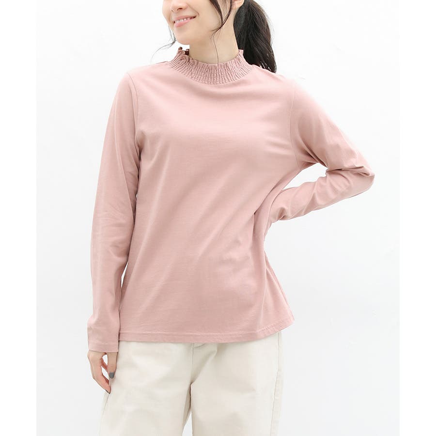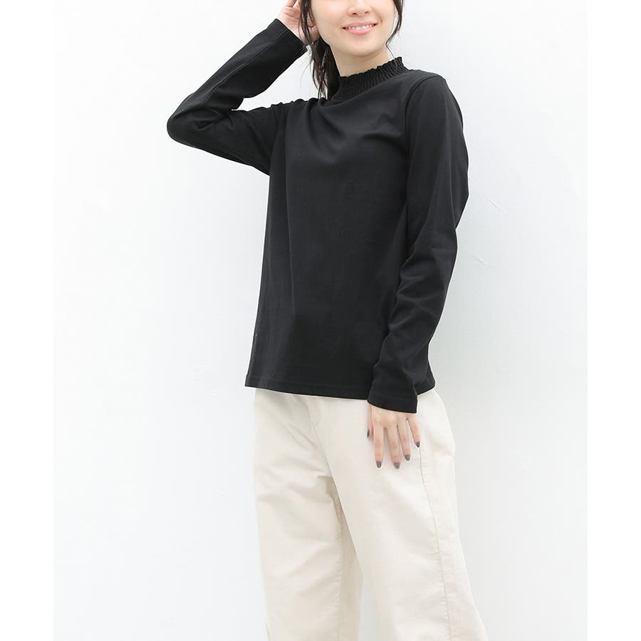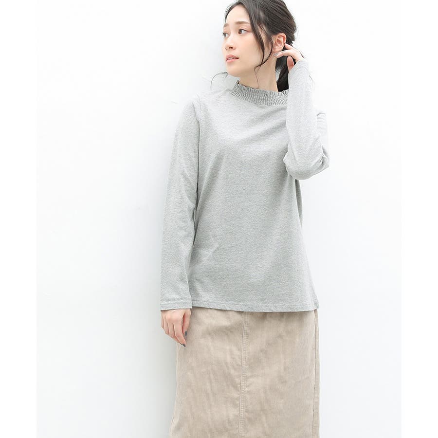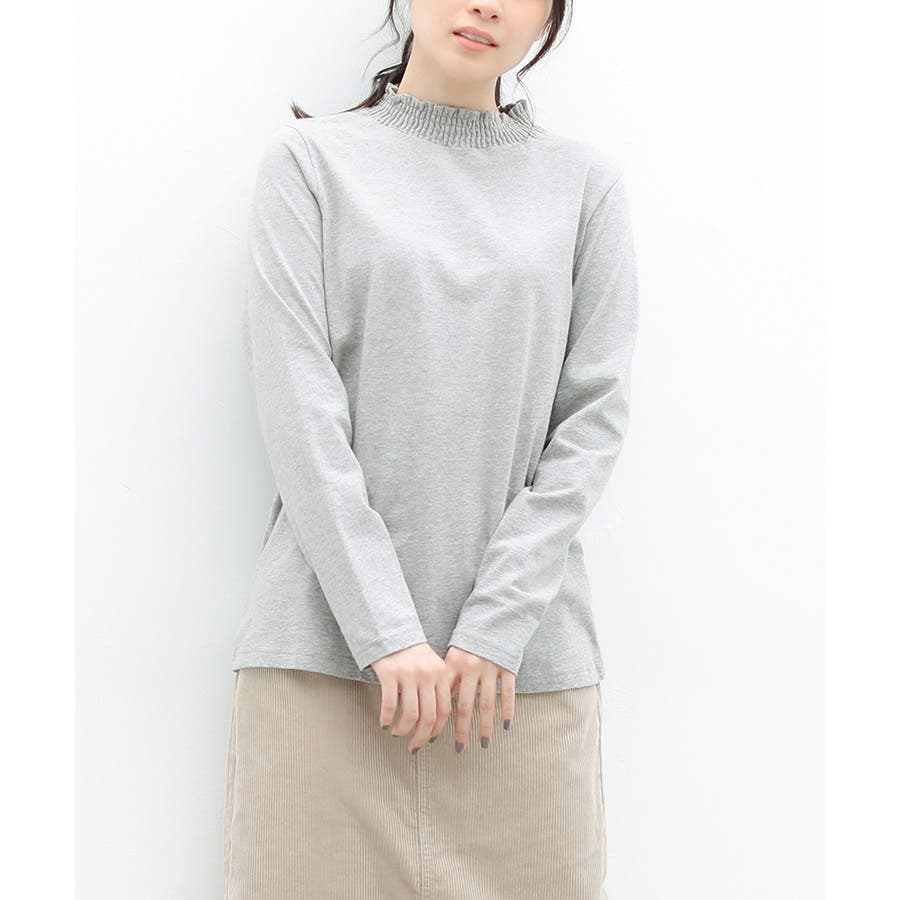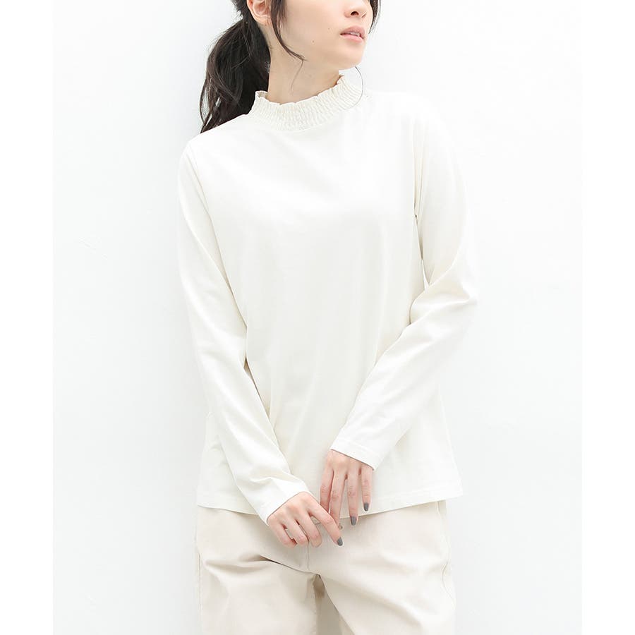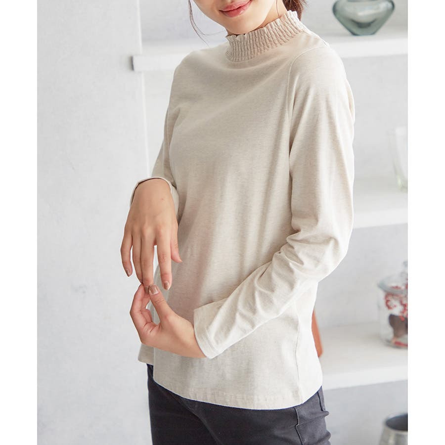 首元のシャーリングが大人可愛いハイネックトップス。