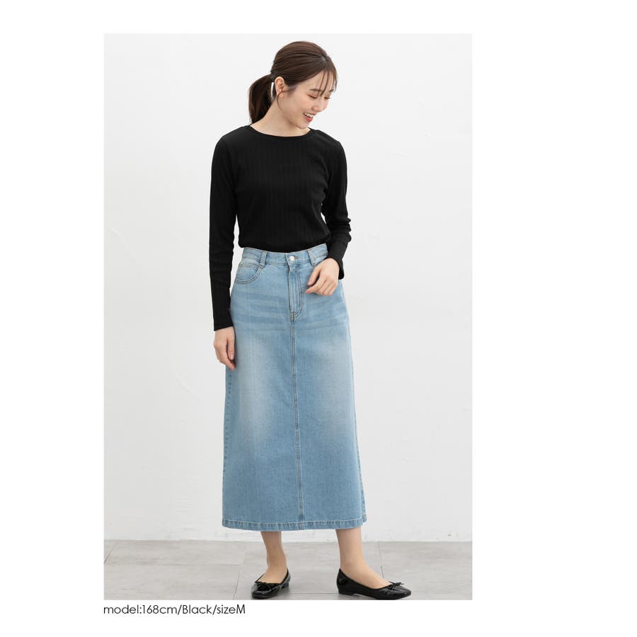 腰にかかる丈感のすっきりめシルエットと縦目のラインで細見え効果も◎