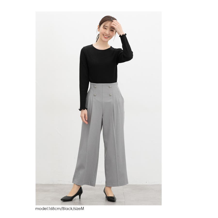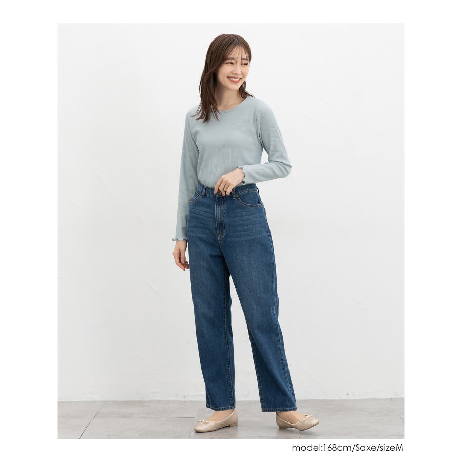 腰にかかる丈感のすっきりめシルエットと縦目のラインで細見え効果も◎