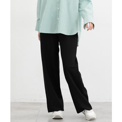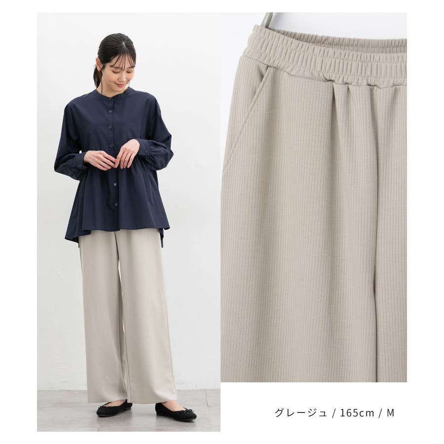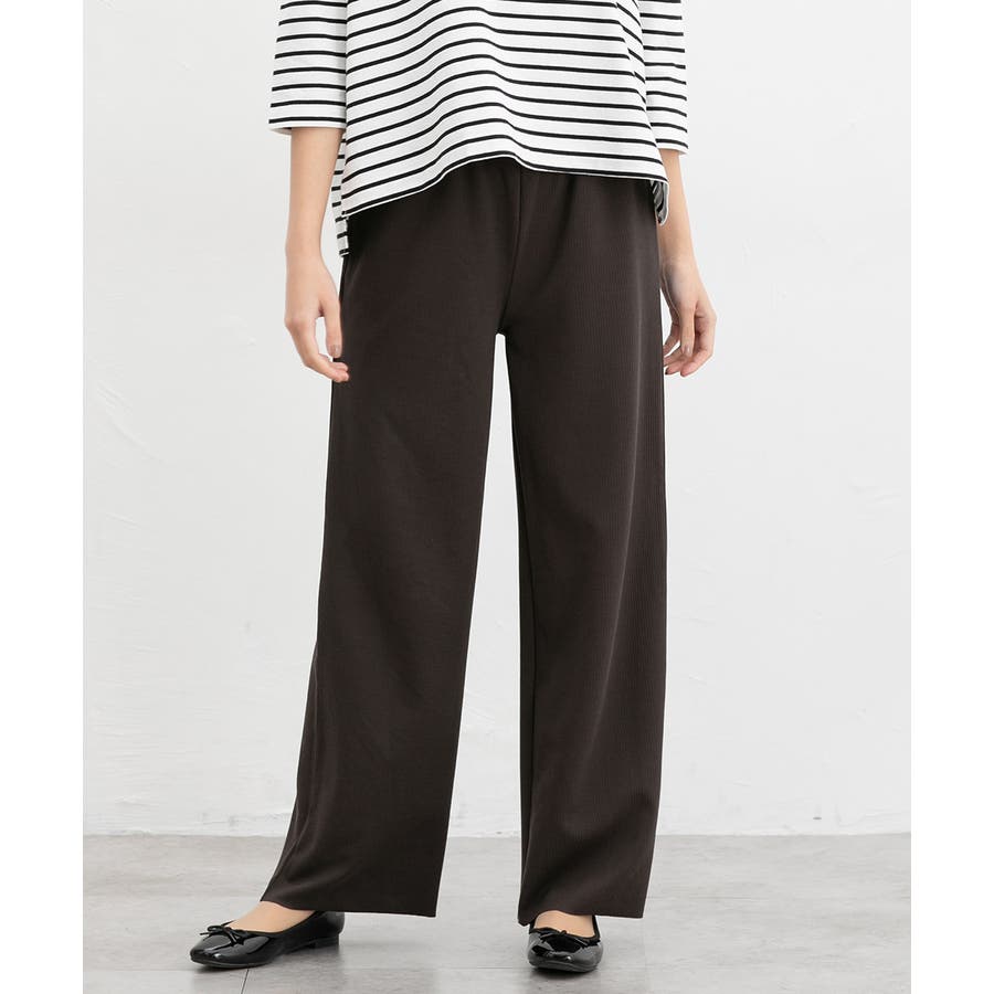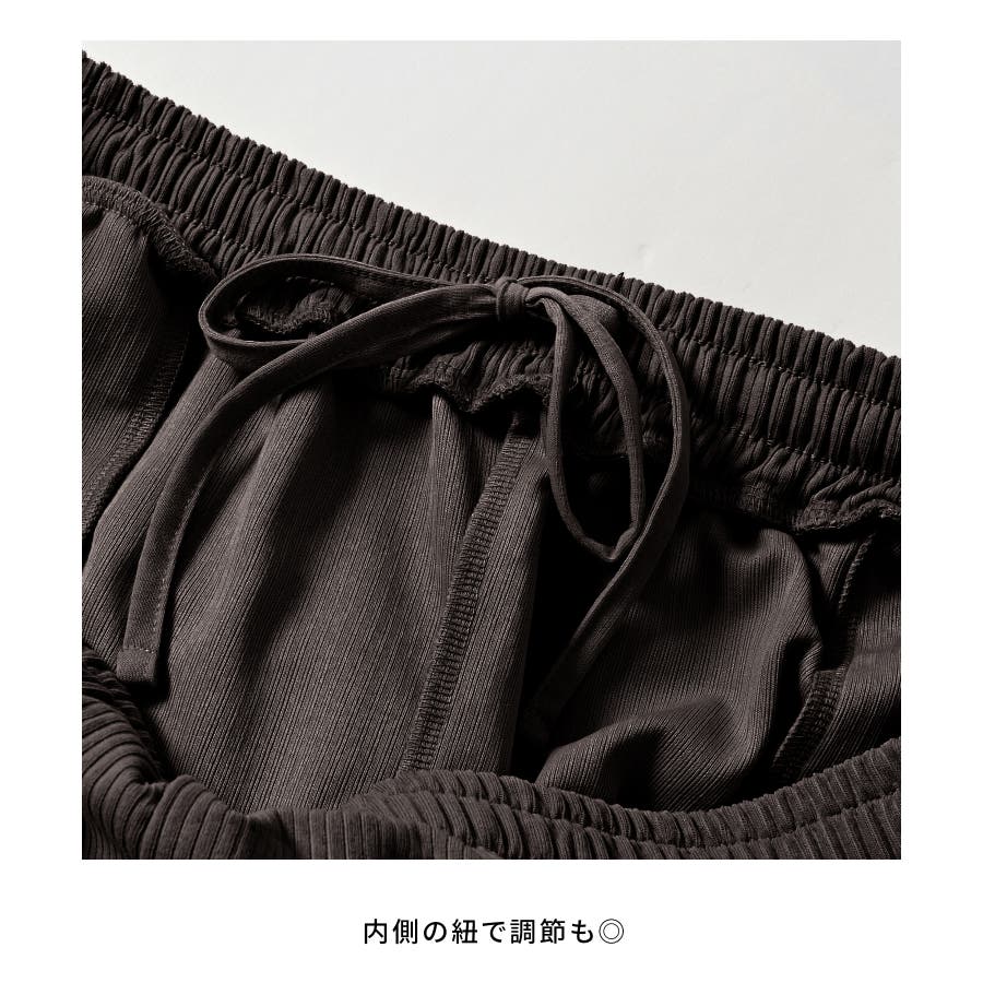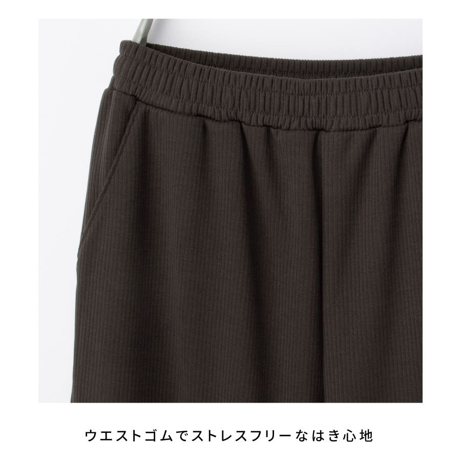 ストレッチの利いたレーヨン混のリブ素材とウエストゴムで、ストレスフリーなはき心地。