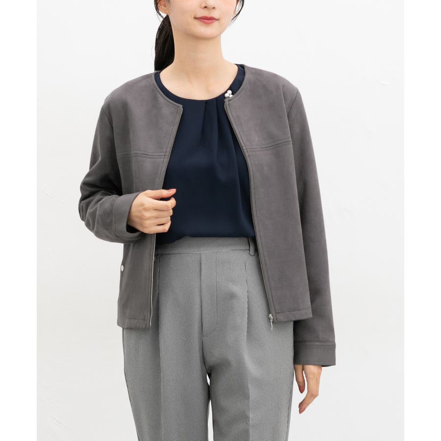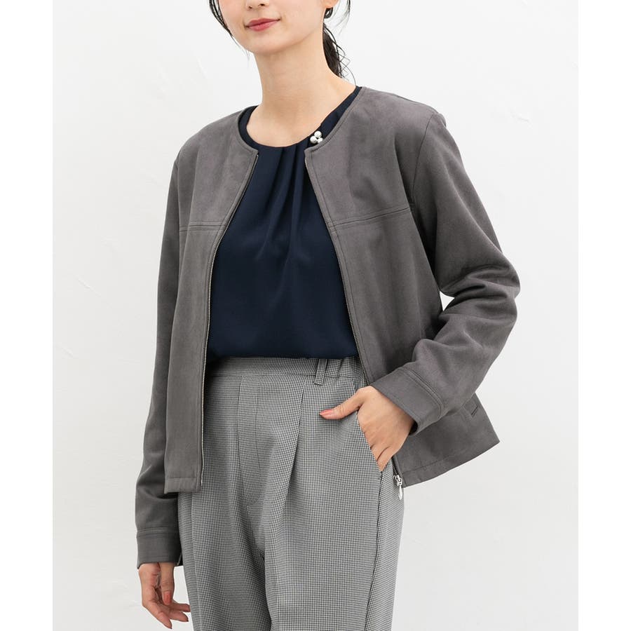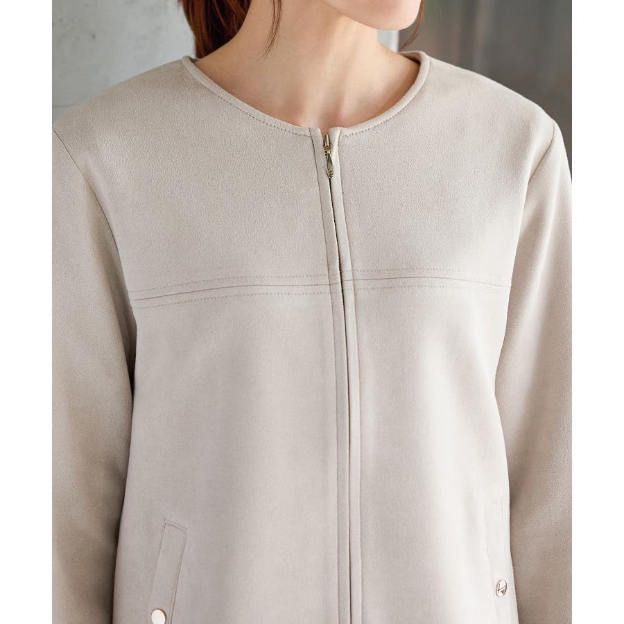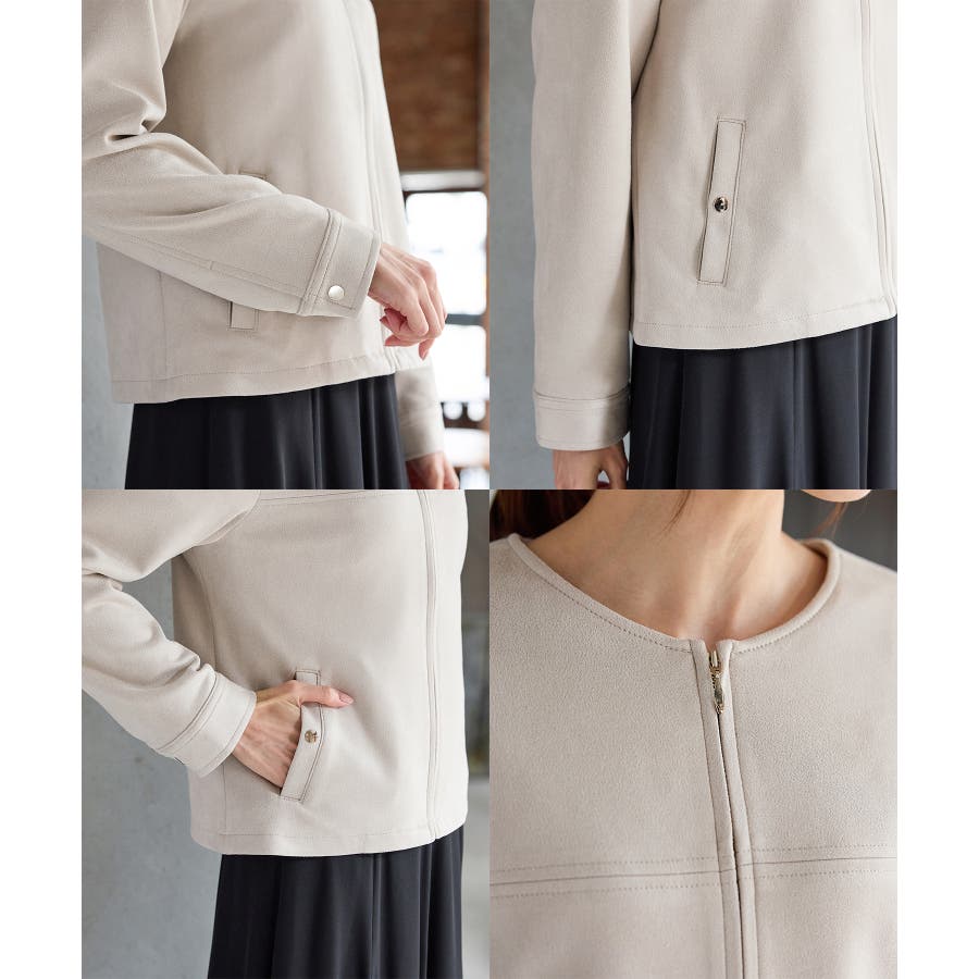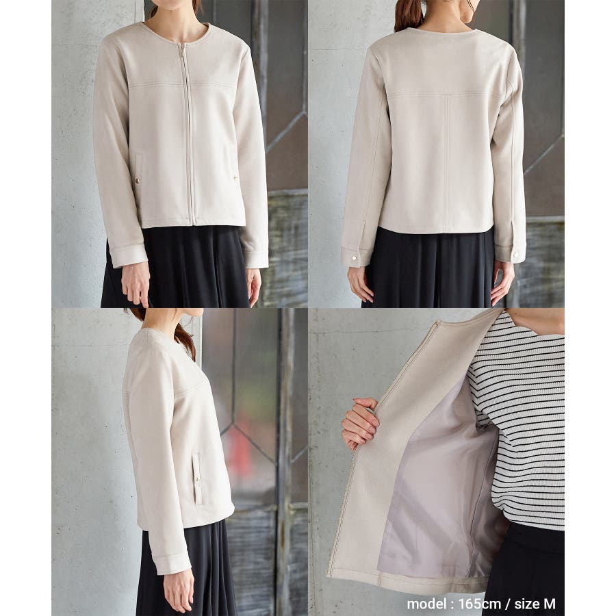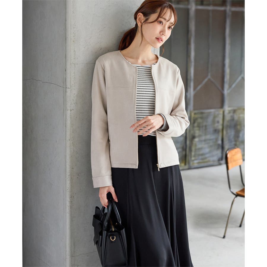 高級感のある素材に、すっきりしたノーカラーとジップ使いの上品なデザイン。