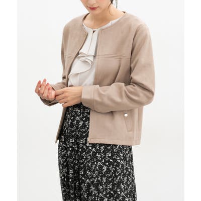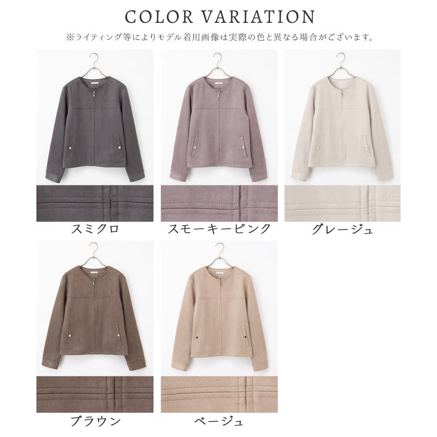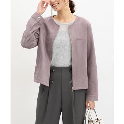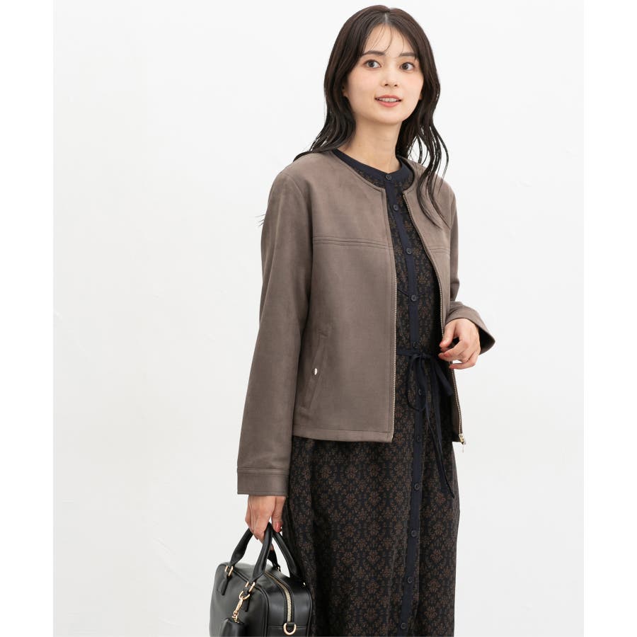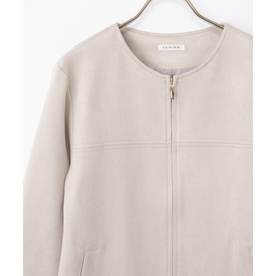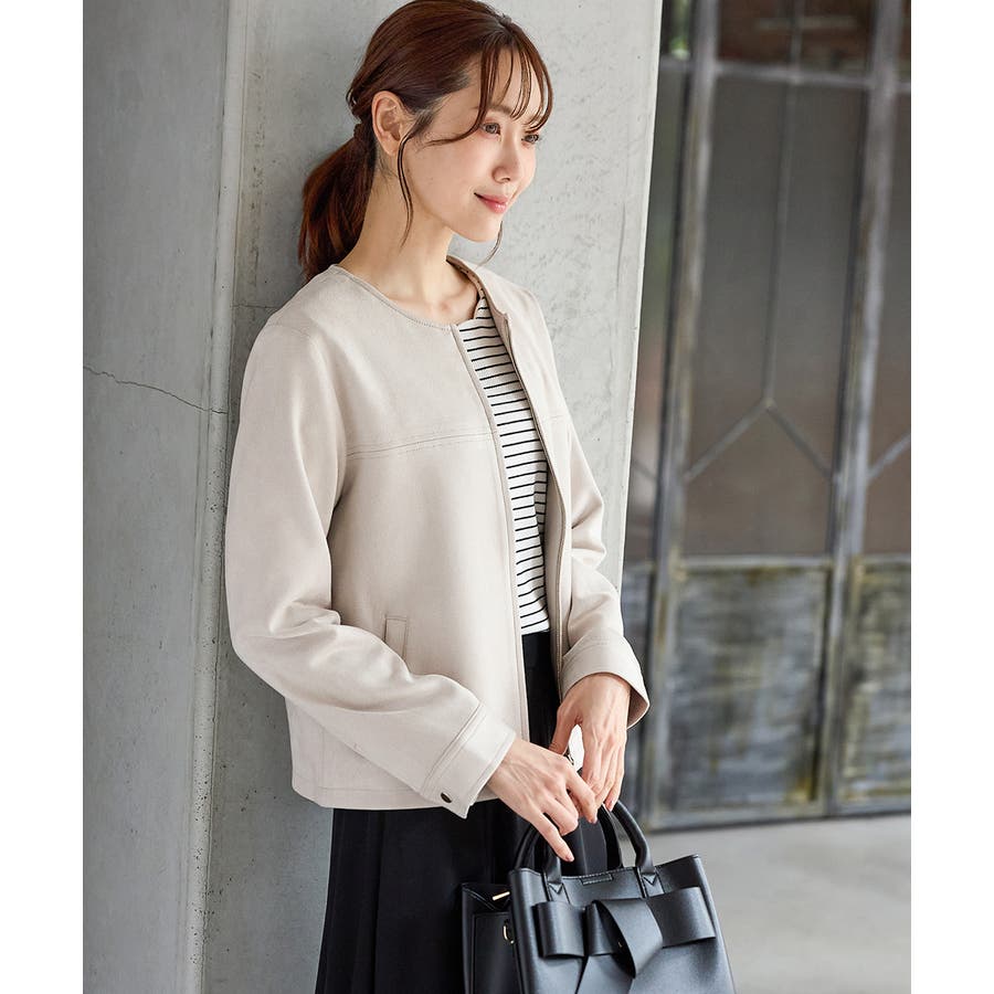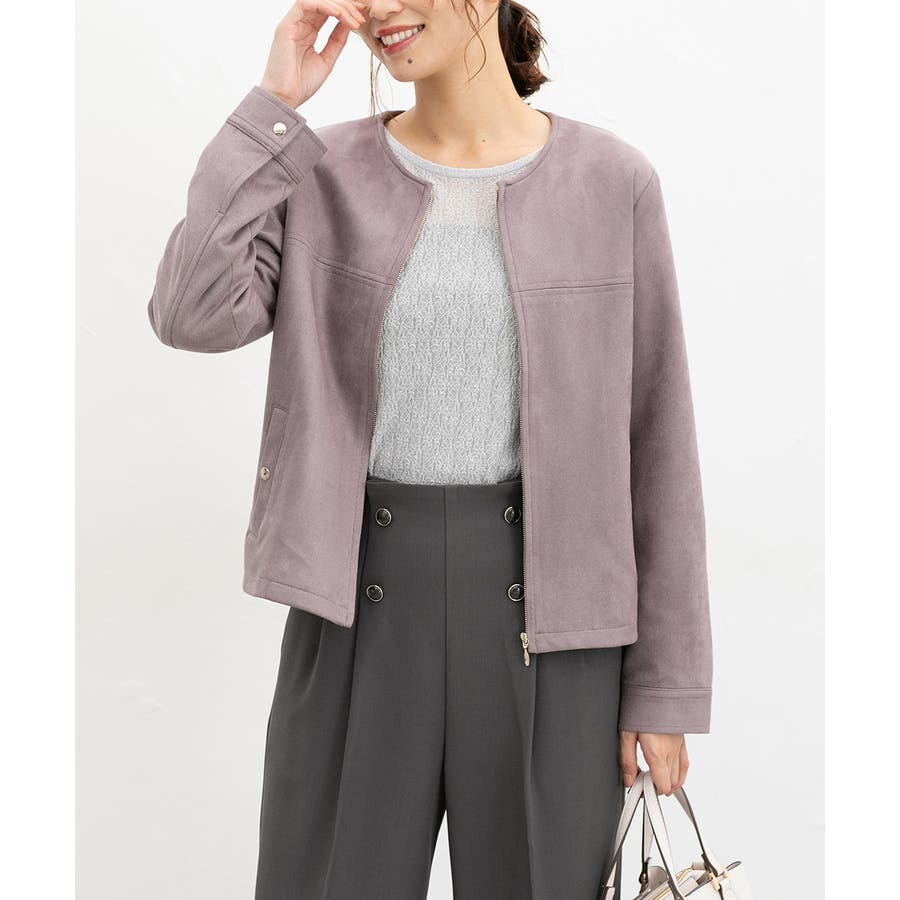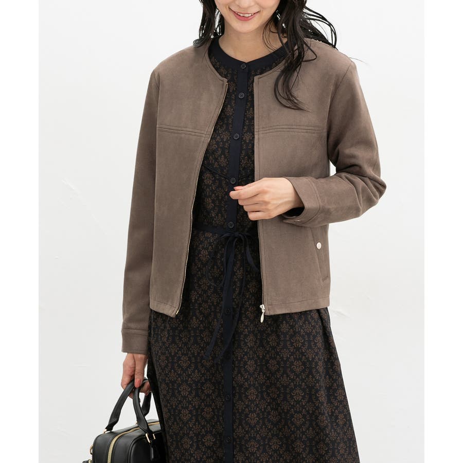 高級感のある素材に、すっきりしたノーカラーとジップ使いの上品なデザイン。