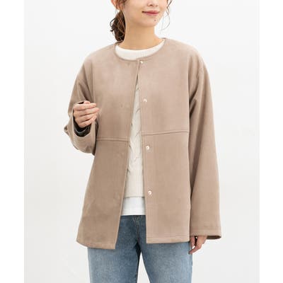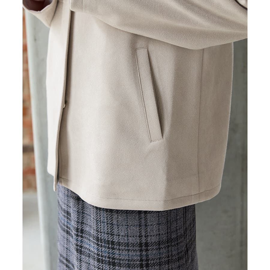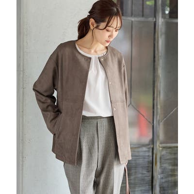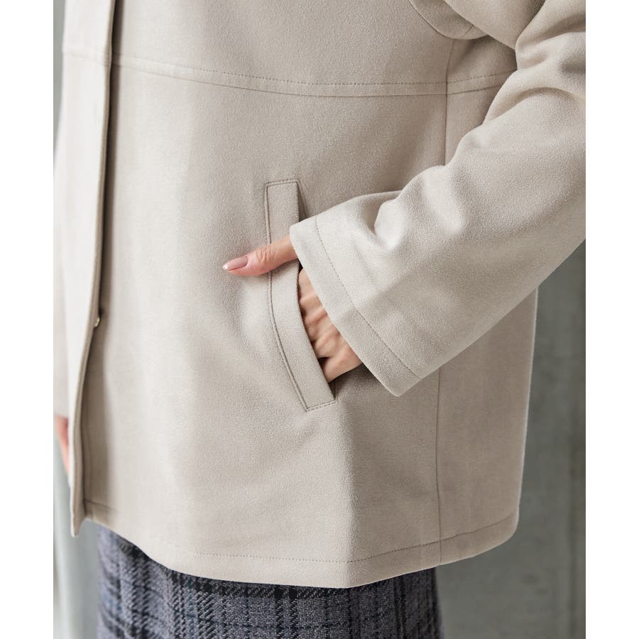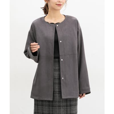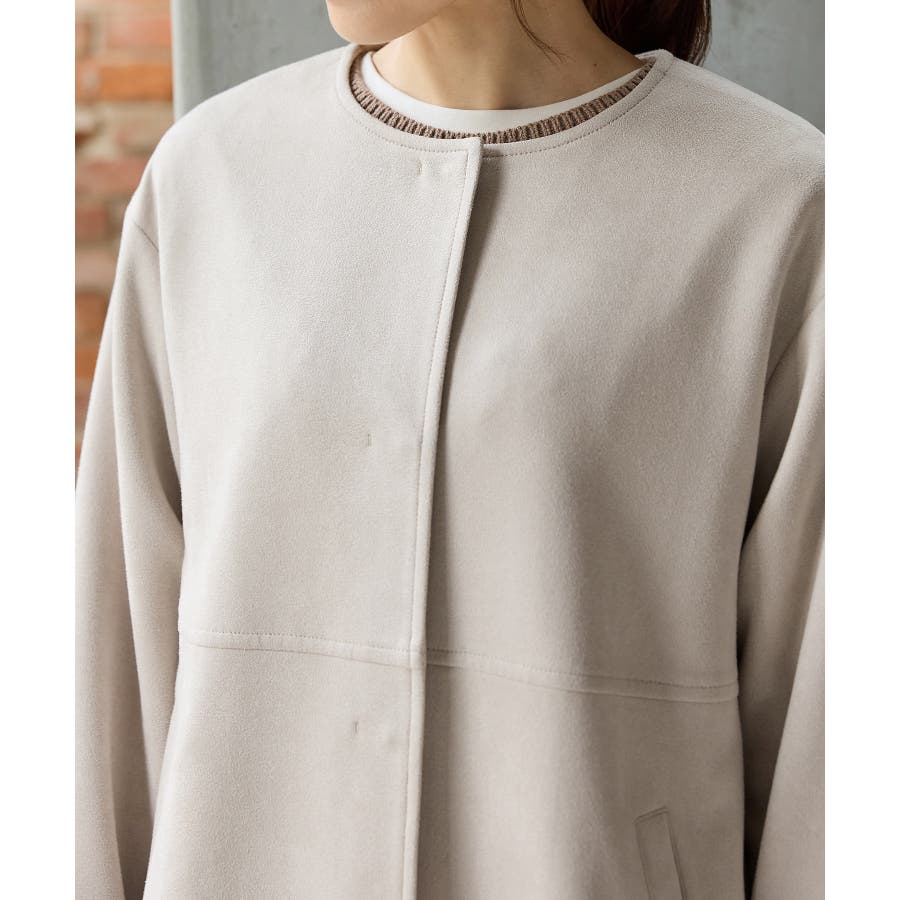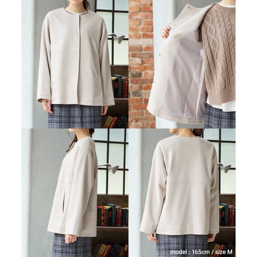 高級感のある素材に、すっきりしたノーカラーとボタンを隠した比翼仕立ての上品なデザイン。