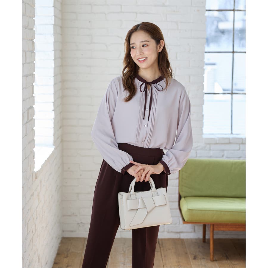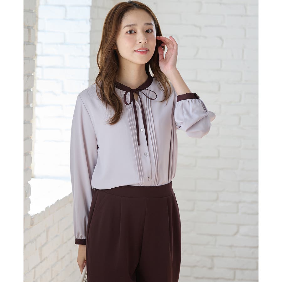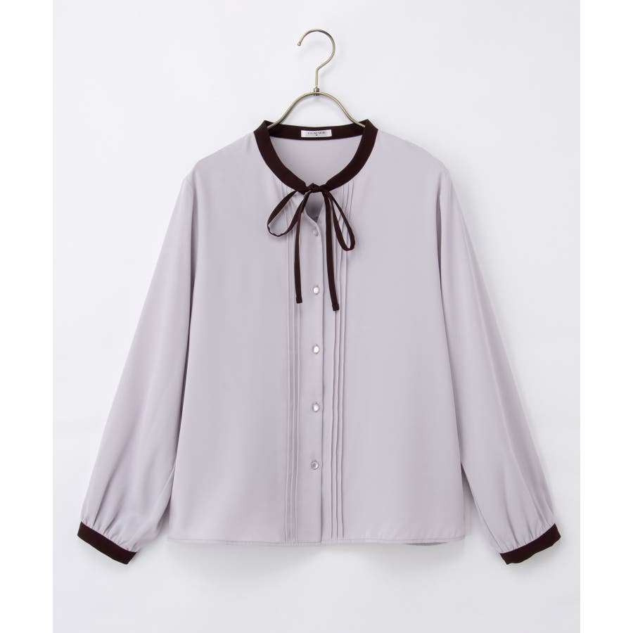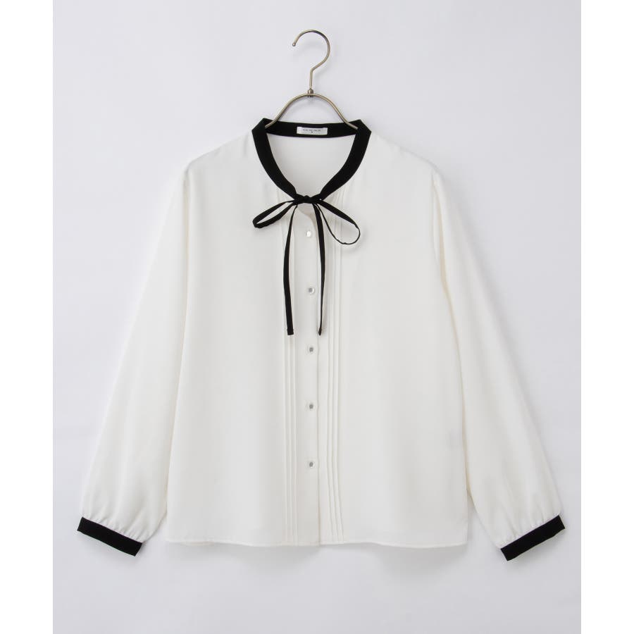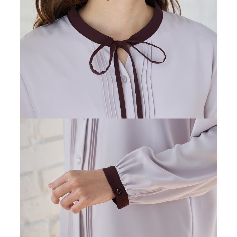 優しい印象のバンドカラーに、シックな配色リボンとピンタックをプラスした大人可愛いデザイン。