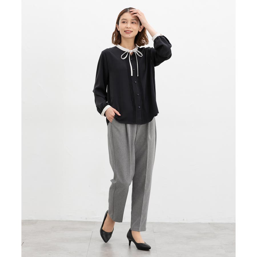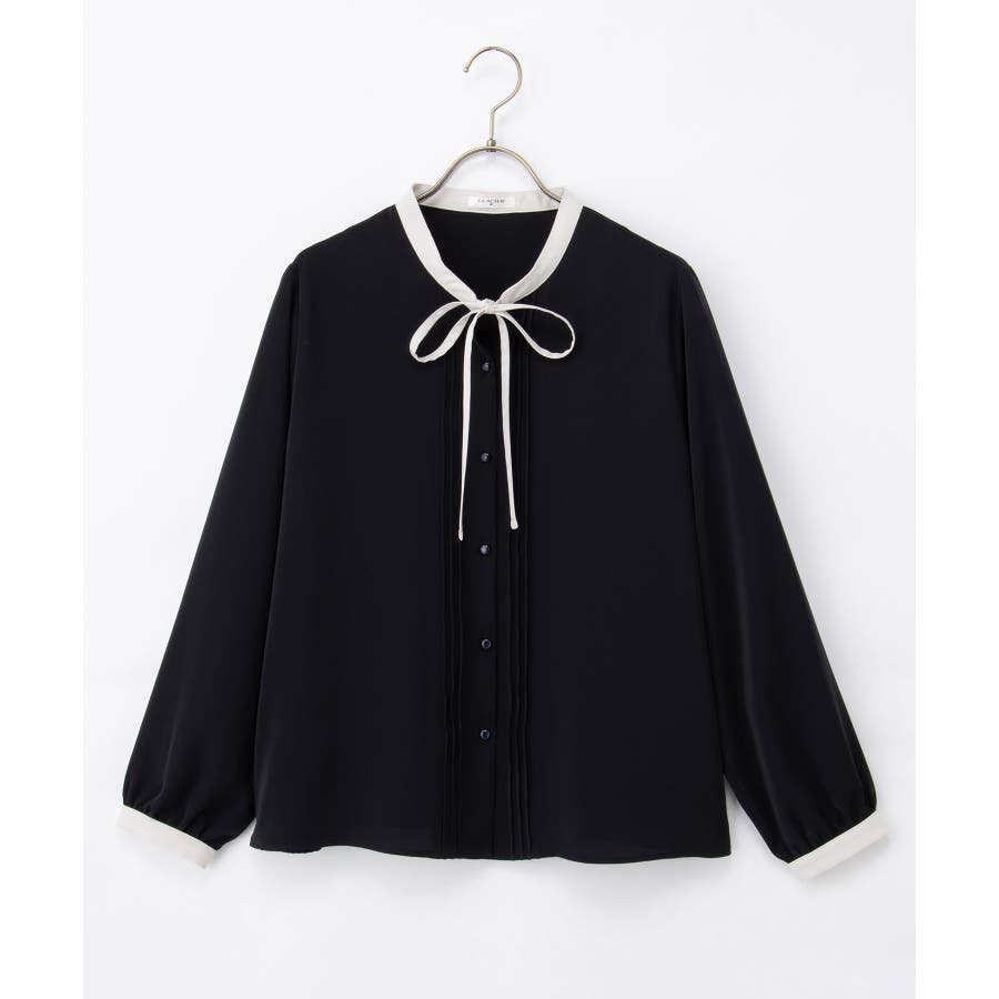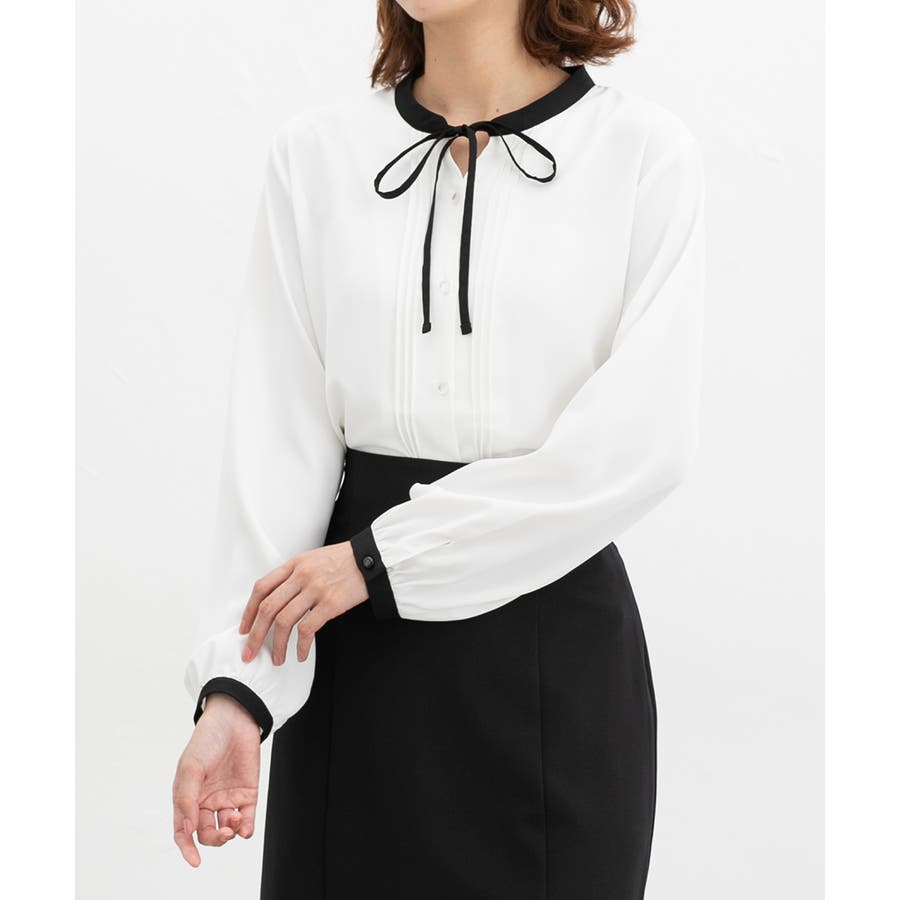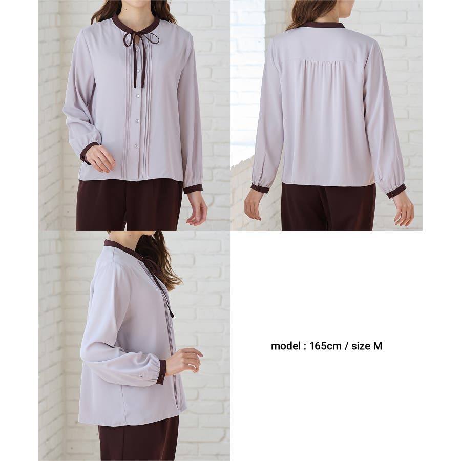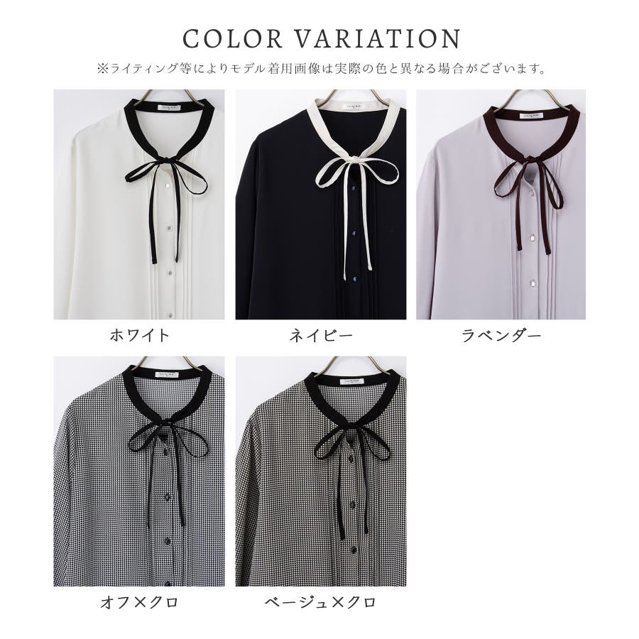 優しい印象のバンドカラーに、シックな配色リボンとピンタックをプラスした大人可愛いデザイン。