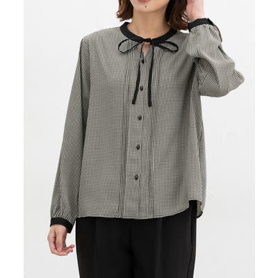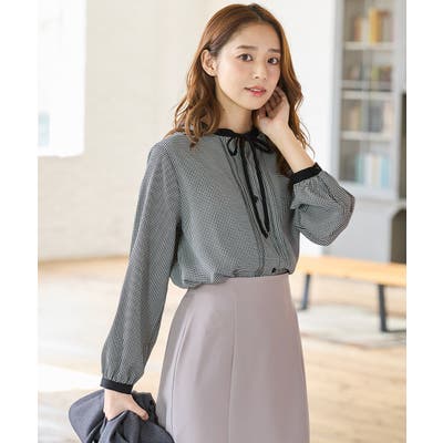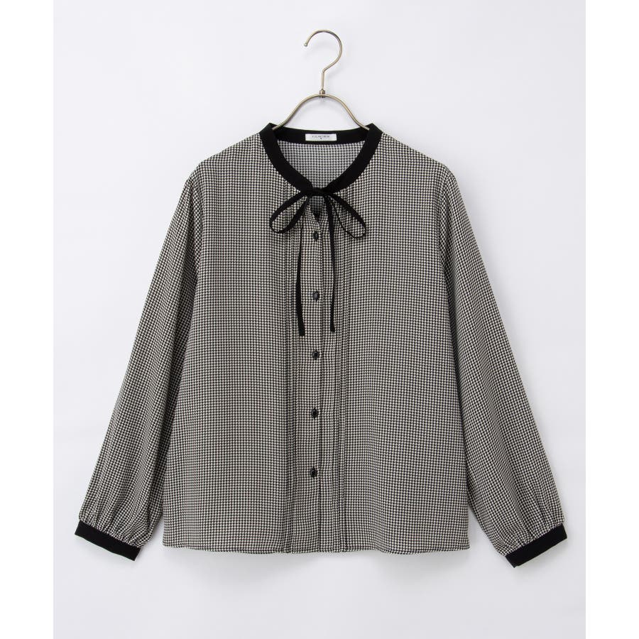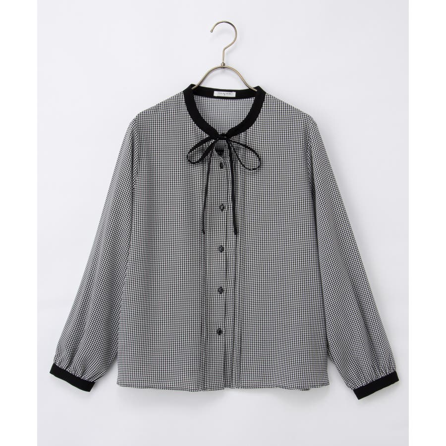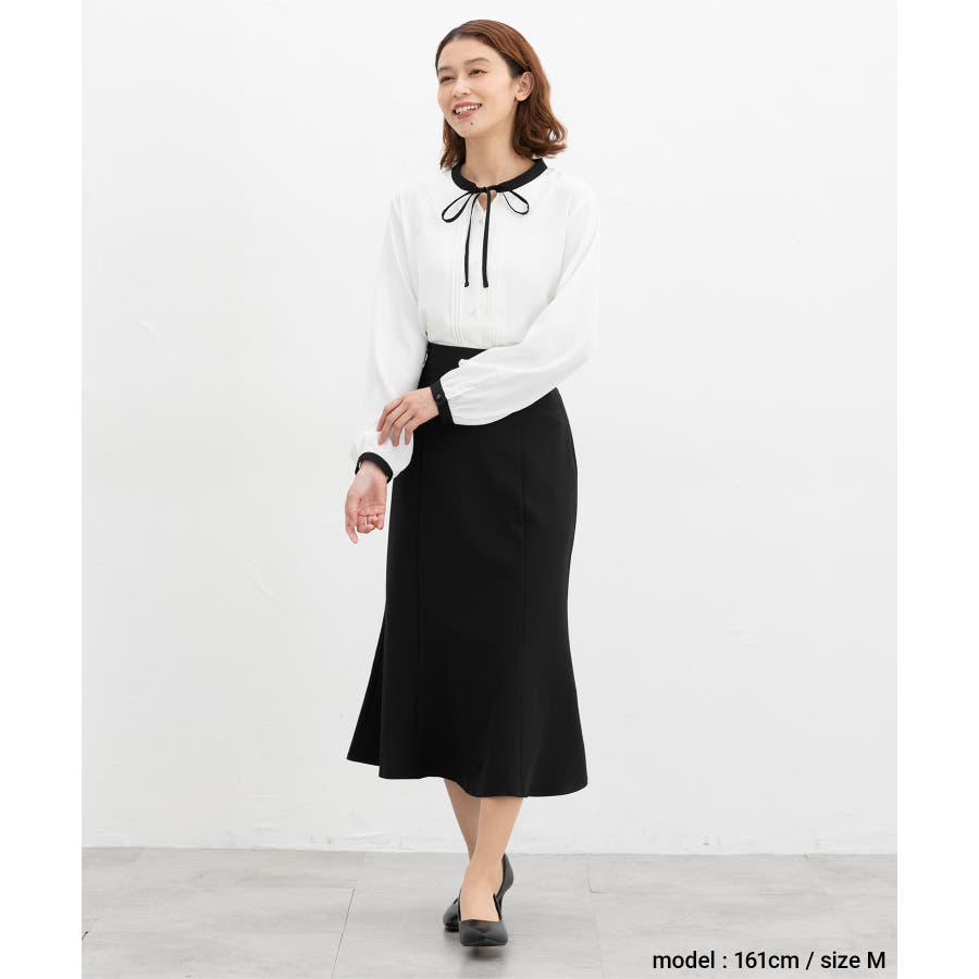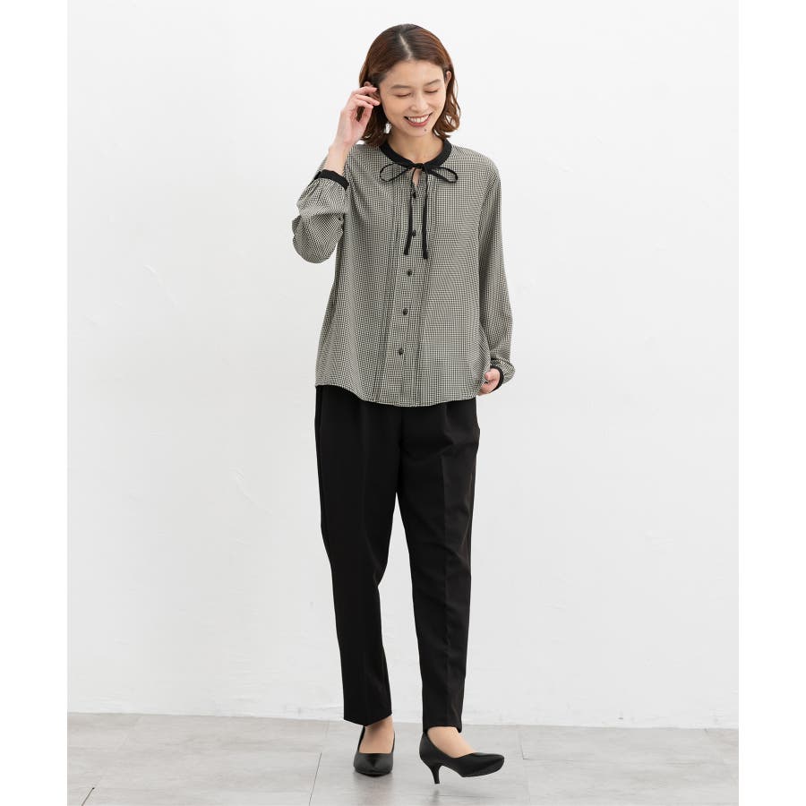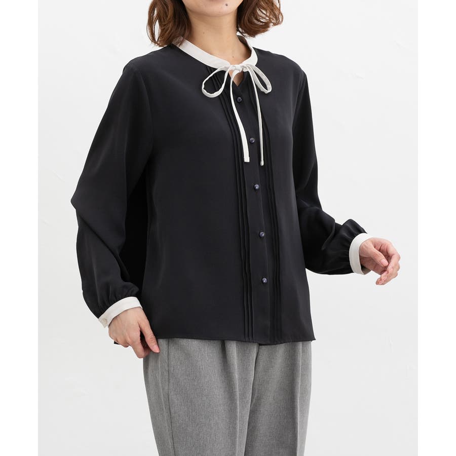 優しい印象のバンドカラーに、シックな配色リボンとピンタックをプラスした大人可愛いデザイン。