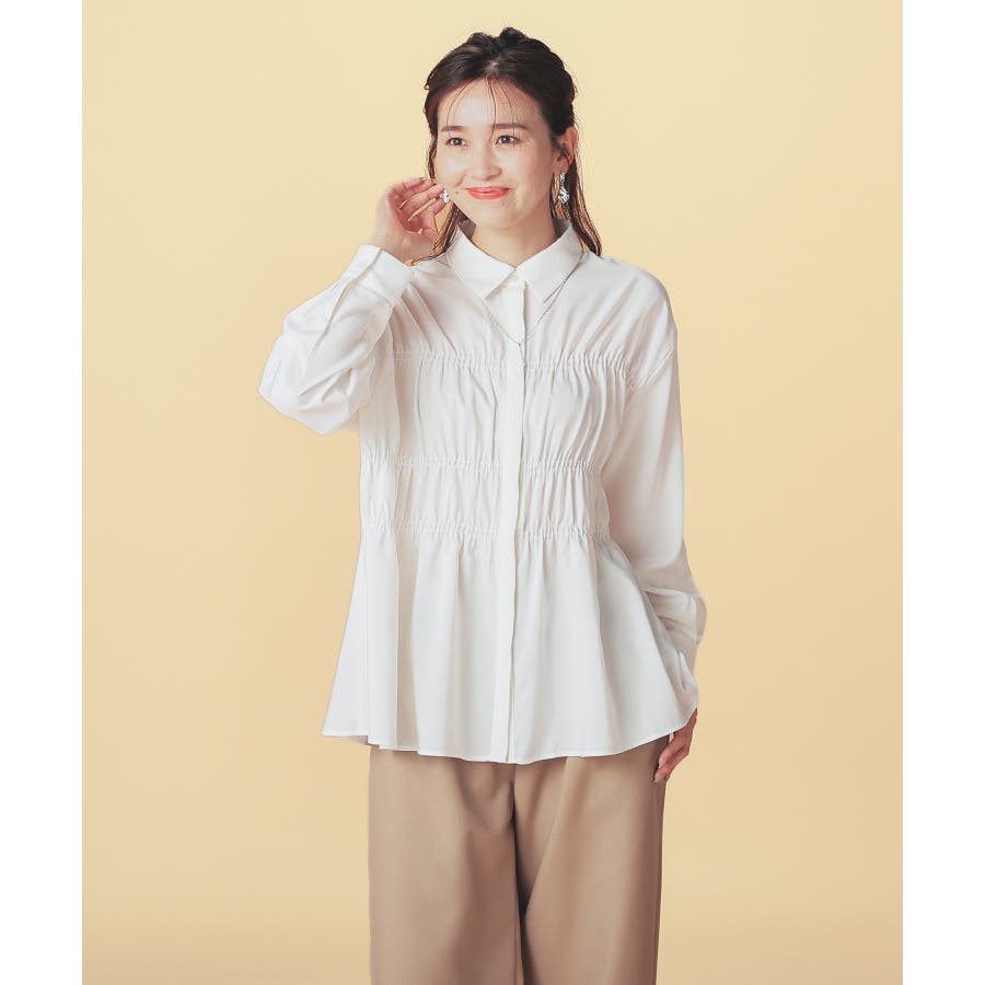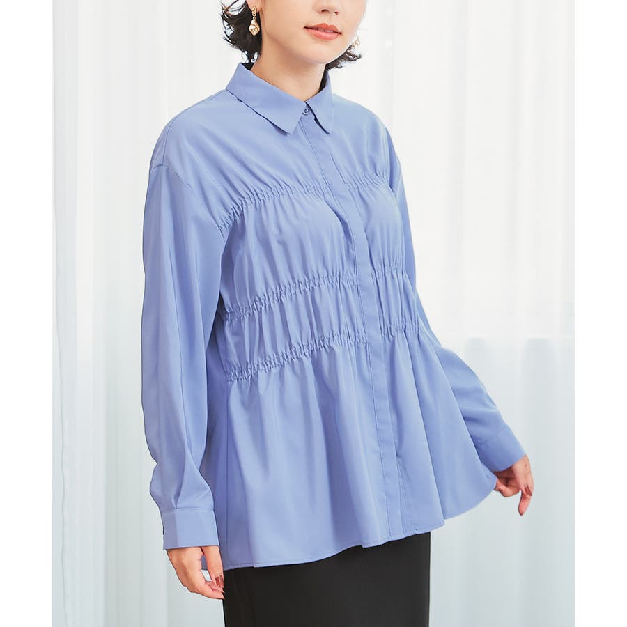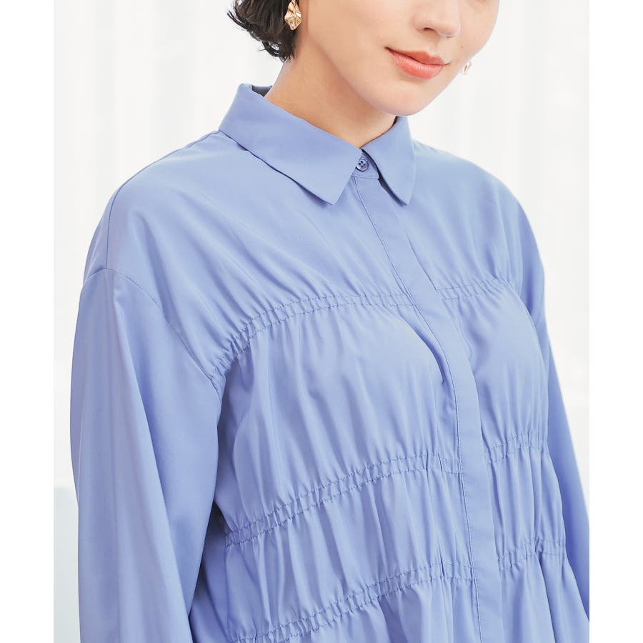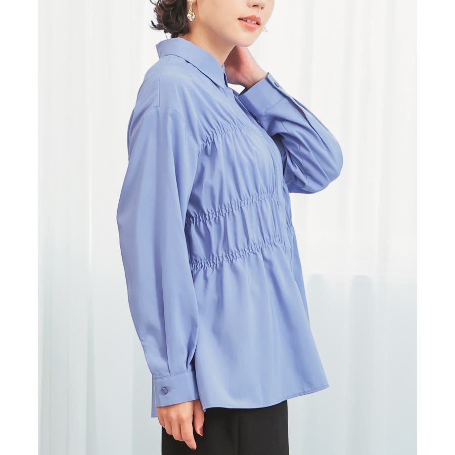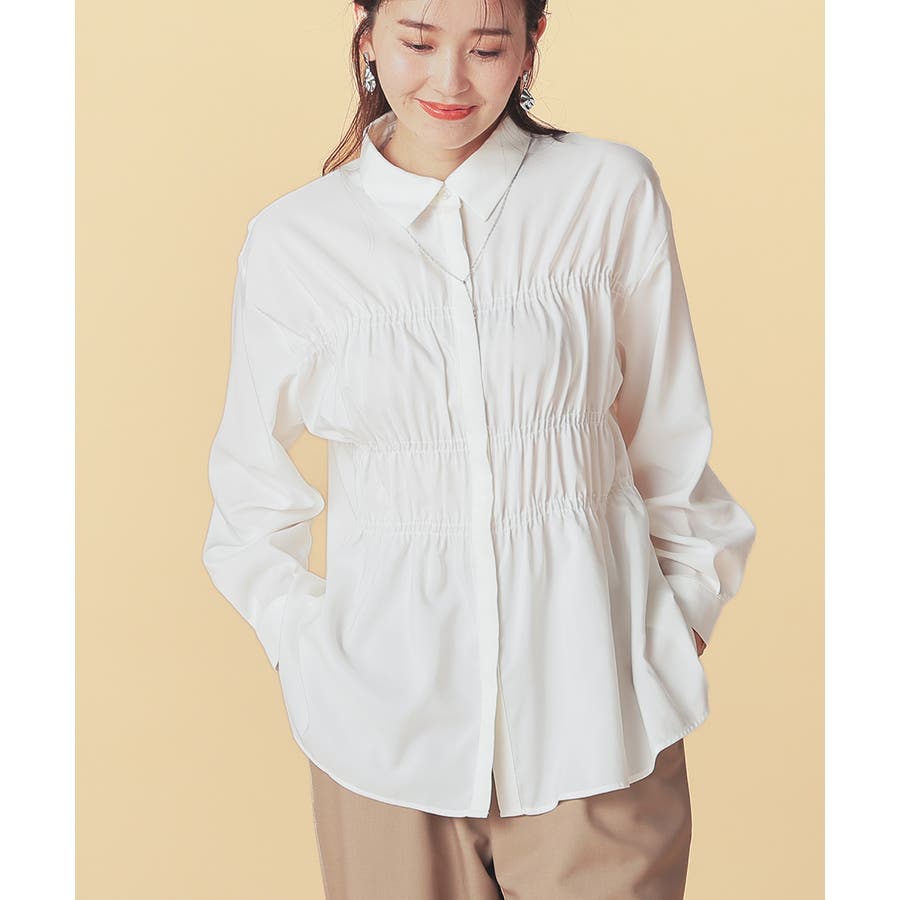 レギュラーカラーのシャツに、トレンドのシャーリングでフェミニン要素をプラスしたデザイン。