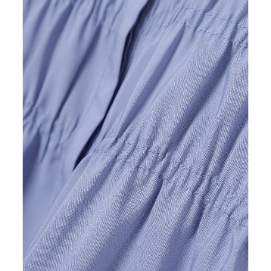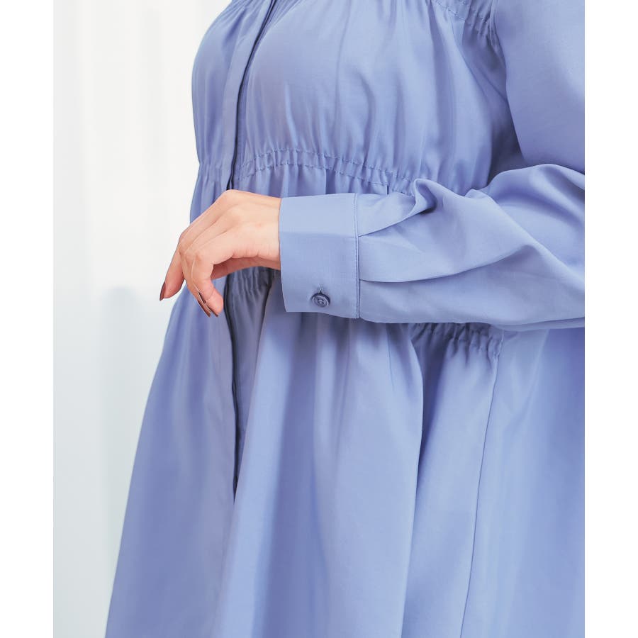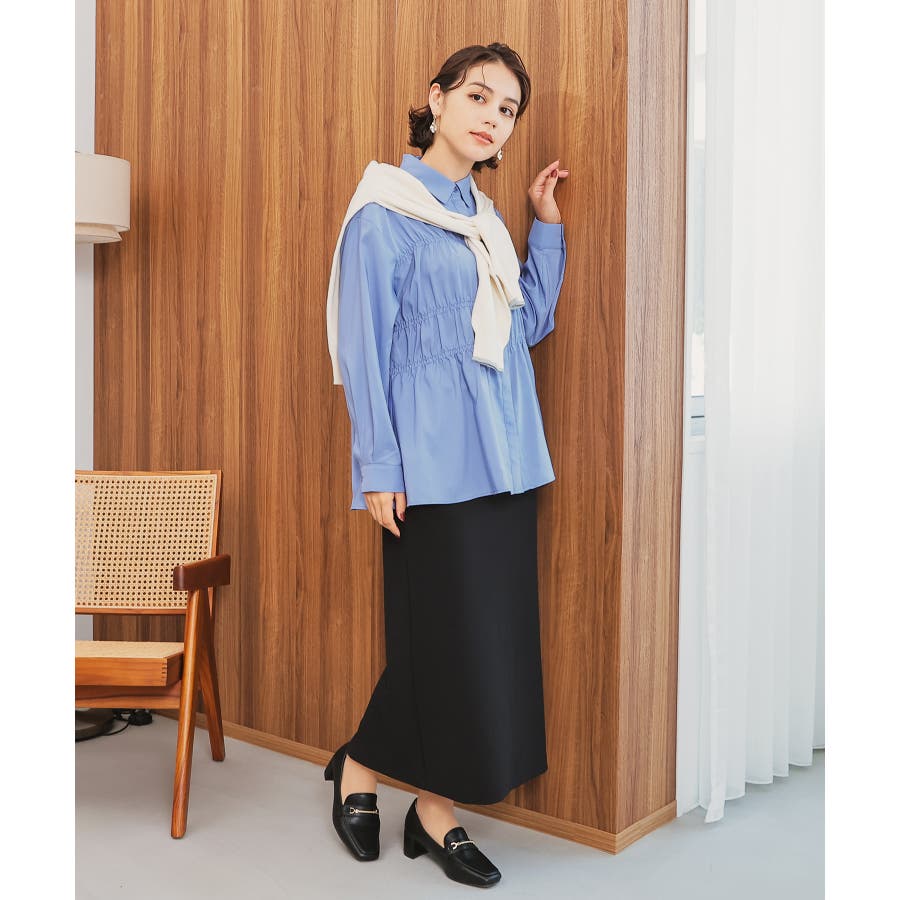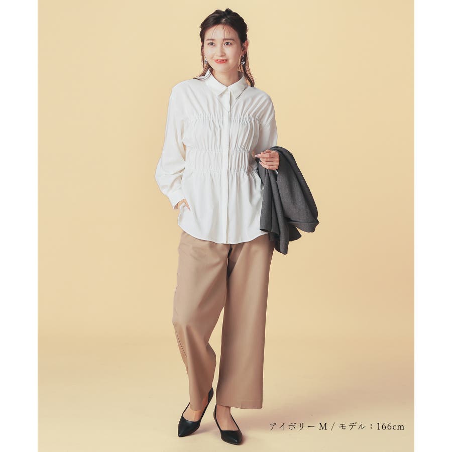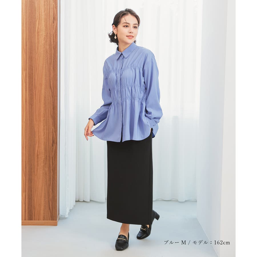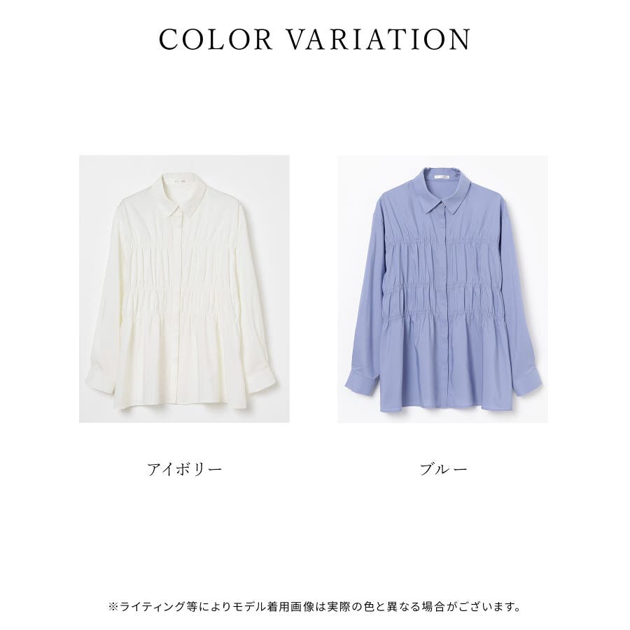 レギュラーカラーのシャツに、トレンドのシャーリングでフェミニン要素をプラスしたデザイン。