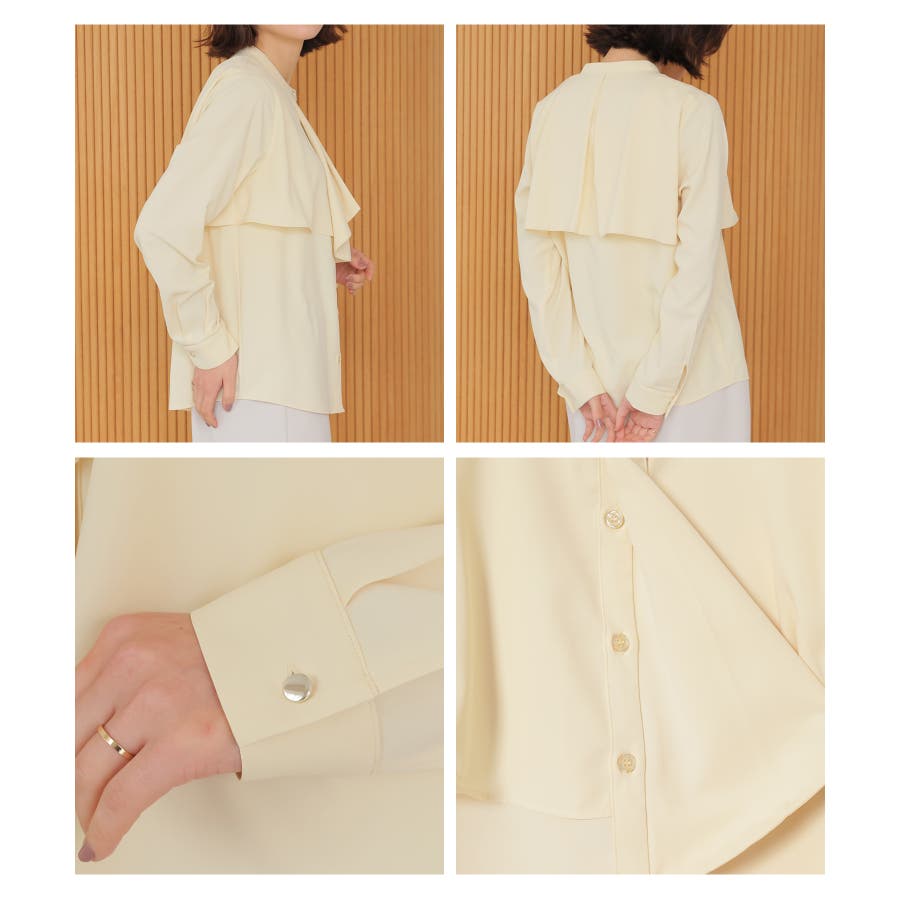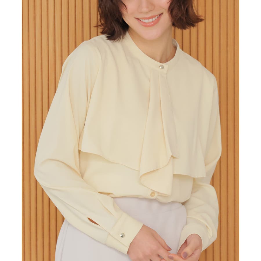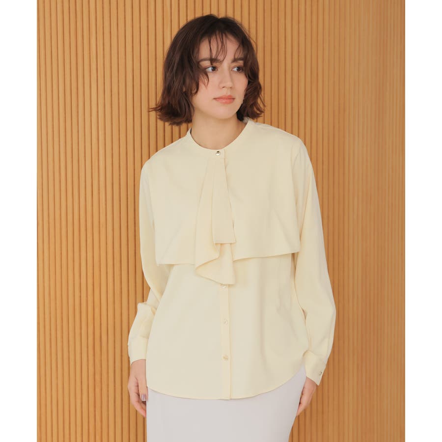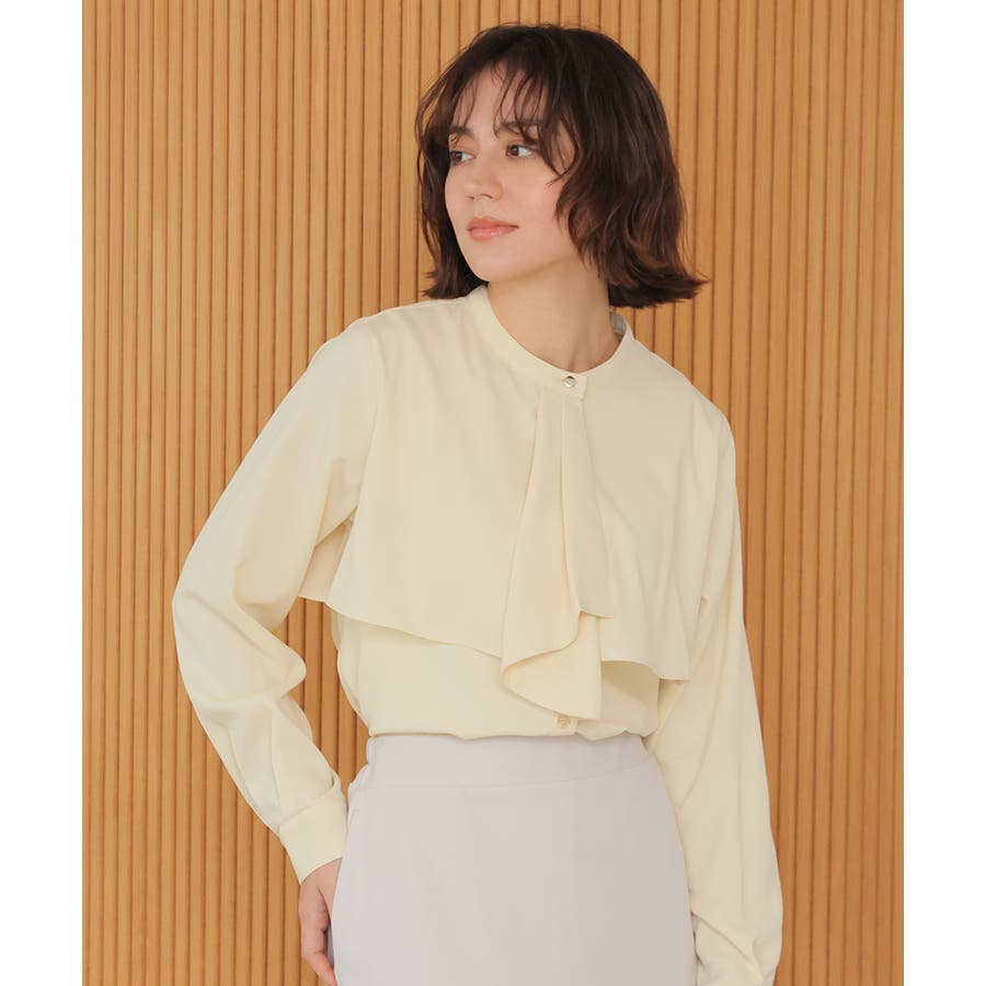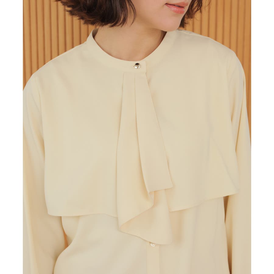 ケープ風の上品なドレープに、リボンを結ぶ必要のないボウタイをプラスしたフェミニンなデザイン。