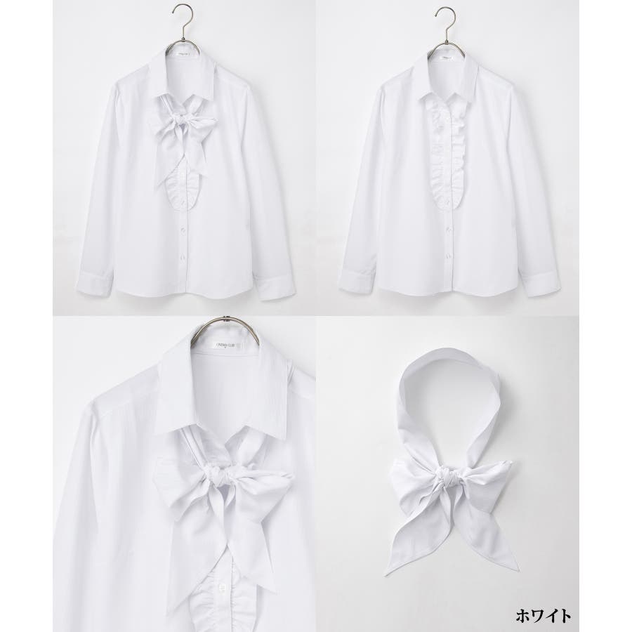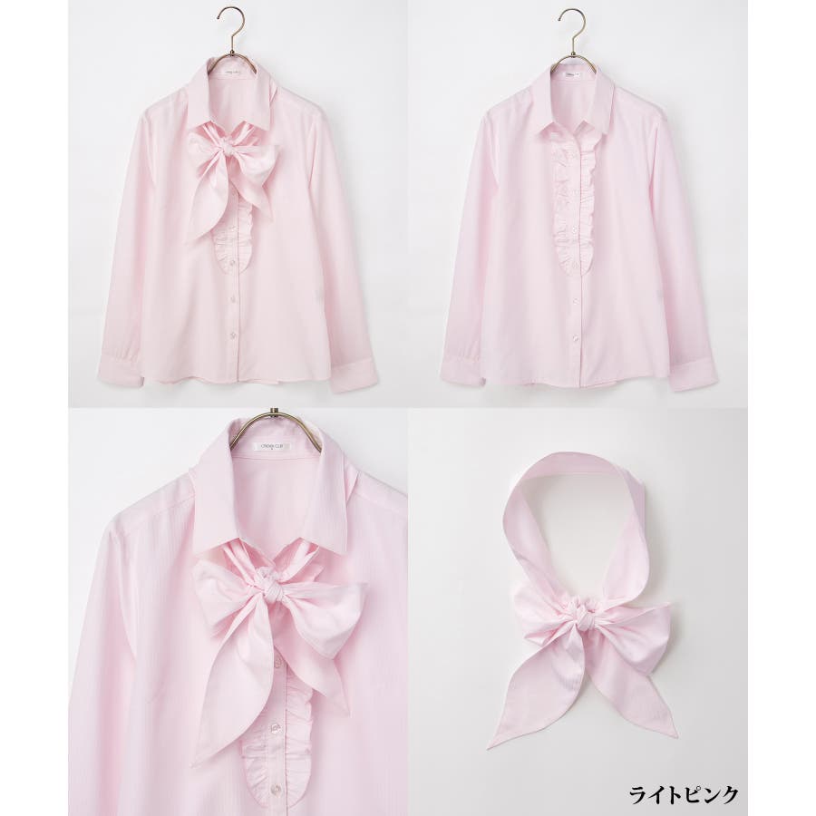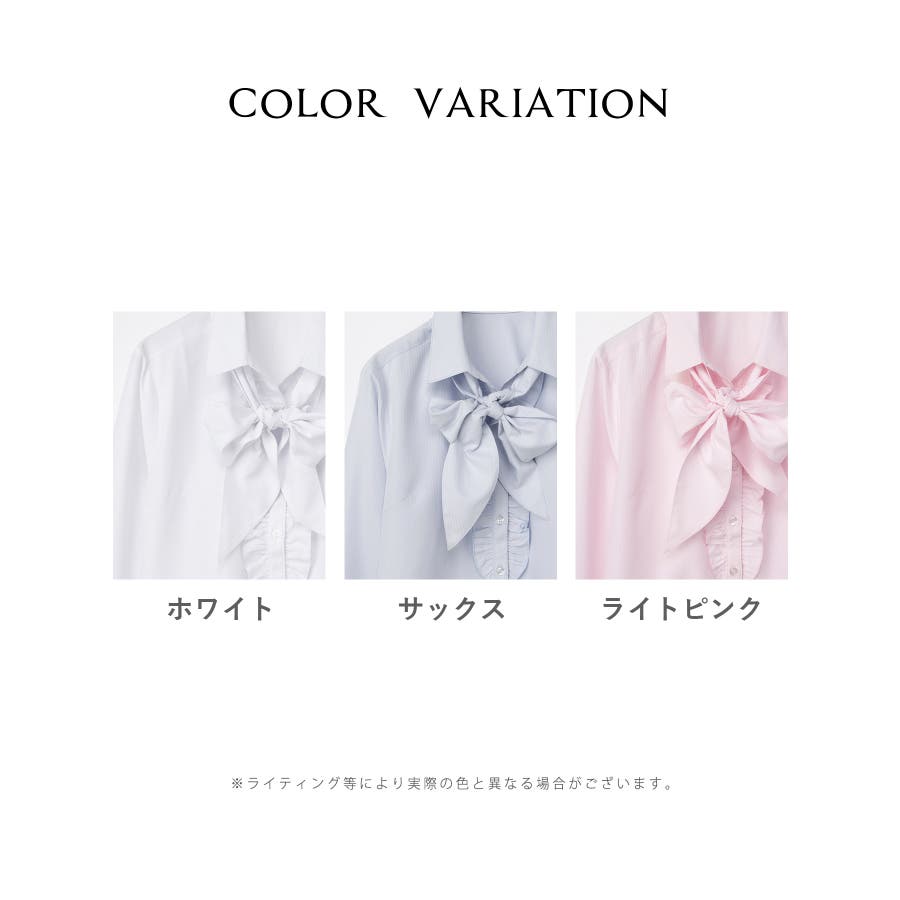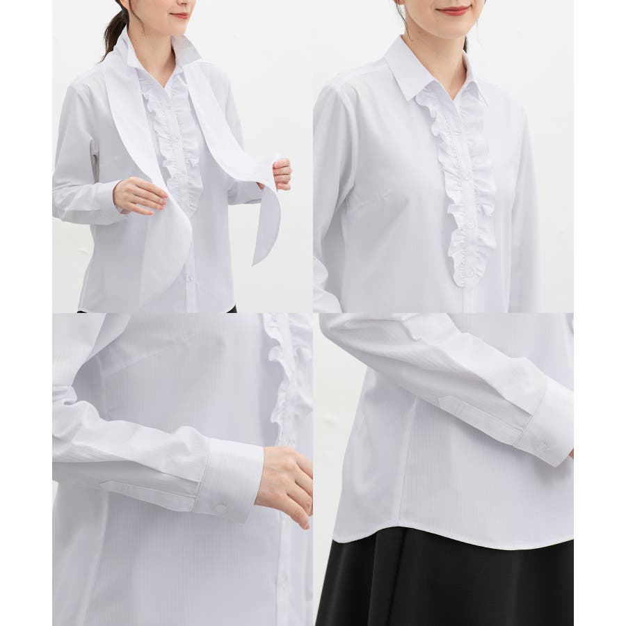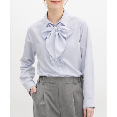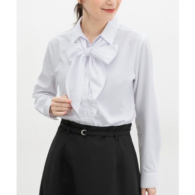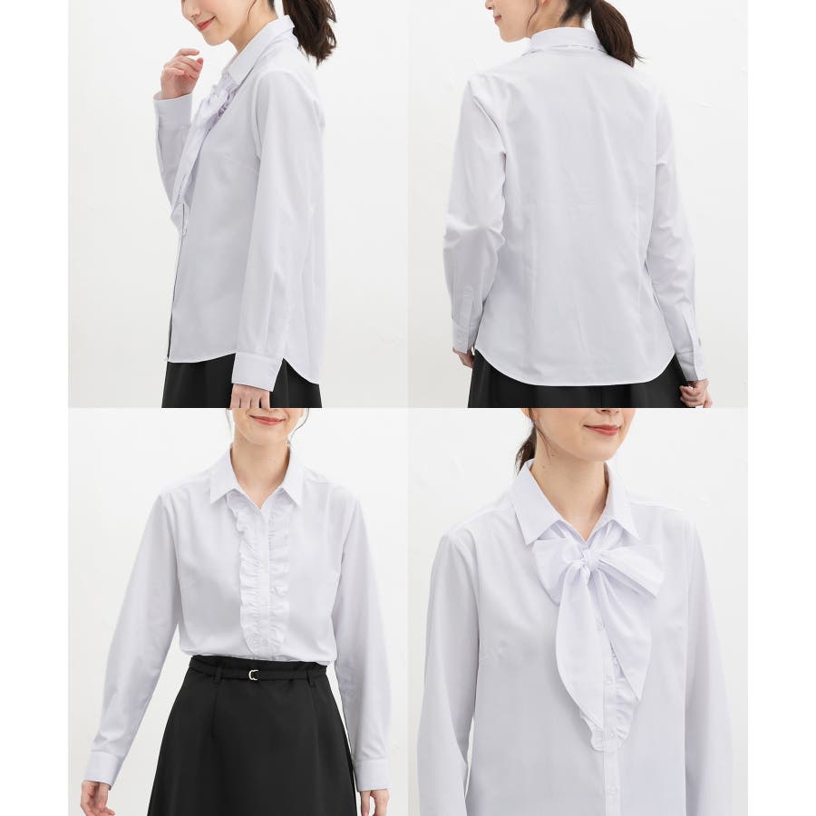 首元がすっきりきれいに見えるベーシックなスキッパーシャツに、前立て部分のフリルと、シーンや気分で取り外し可能なボウタイリボンを付けた、華やかなデザイン。
