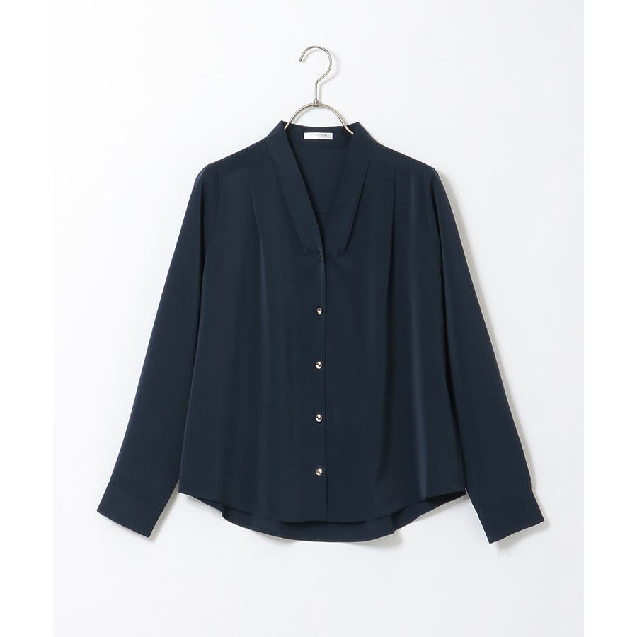 襟の部分、同じようなデザインのものは他にもありますが、これは開き具合がほどよくて依れたりシワになったりせずきちんとした印象です。金ボタンのおかげでアクセサリーがなくてもワンポイントになるし、シンプルすぎずにいいです。