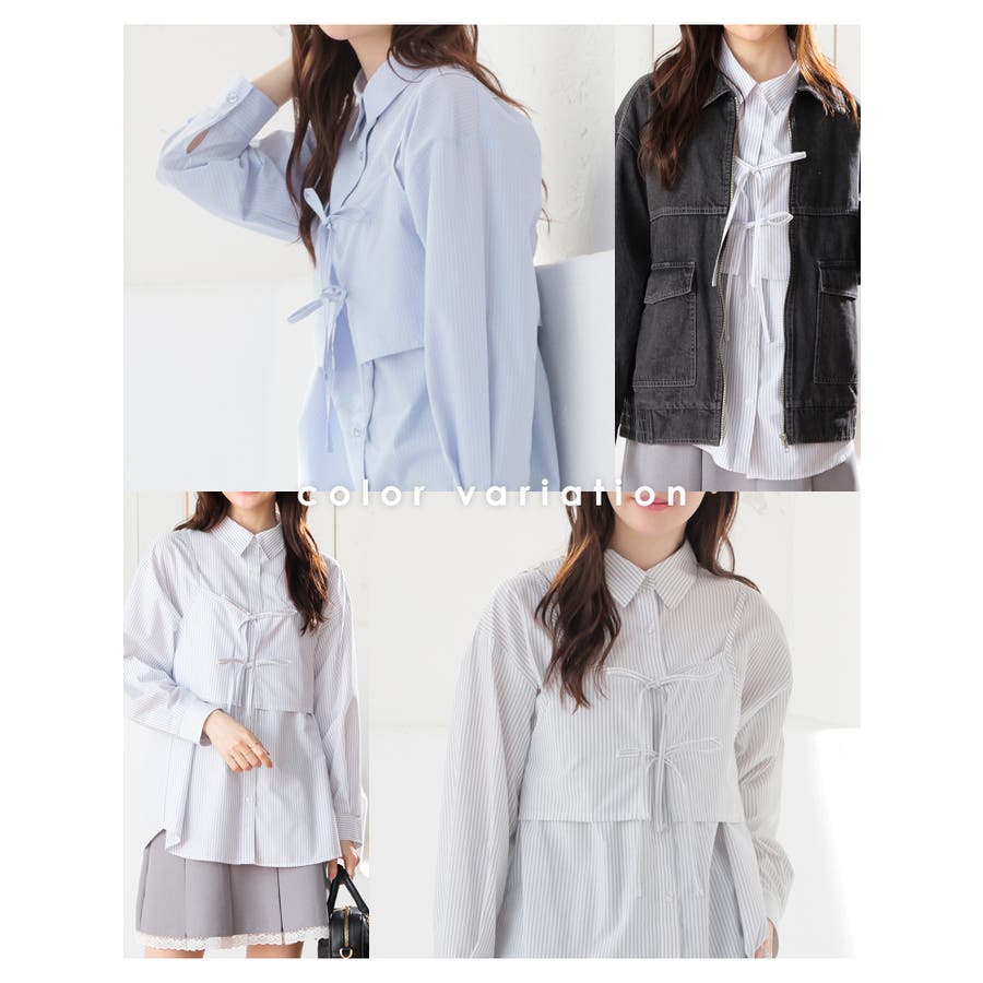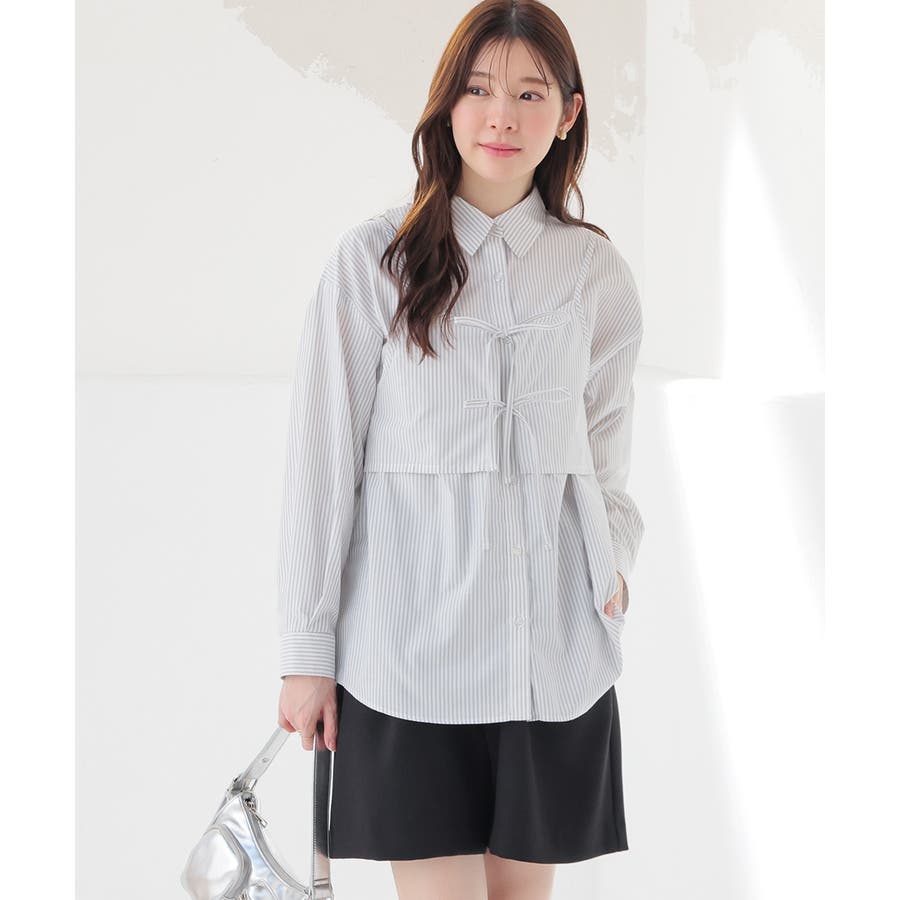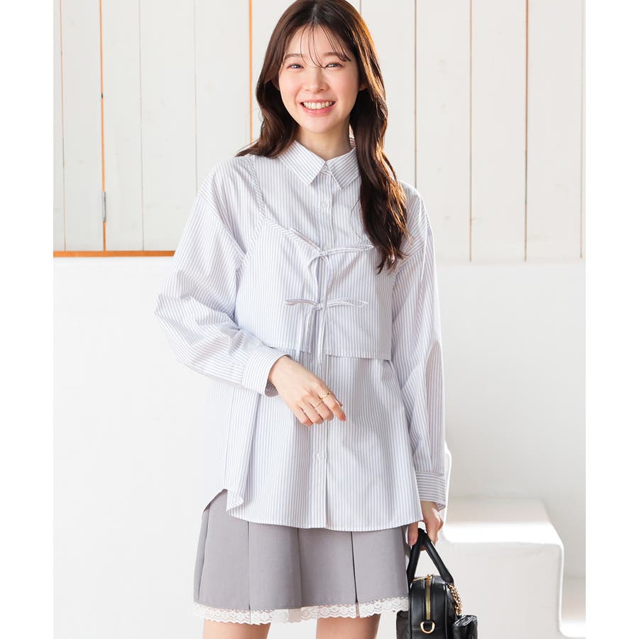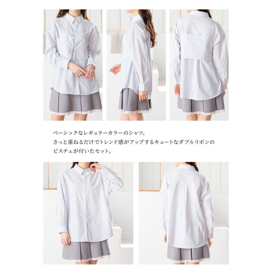 ベーシックなレギュラーカラーのシャツに、さっと重ねるだけでトレンド感がアップするキュートなダブルリボンのビスチェが付いたセット。