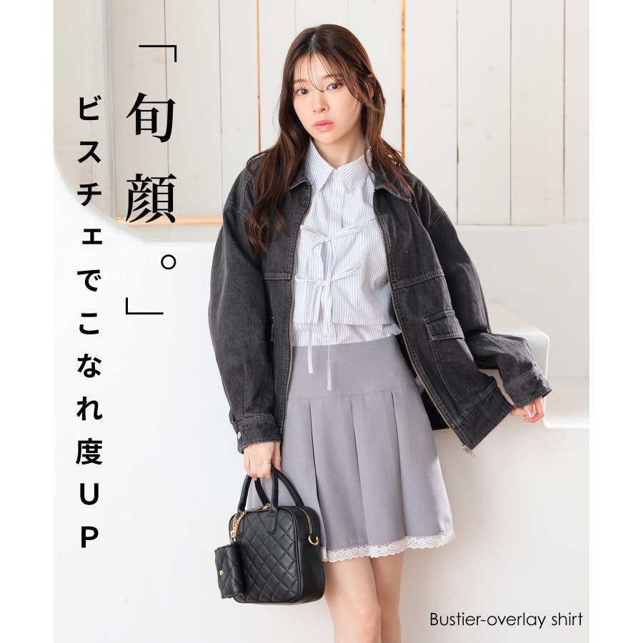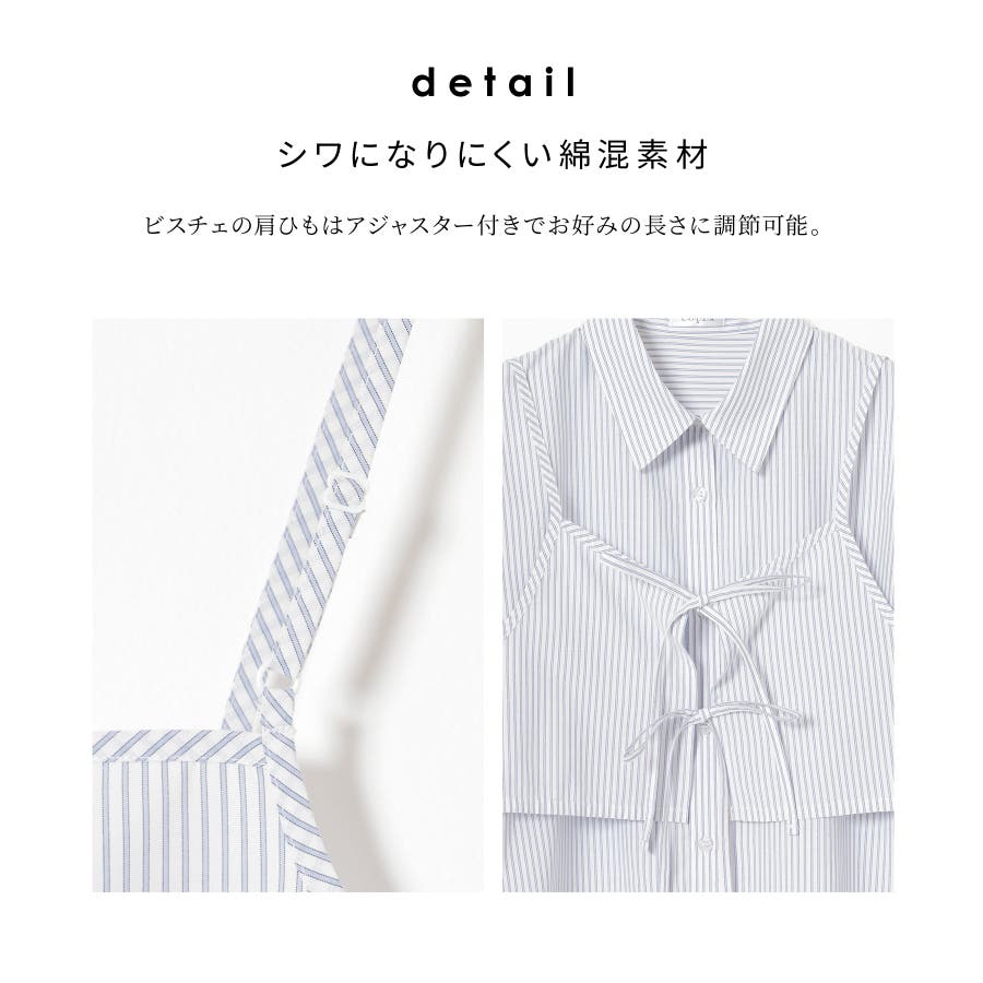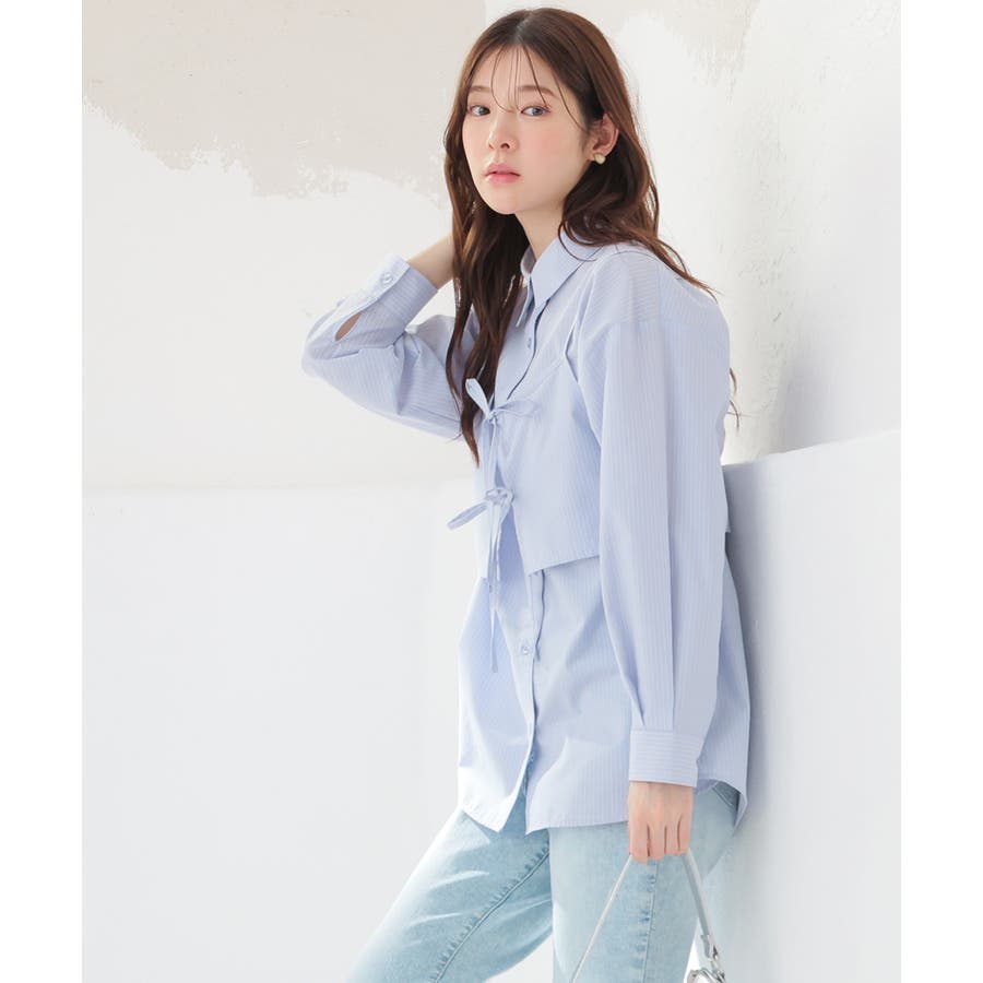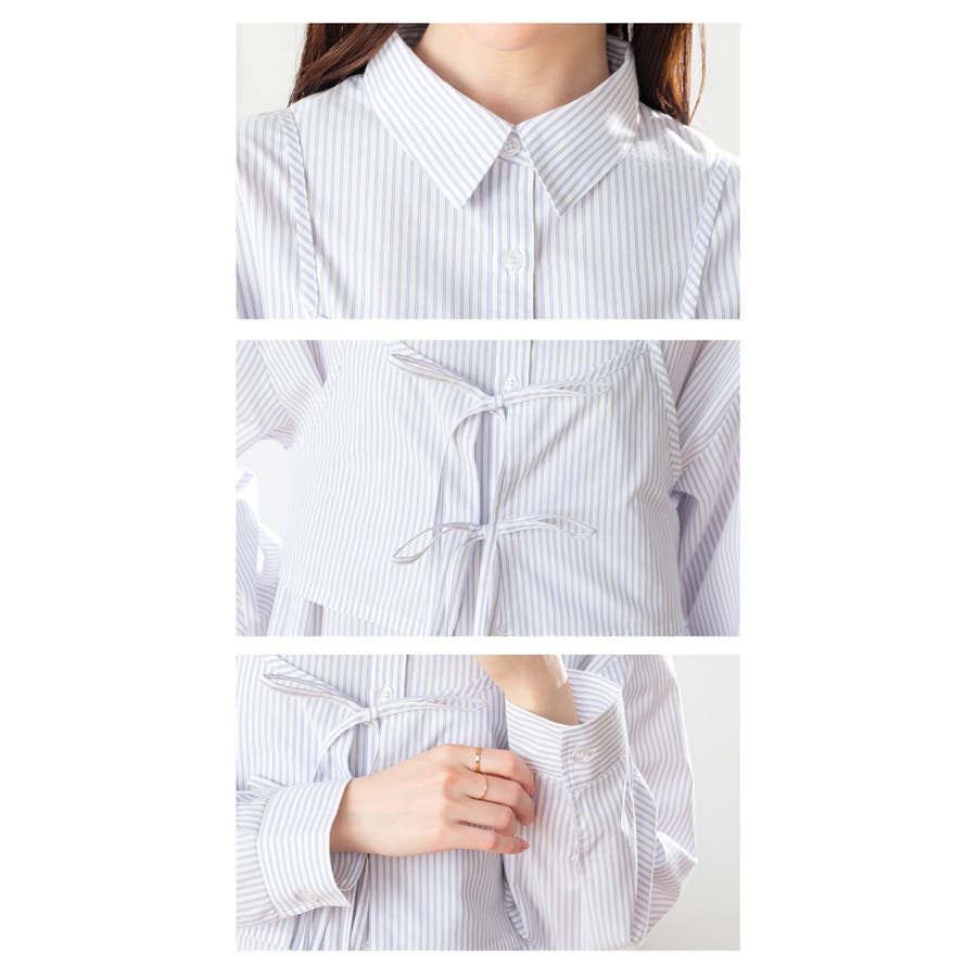 ベーシックなレギュラーカラーのシャツに、さっと重ねるだけでトレンド感がアップするキュートなダブルリボンのビスチェが付いたセット。