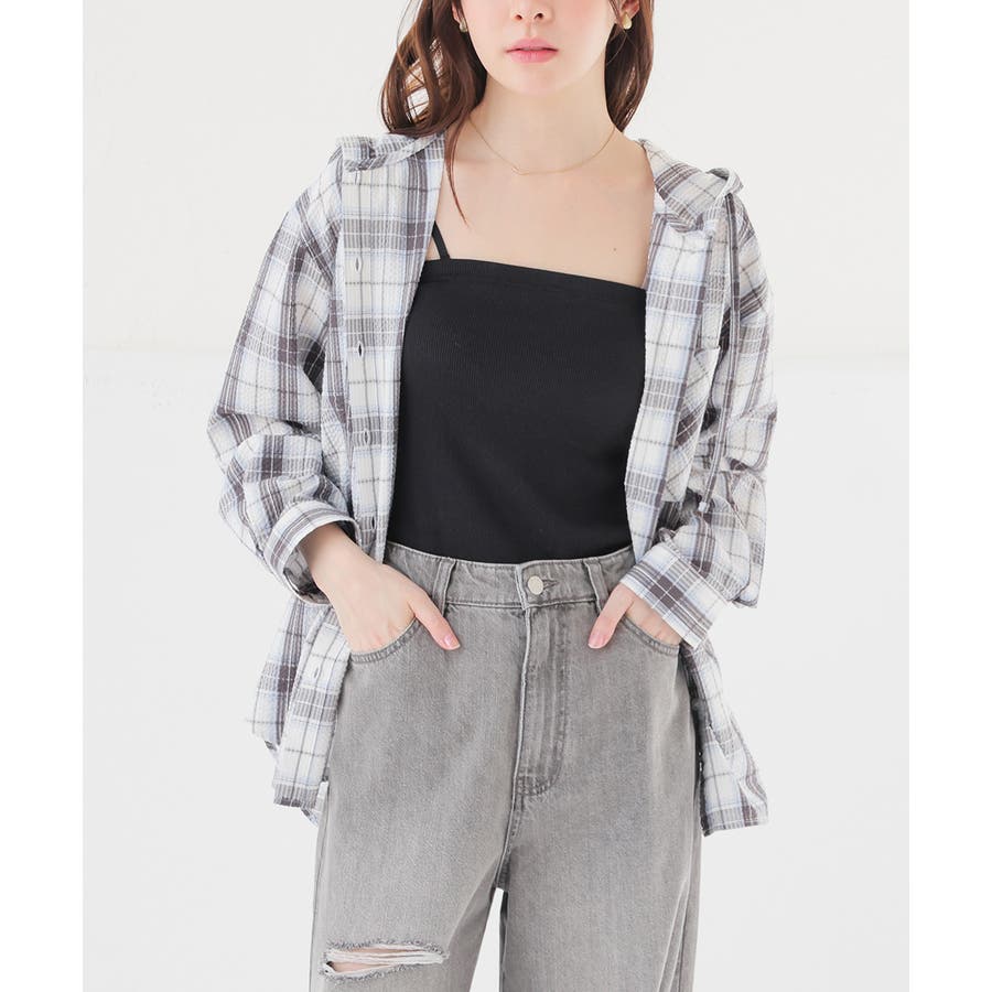 ヒップまですっぽり隠れる丈感のゆったりシャツにフードを付けた、トレンド感たっぷりなデザイン。