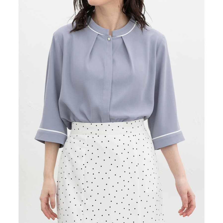 衿ぐり&袖口の配色パイピングと衿元のゴールドボタンが、さりげないアクセントになるシンプルデザイン。
