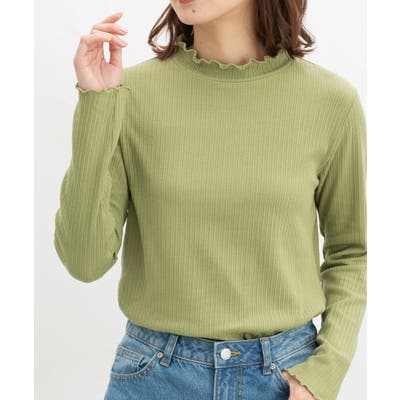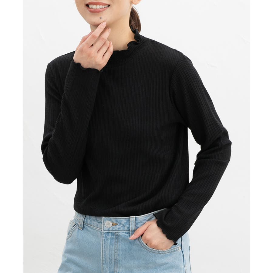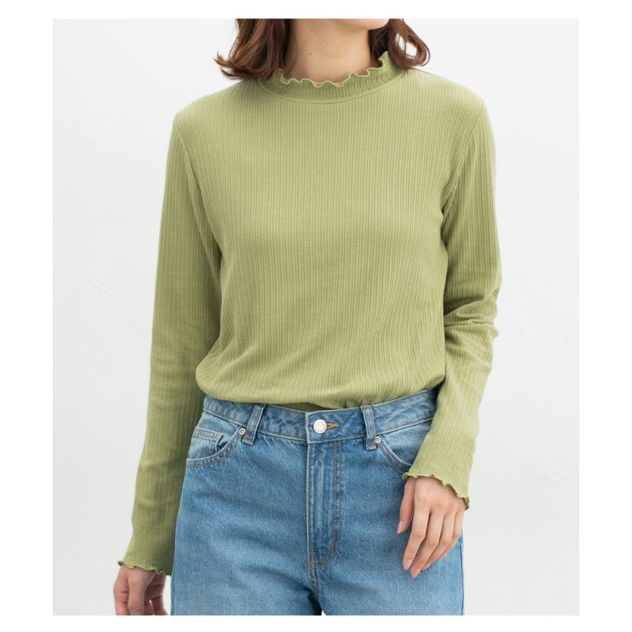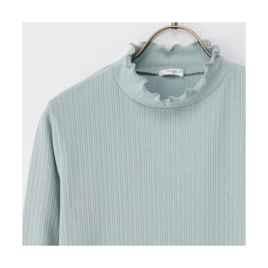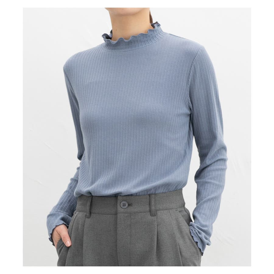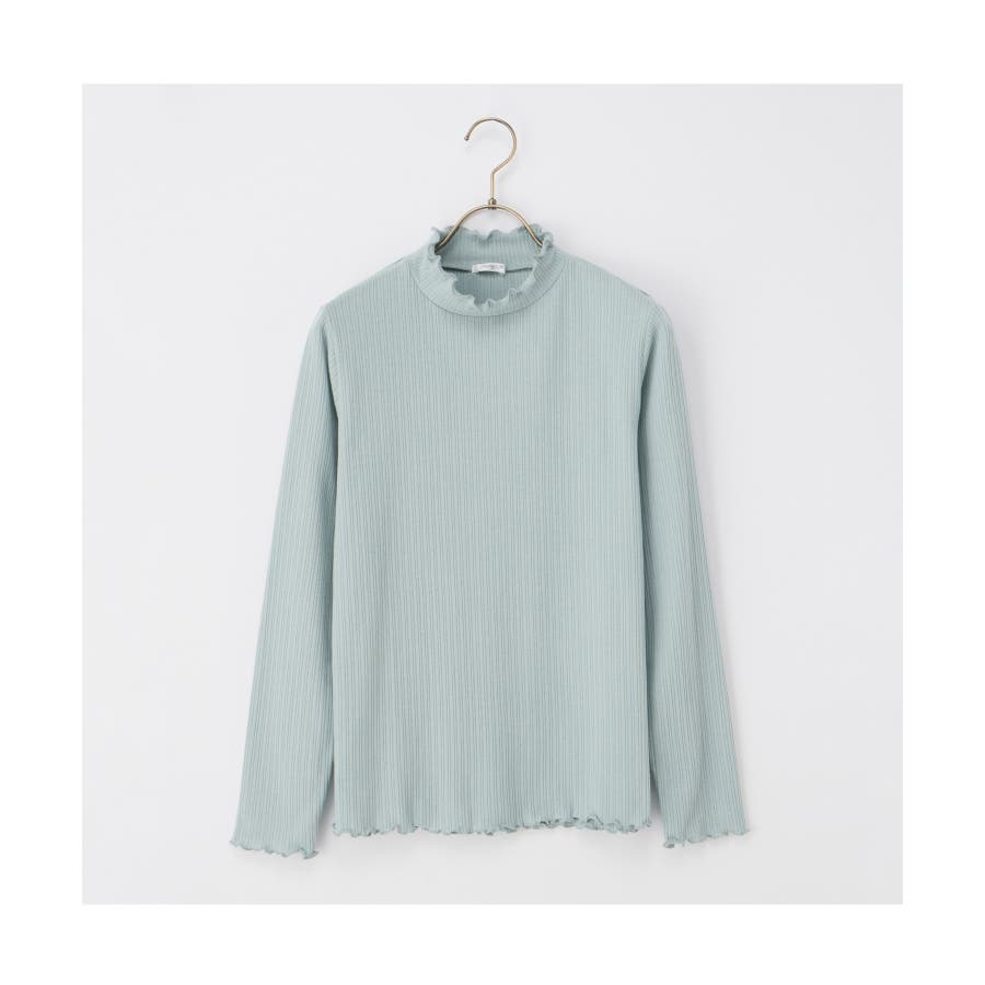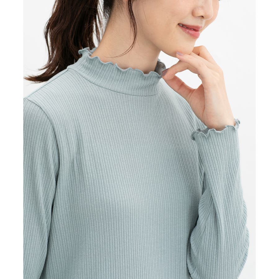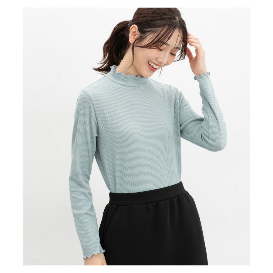 首元を隠してあったかな、程よい高さのプチハイネックに、メロー使いで洒落感もプラスしたフェミニンなデザイン。
