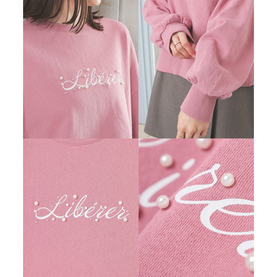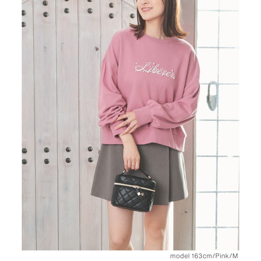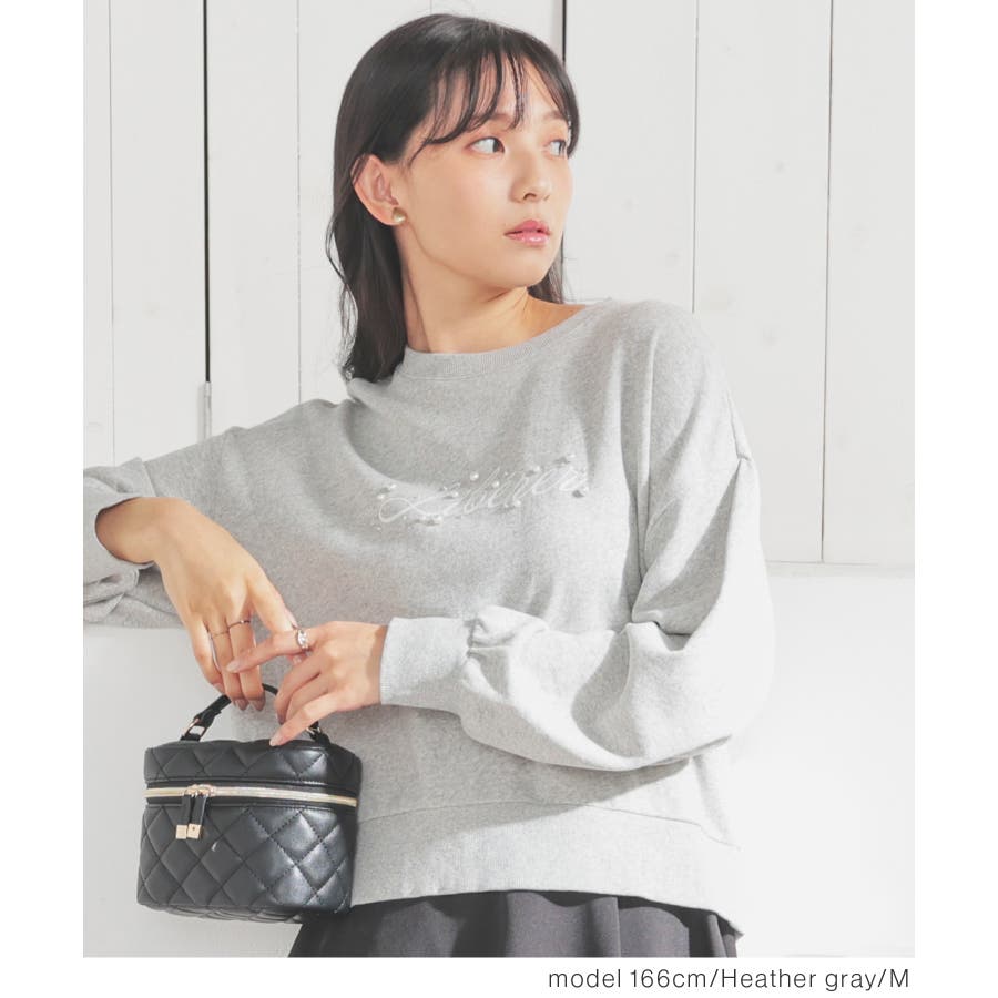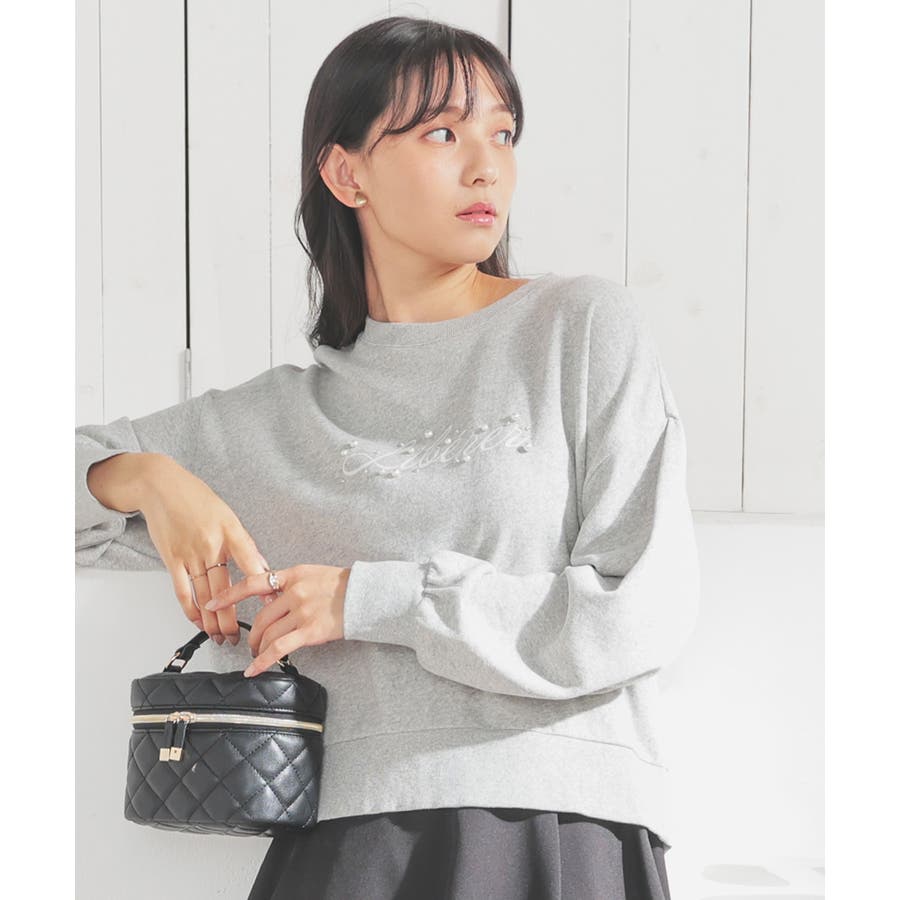 ロゴプリント周りのパール風ビーズとラインストーンの装飾が、大人可愛いデザイン。