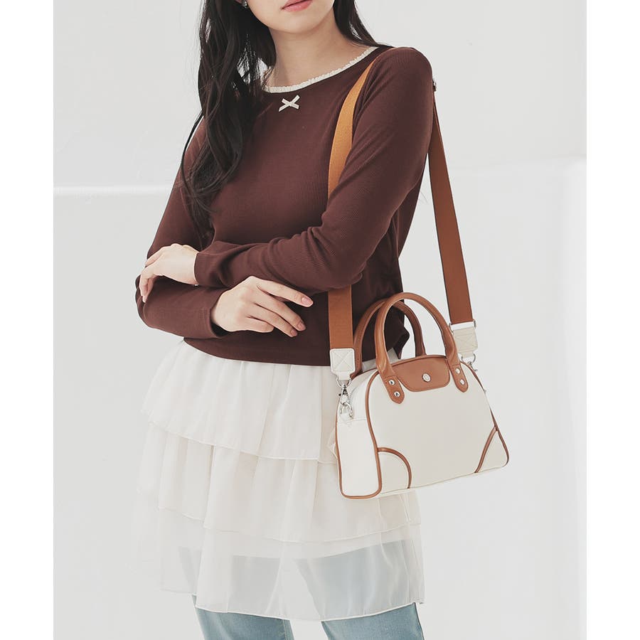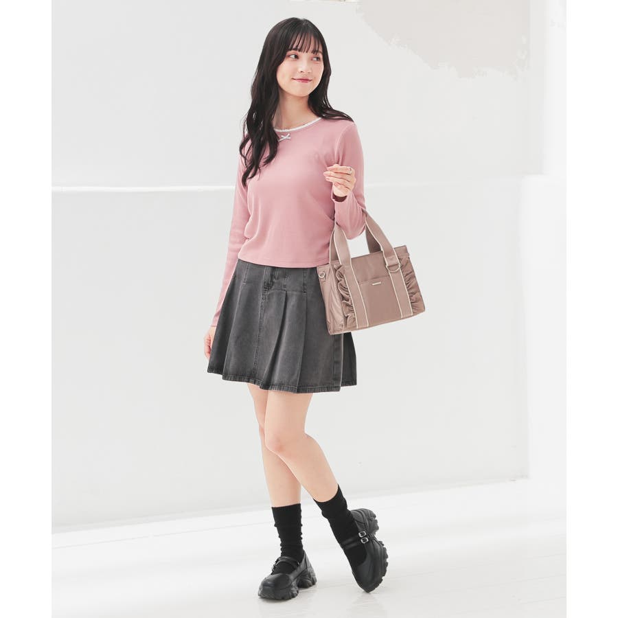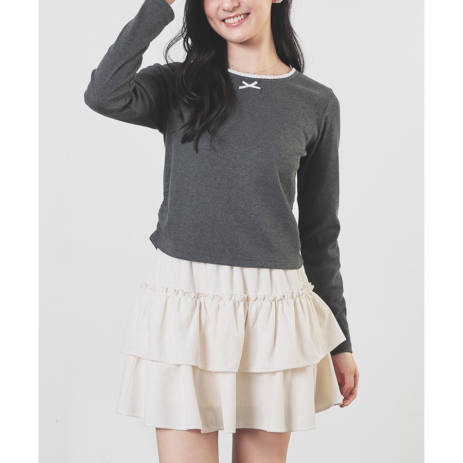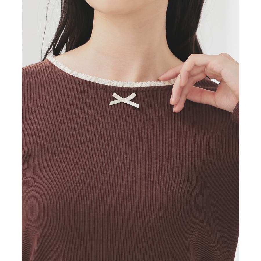 衿ぐりレースと控えめリボンがフェミニンなデザイン。