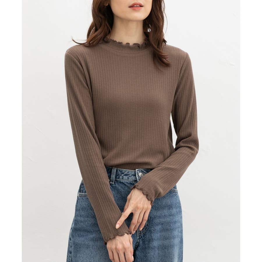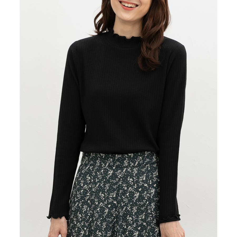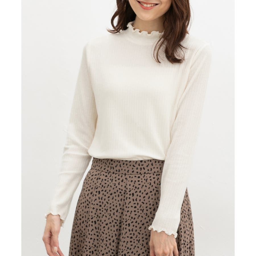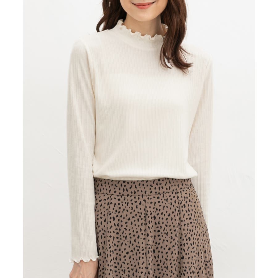 首元を隠してあったかな、程よい高さのプチハイネックに、メロー使いで洒落感もプラスしたフェミニンなデザイン。