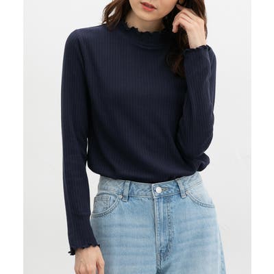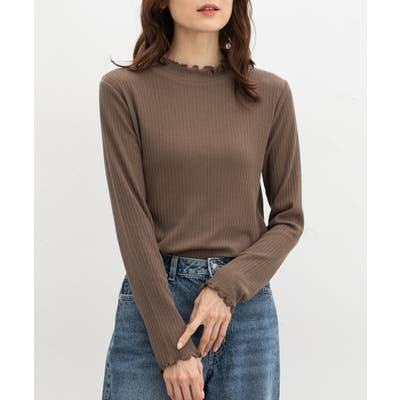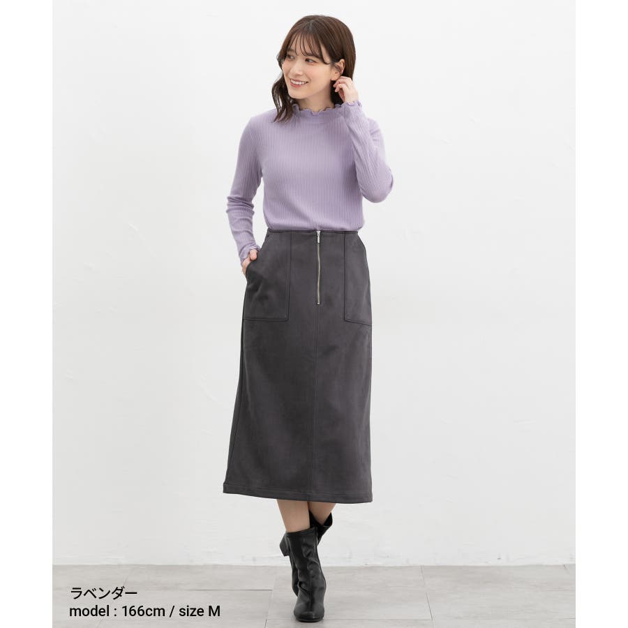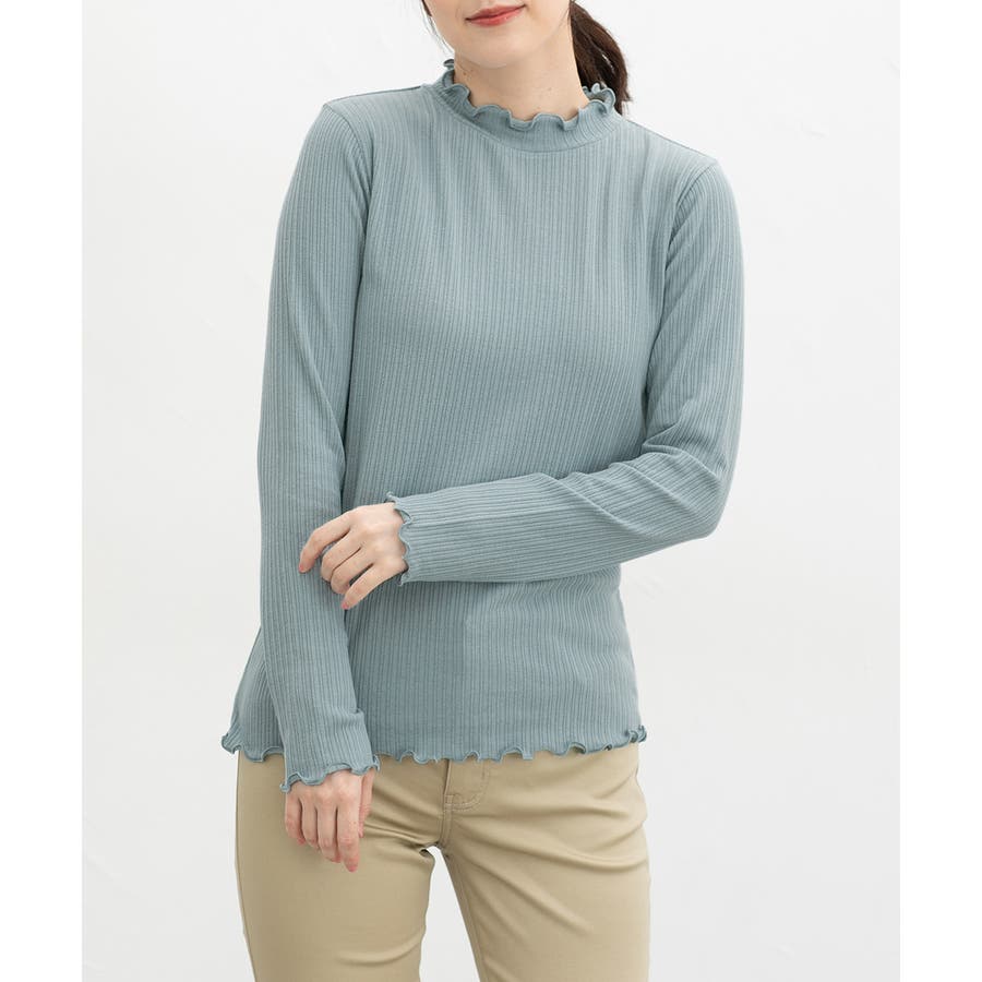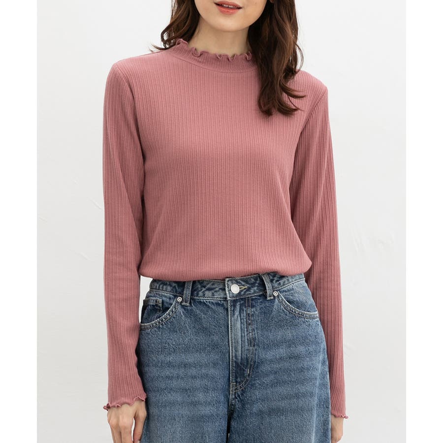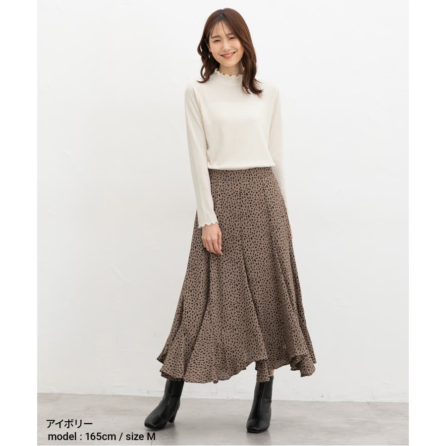 首元を隠してあったかな、程よい高さのプチハイネックに、メロー使いで洒落感もプラスしたフェミニンなデザイン。
