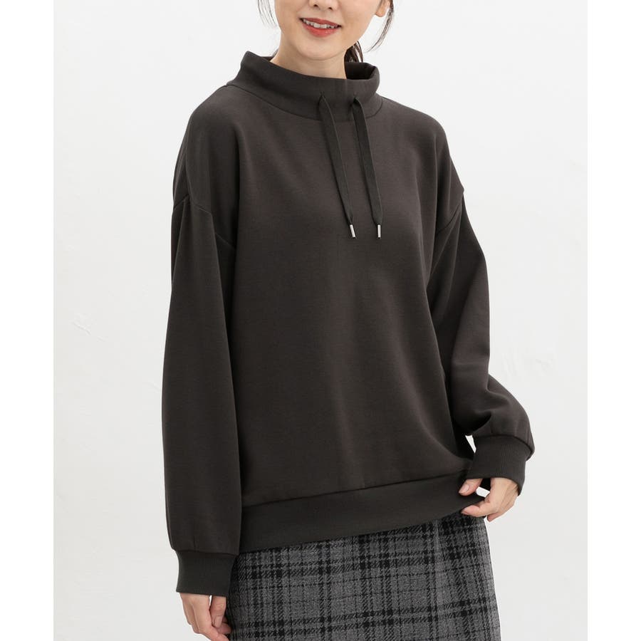 首元まであったかなスタンドネックに、衿元のスピンドルがアクセントになるシンプルデザイン。