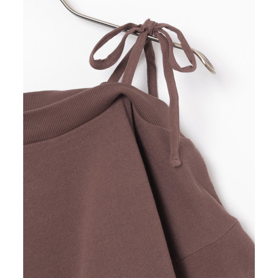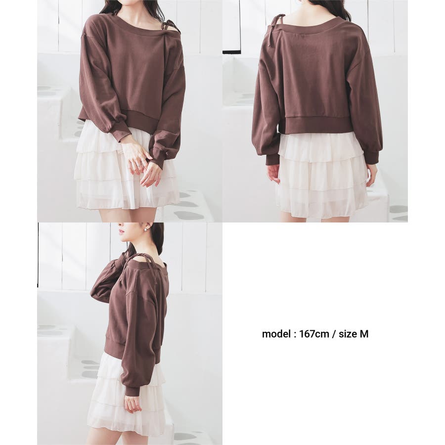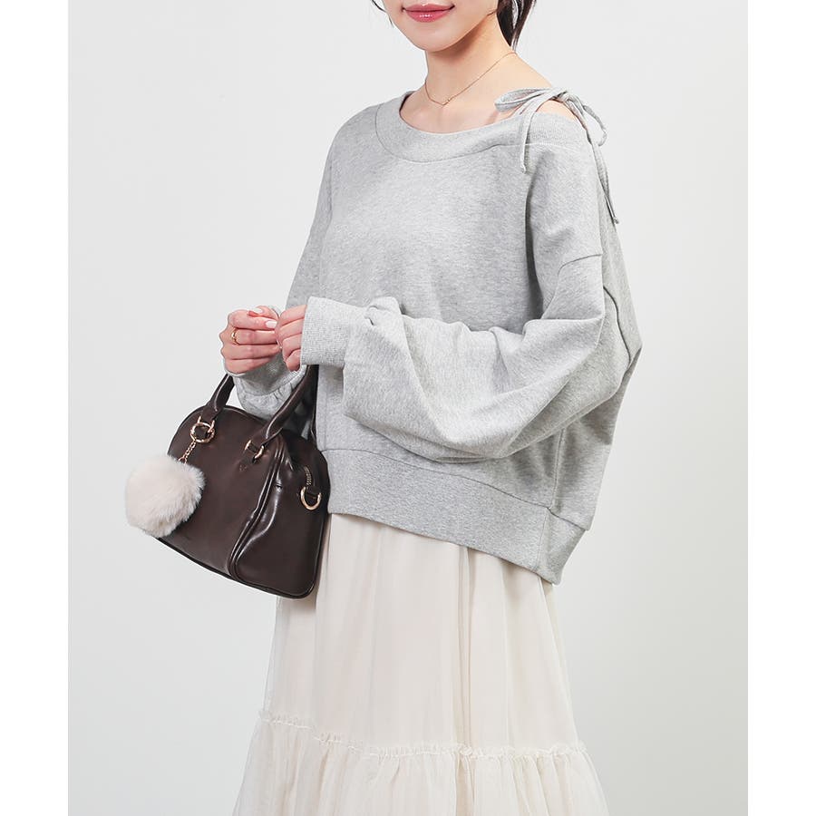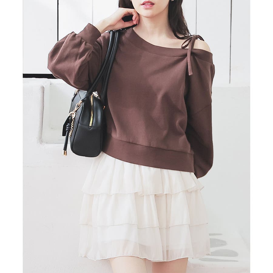 肩を少し落としたオフショルダーにリボンを付けた程よい肌見せで、フェミニンでトレンド感のあるデザイン。