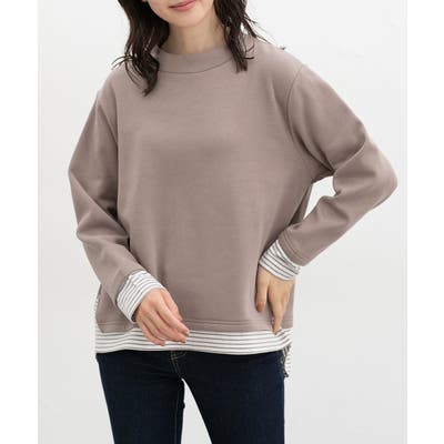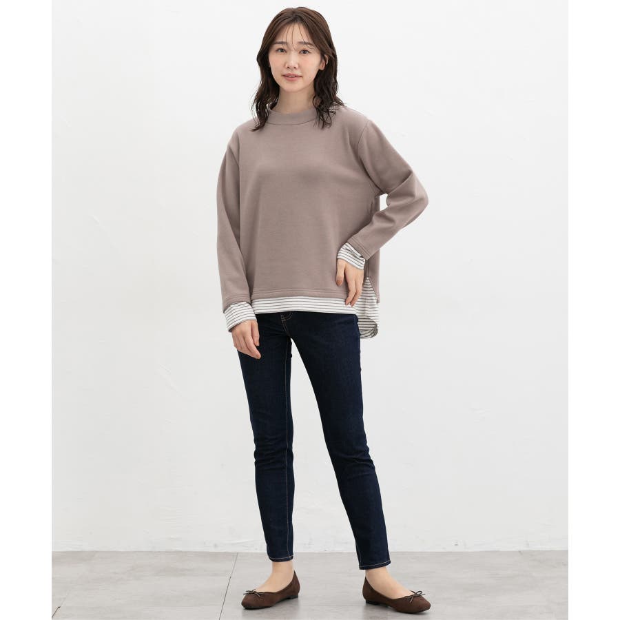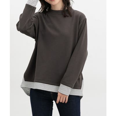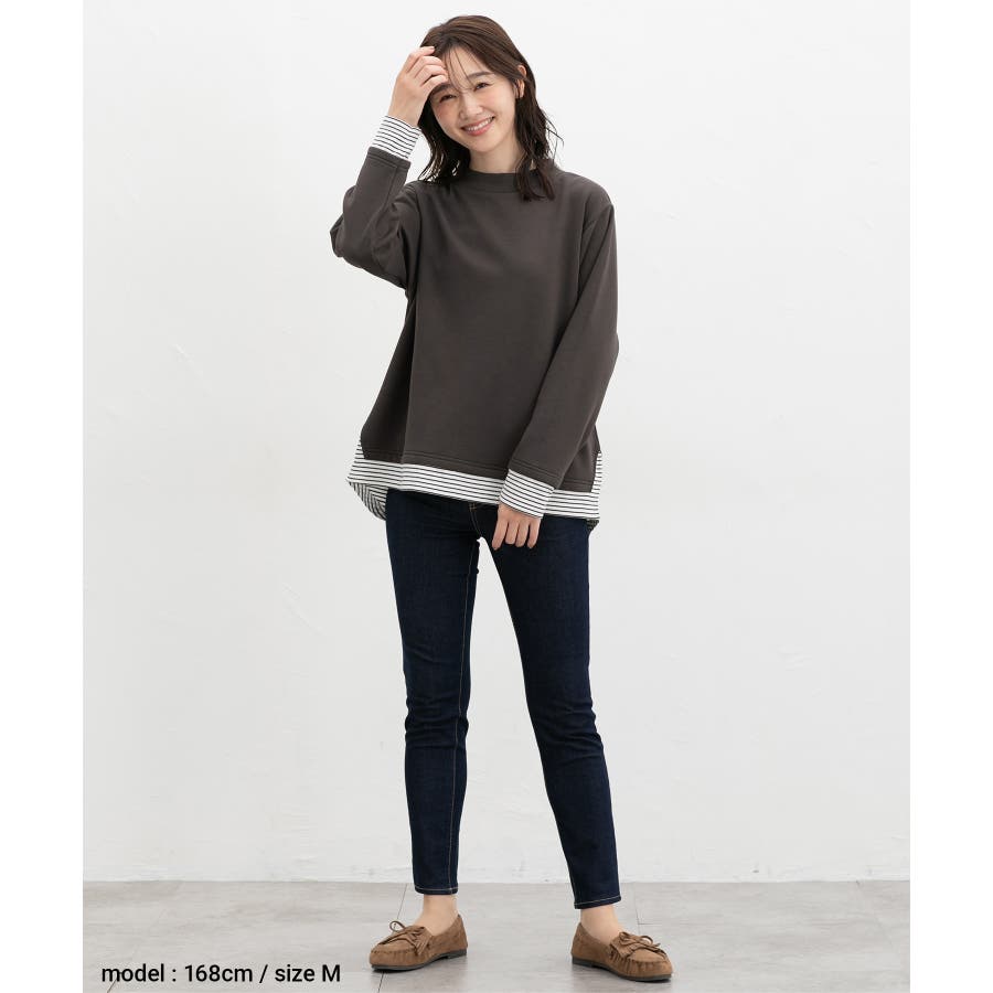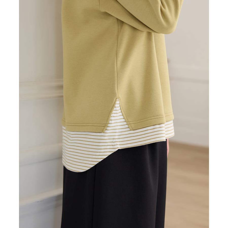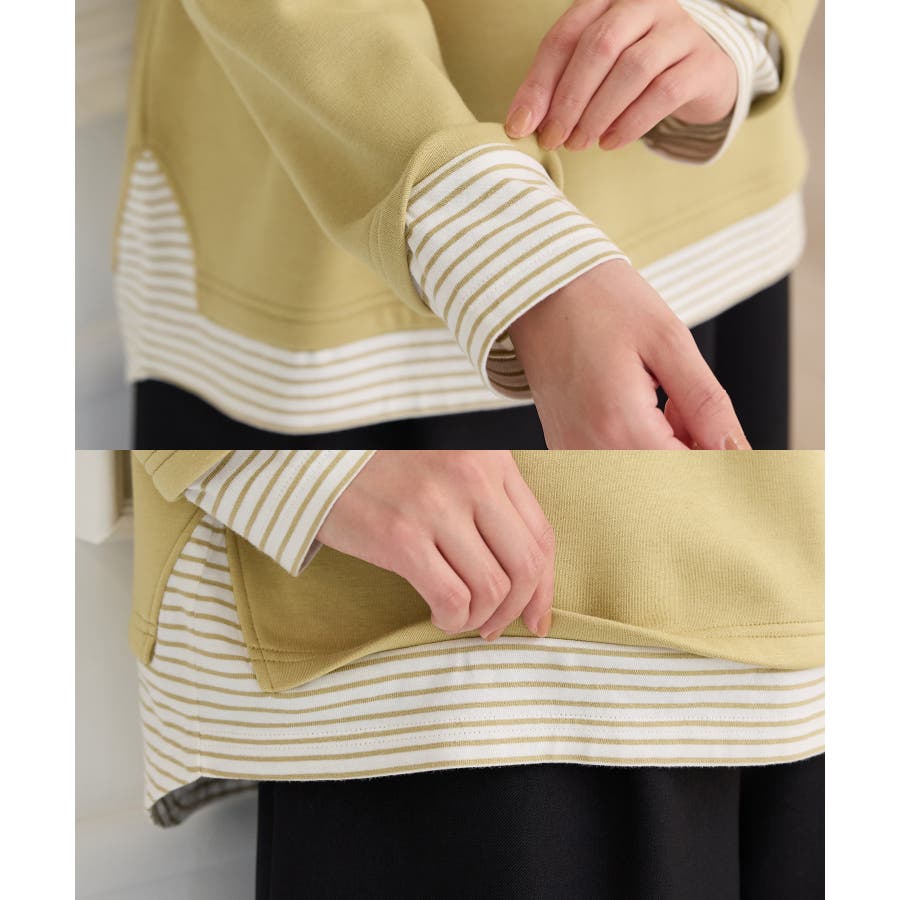 1枚でおしゃれに決まる、裾からボーダーTシャツをのぞかせたようなレイヤード風デザイン。