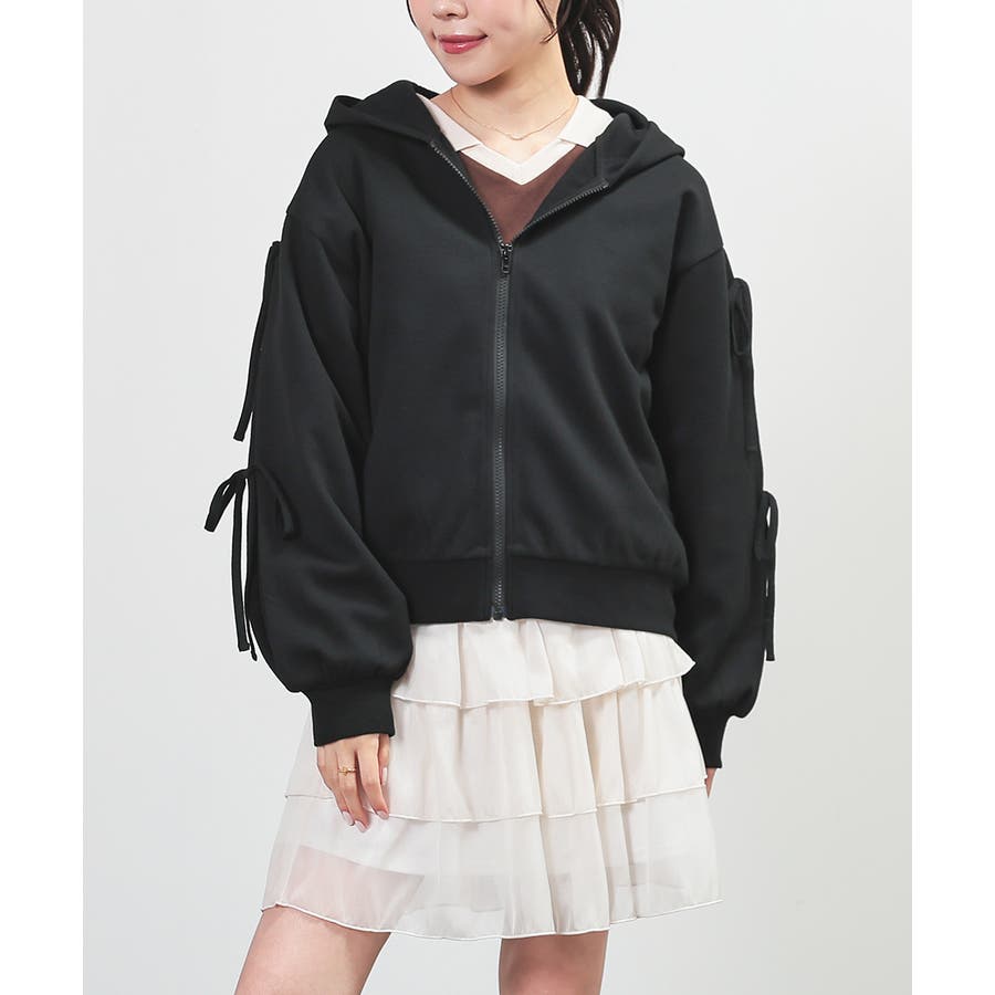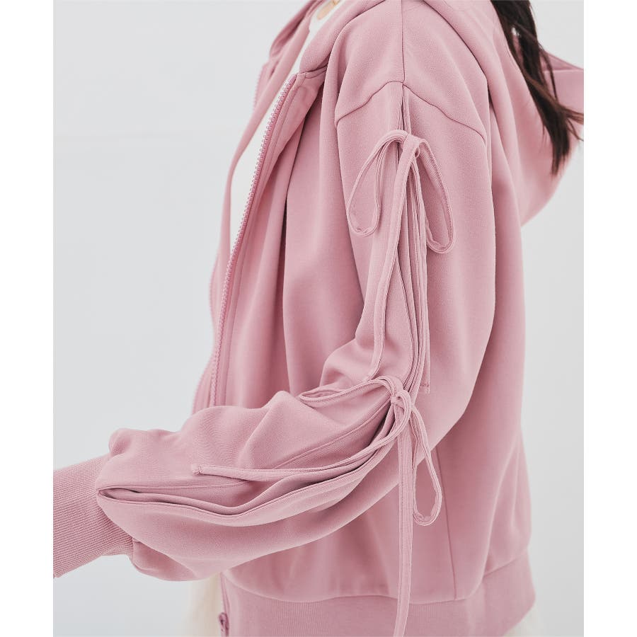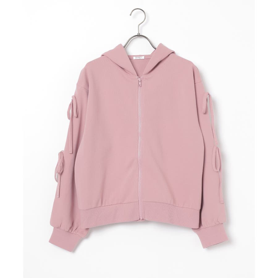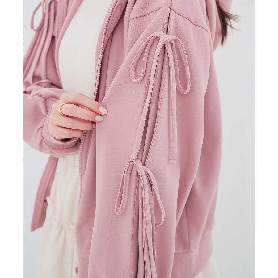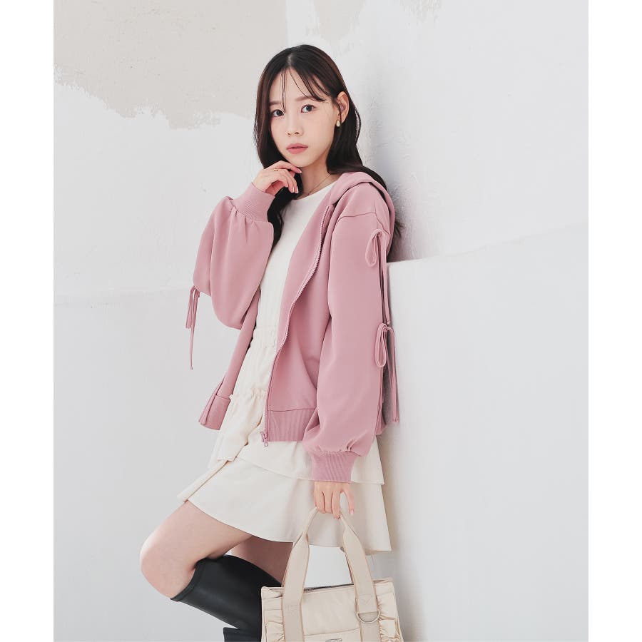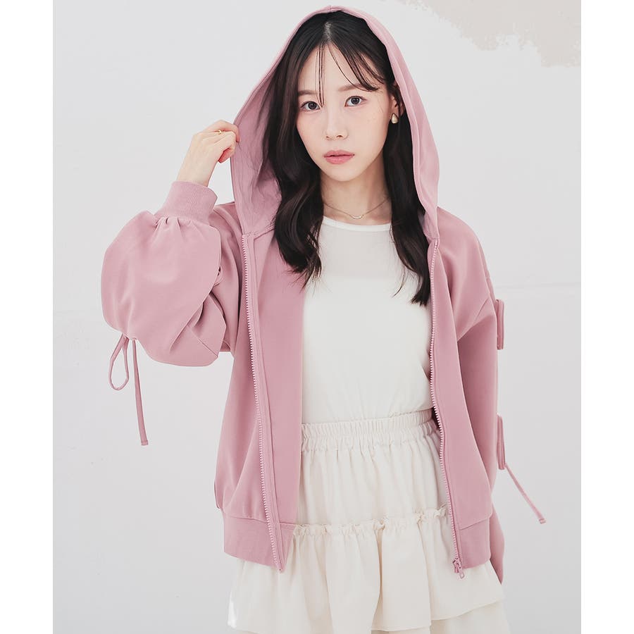 シンプルなジップパーカーの袖に、甘すぎない同色リボンをプラスしたキュートなデザイン。