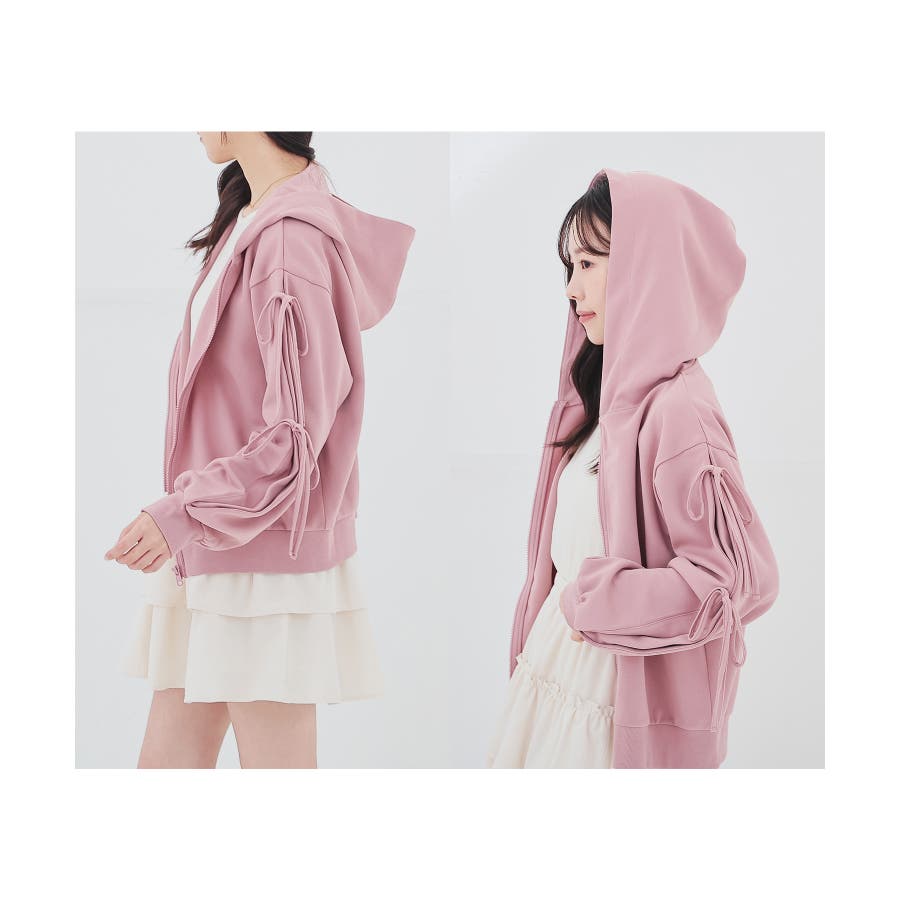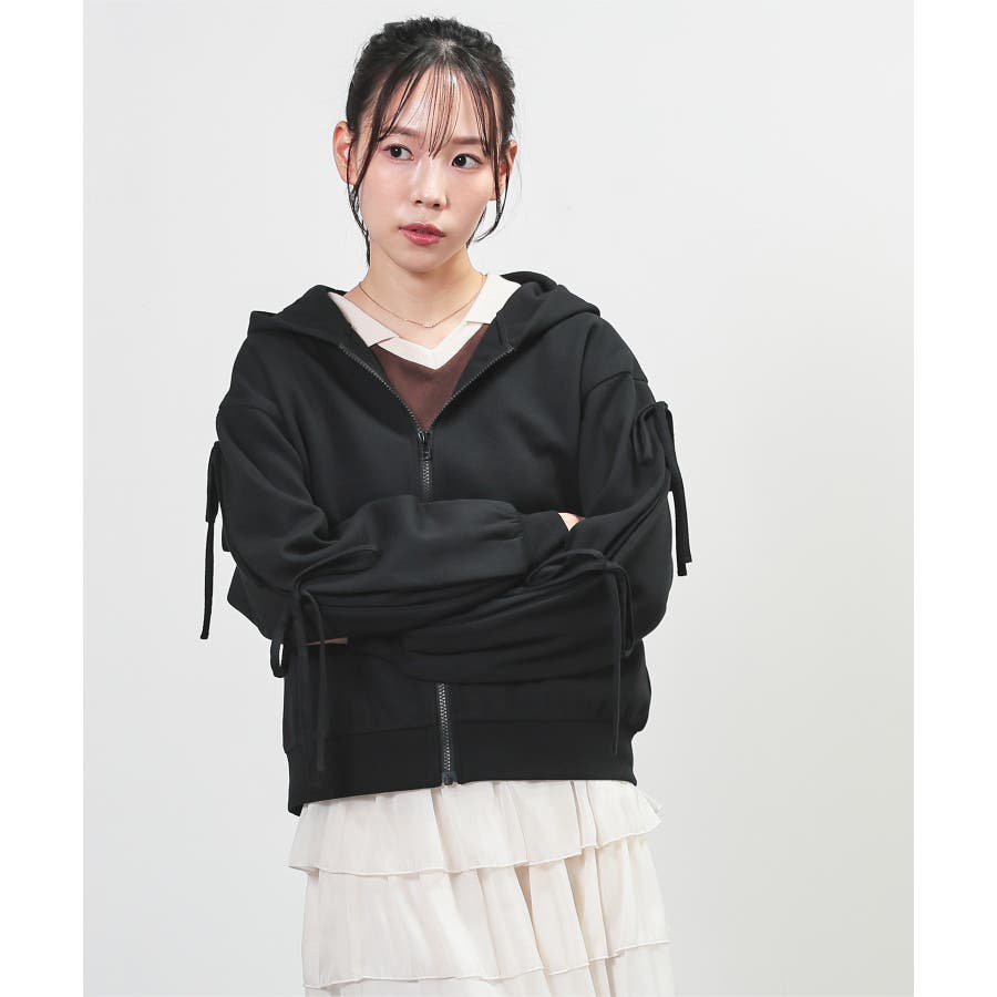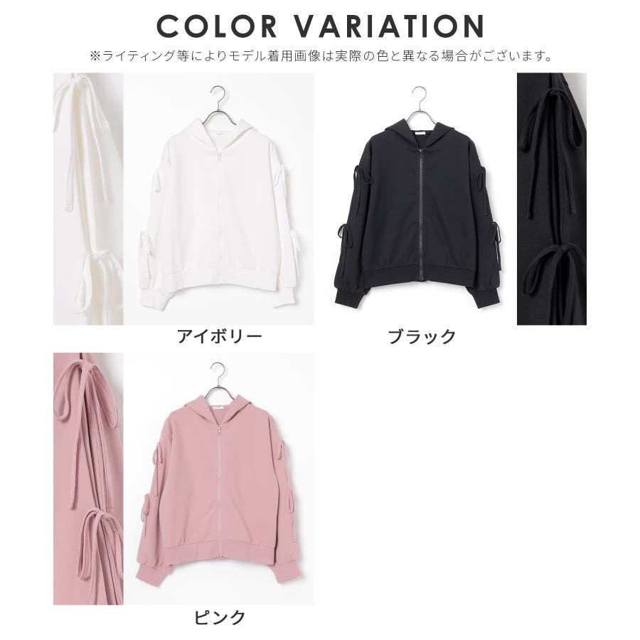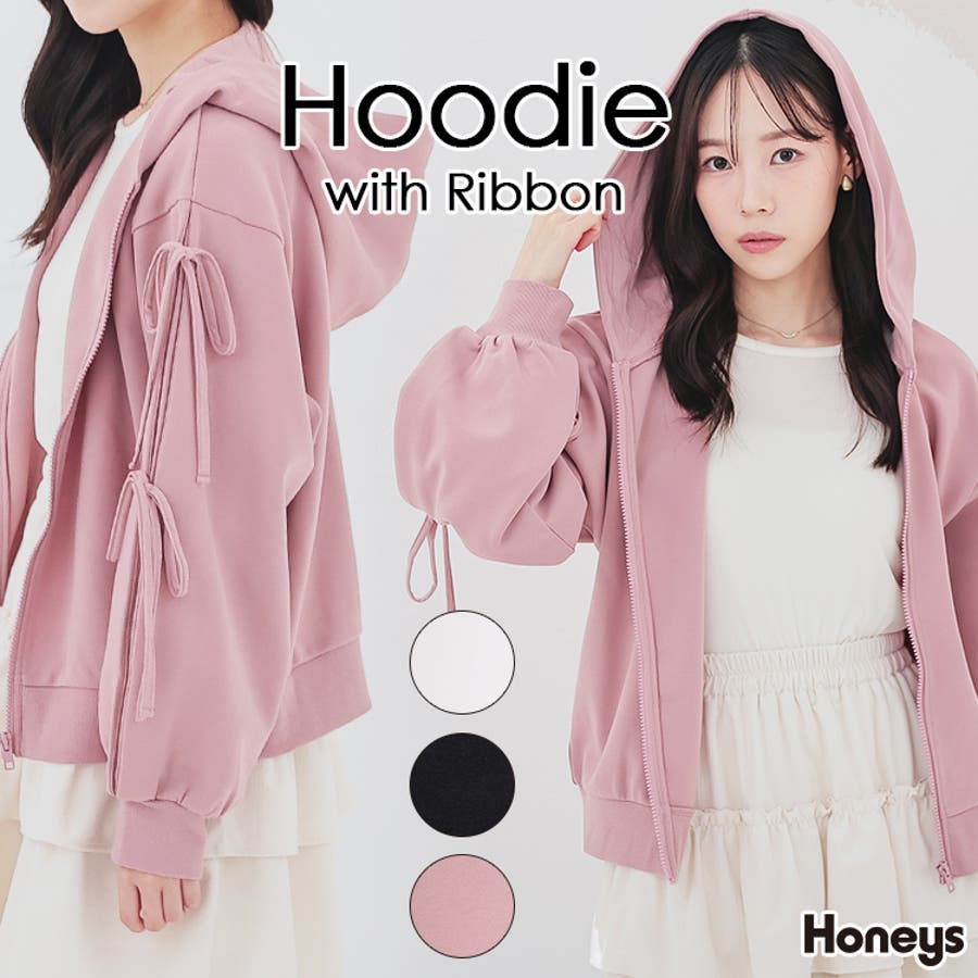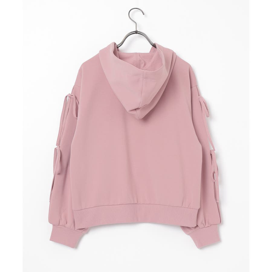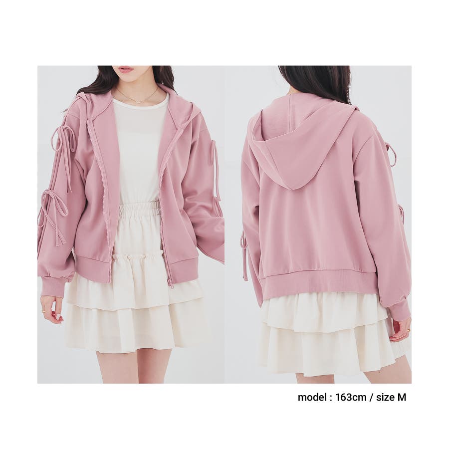 シンプルなジップパーカーの袖に、甘すぎない同色リボンをプラスしたキュートなデザイン。