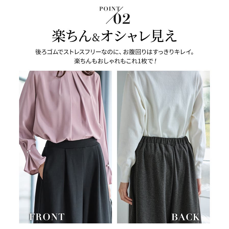 フロントすっきりできれい見えするのにラクチンなウエストゴムデザイン。