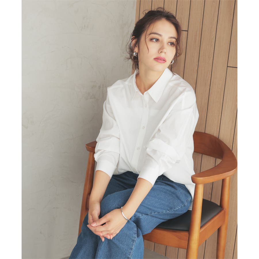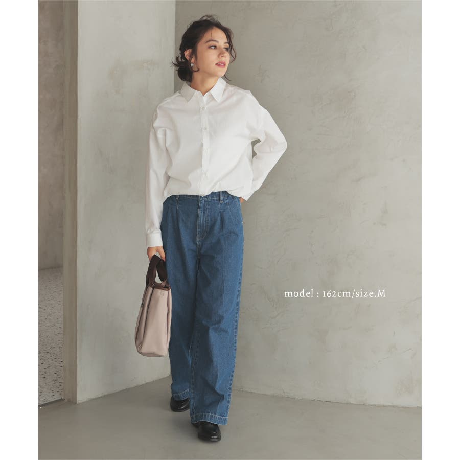 あえてタックインをしてシャツにボリュームを付ければ、トレンドライクな抜き衿のコーデに。