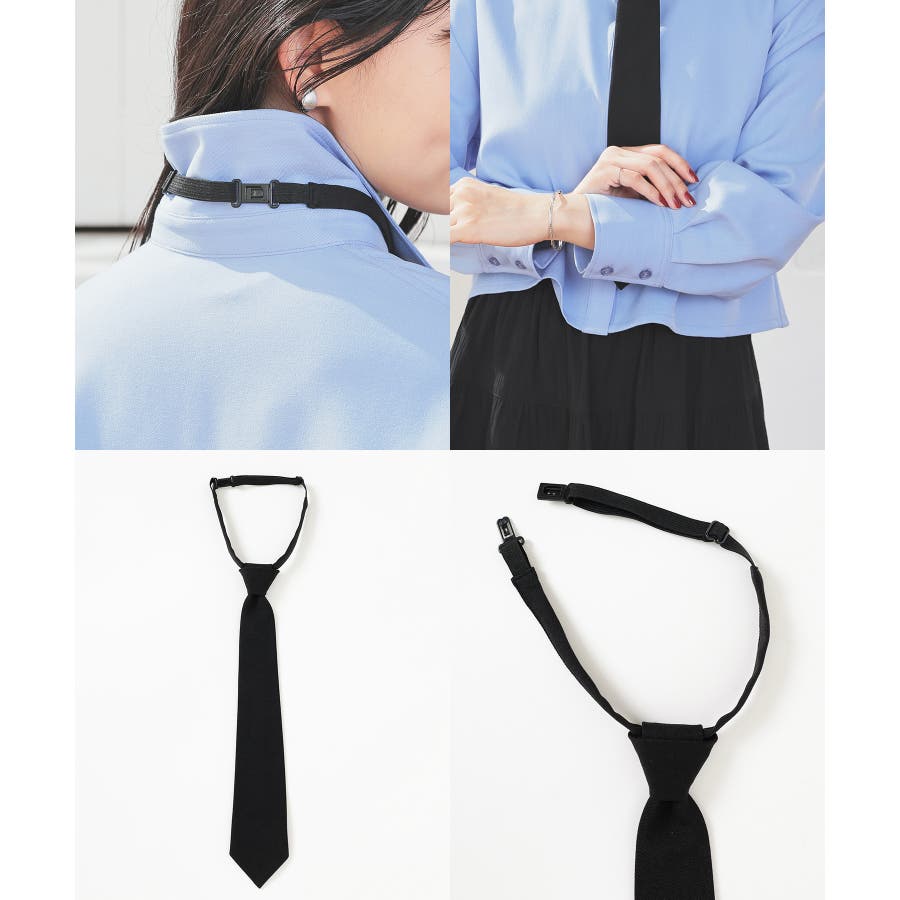ネクタイはワンタッチプラ具で簡単に着け外しできる結び目固定タイプ。