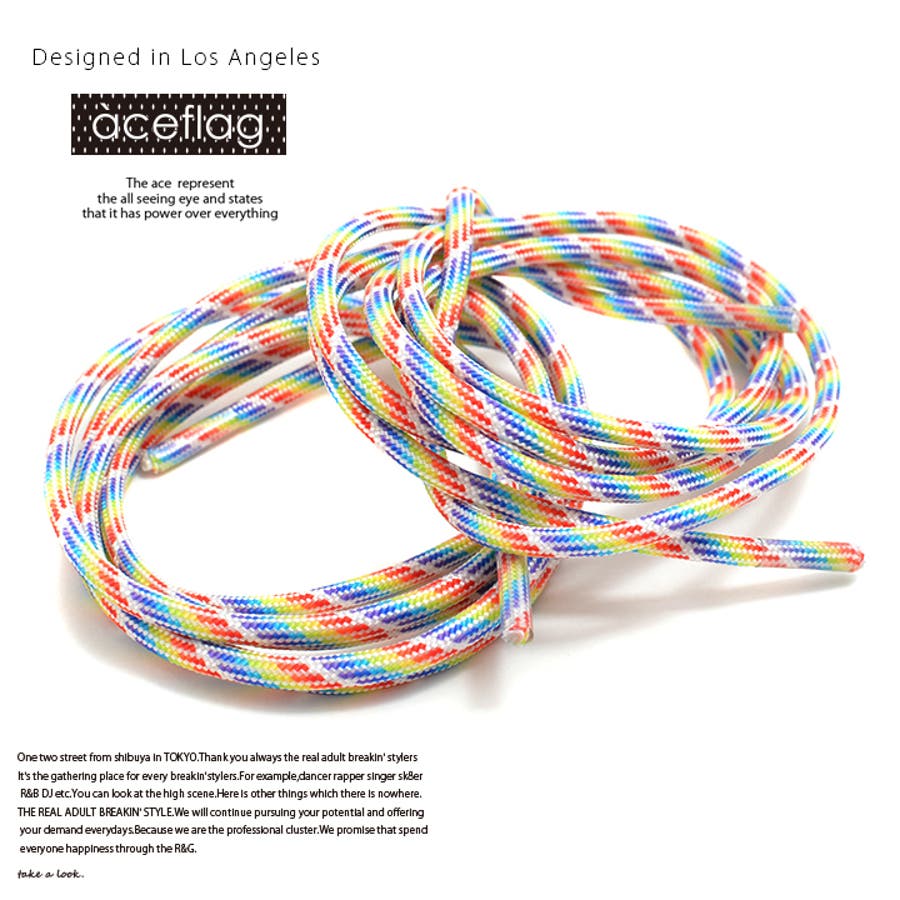 靴ヒモ素材はコシのあるポリエステル100%の丈夫な編み込み素材。紐の先端は塩化ビニール樹脂でしっかりホールド。品質もディティールも安心の仕上がり。白を基調にしたレインボーカラーで、ブーツにもスニーカーにも取り付け可能。他では手に入らないACE-FLAGのオリジナルカラーなので、お気に入りの色があれば速攻ゲット。靴ひもを変えるだけで全く別のイメージになる運動靴、バッシュ、スニーカー、ブーツ、シューズ。靴ひものデザインやカラーを変えるだけで、お気に入りのスニーカーを「簡単に」イメチェンしたり、「個性的に」カスタムアップできます。さりげない部分にまでこだわって、B系HIP HOP系 ダンス ストリート系 ファッションの完成度を極限までUP。