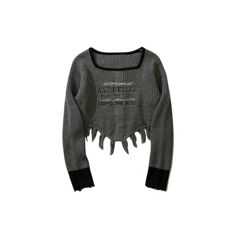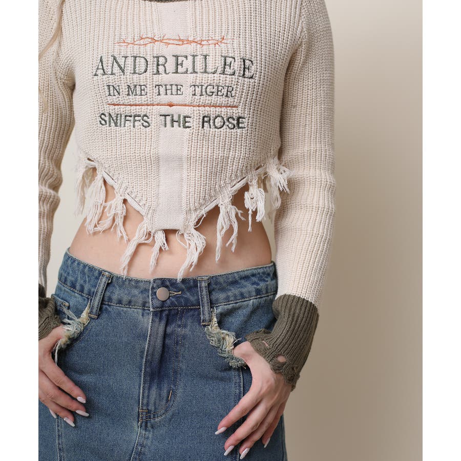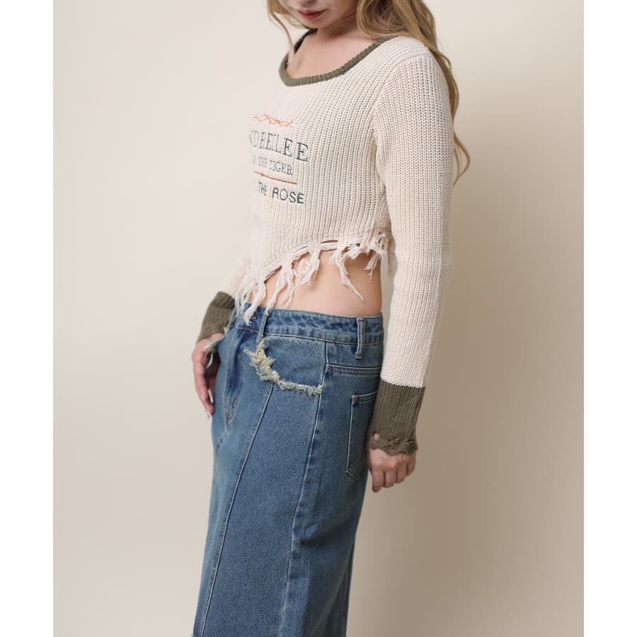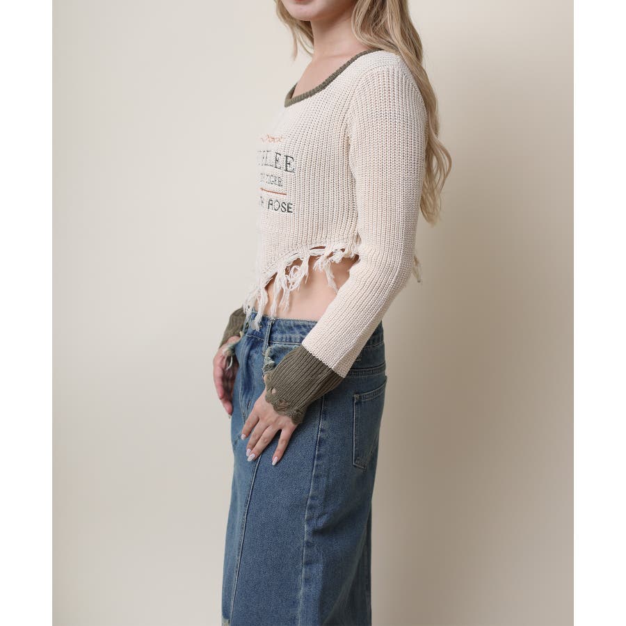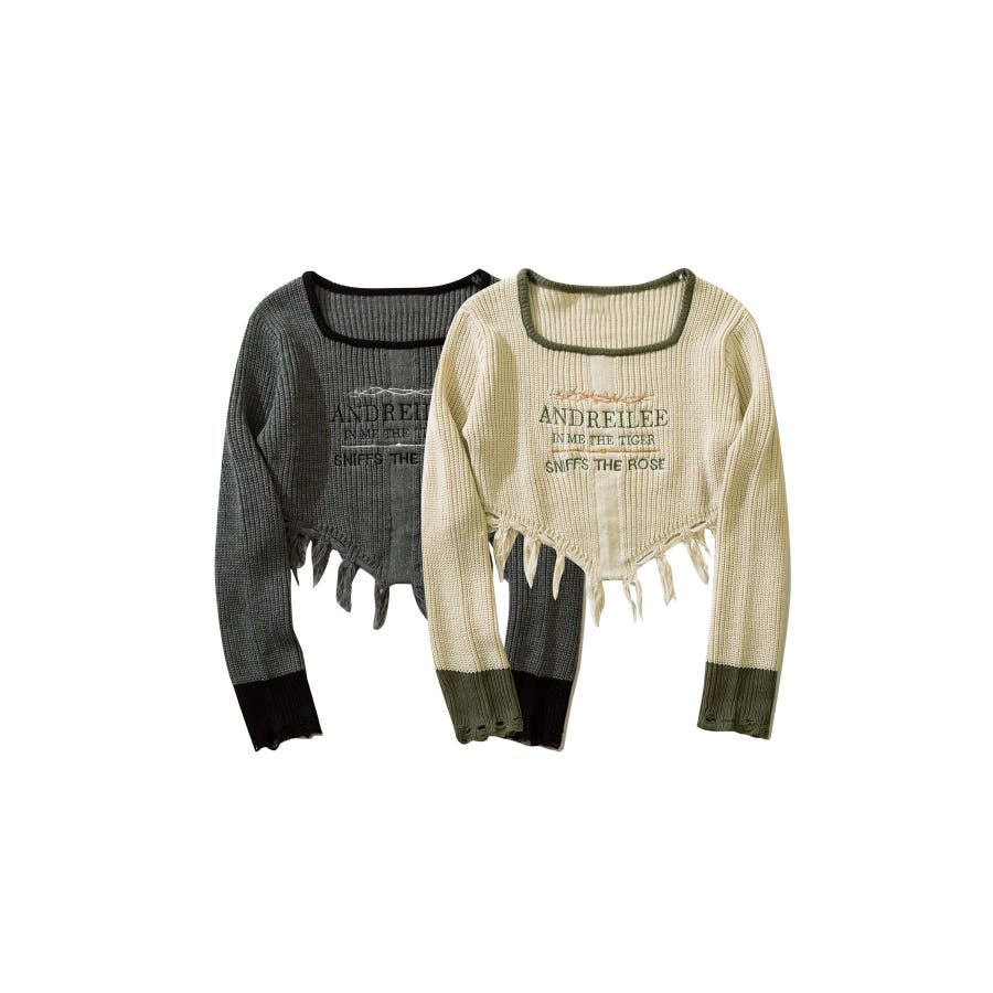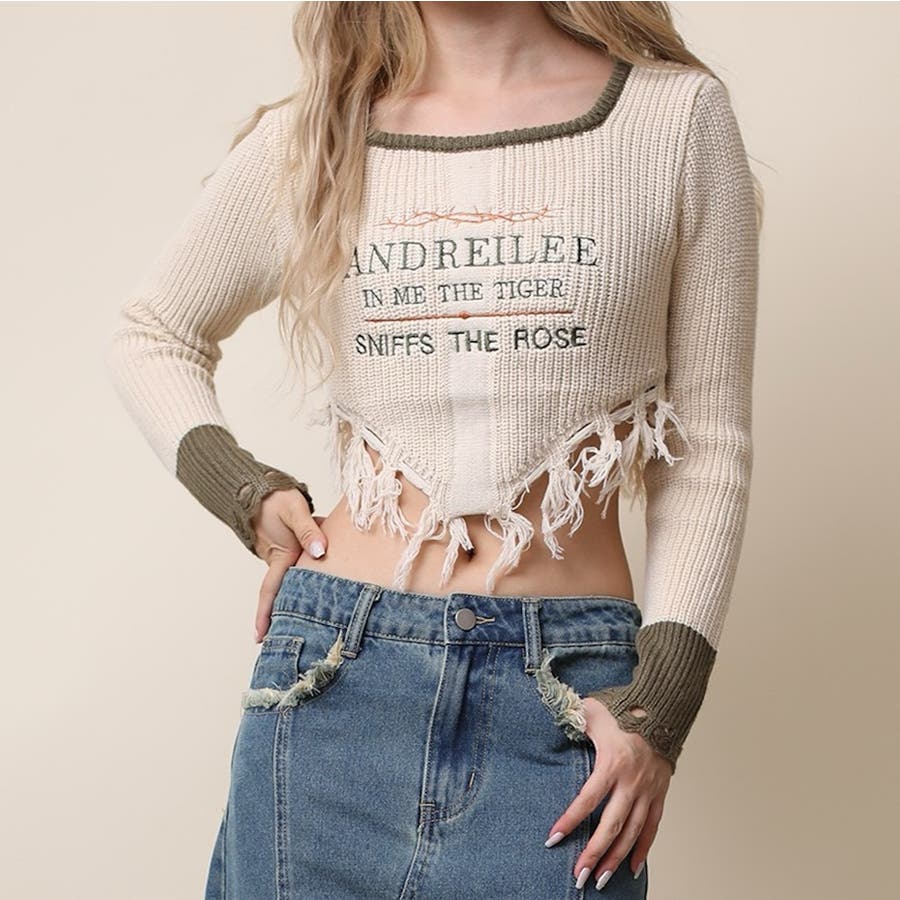 スクエアネックは首を細く長く見せる効果あり!フロントは英字刺繍でアメカジストリートの雰囲気が漂う。裾のフリンジとショート丈が可愛いだけでなく、脚長・細見え効果もある優れモノの一枚です。