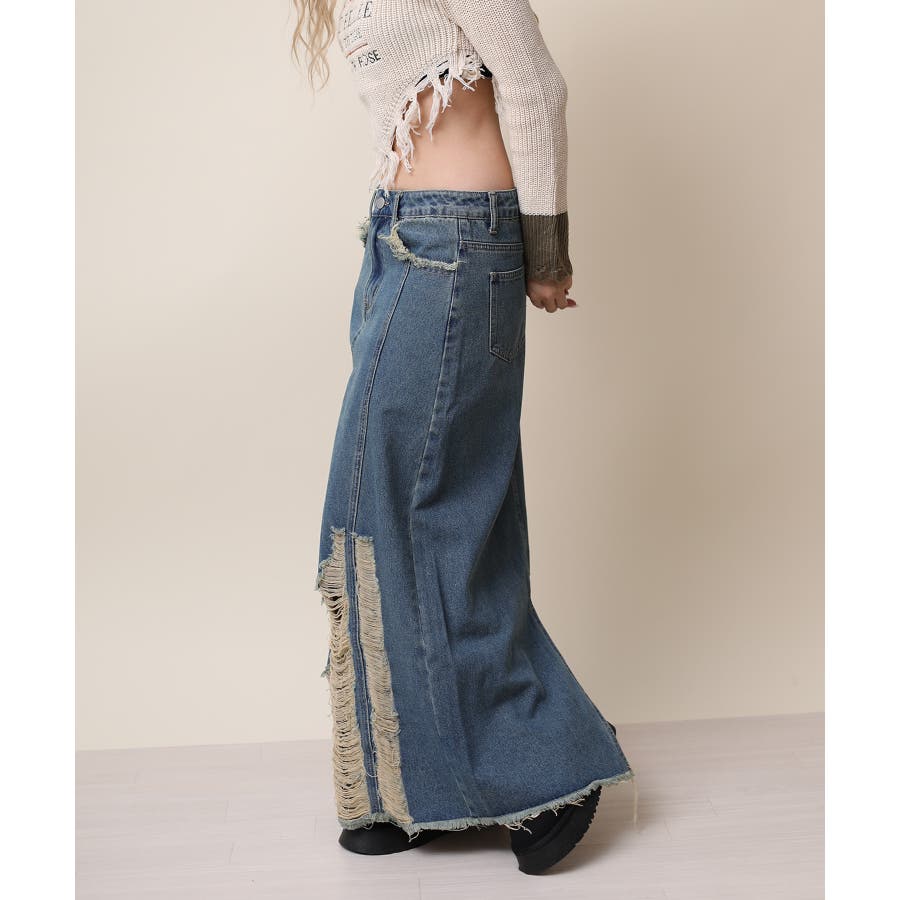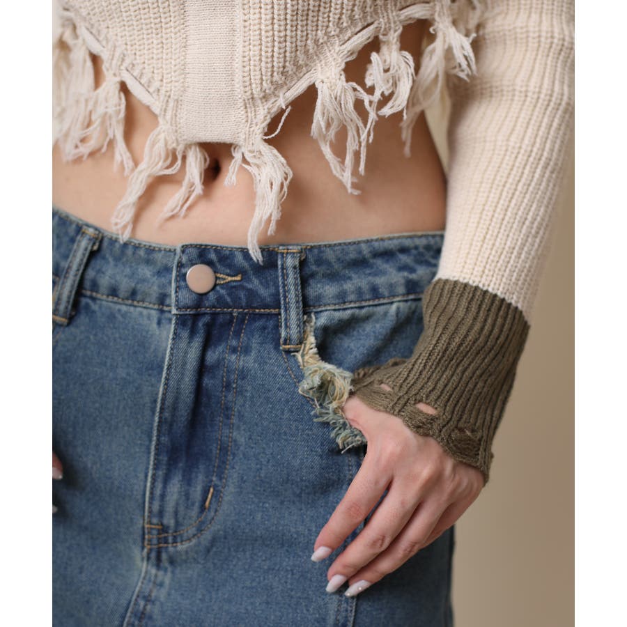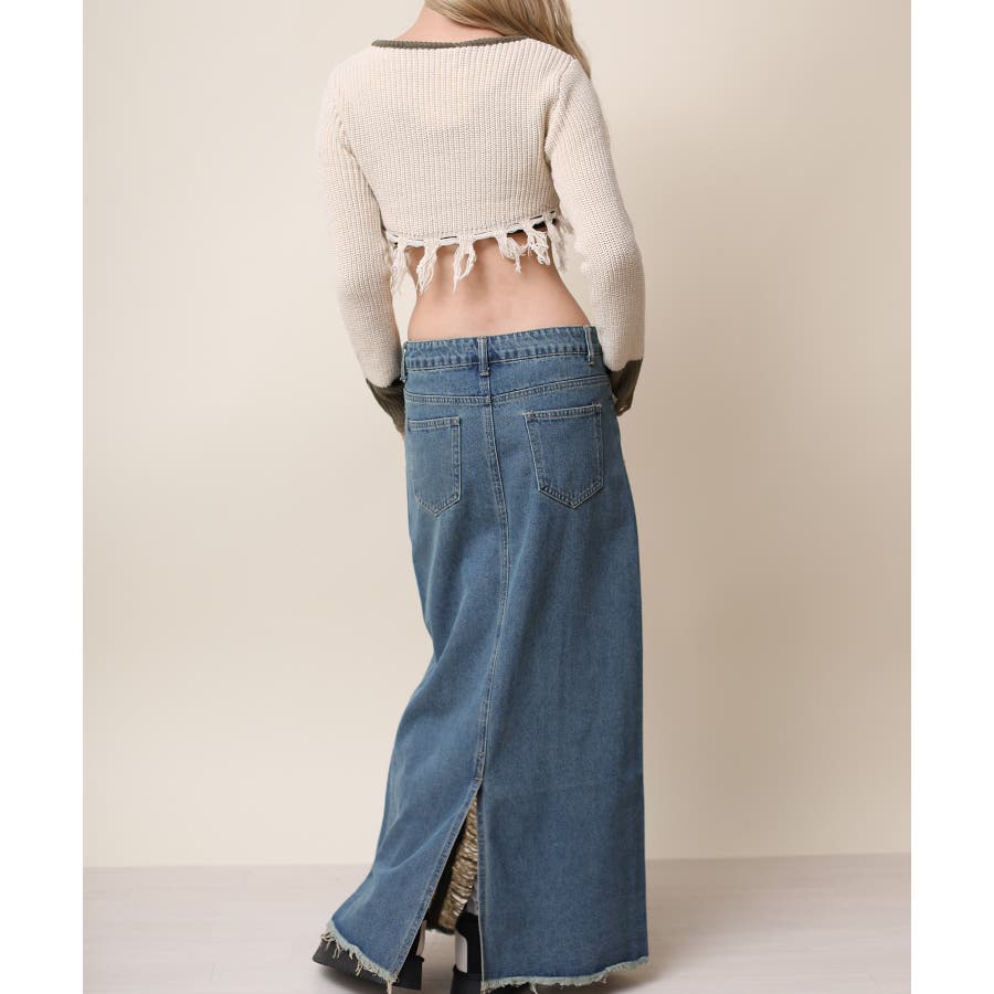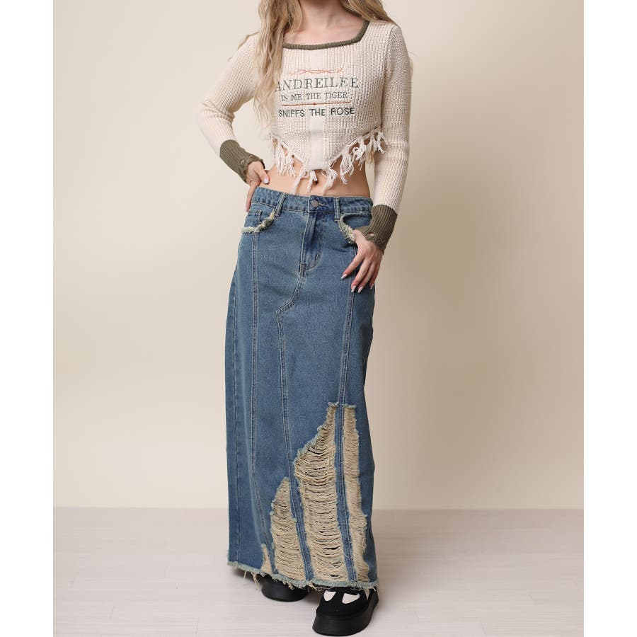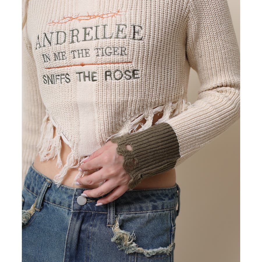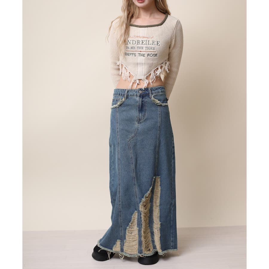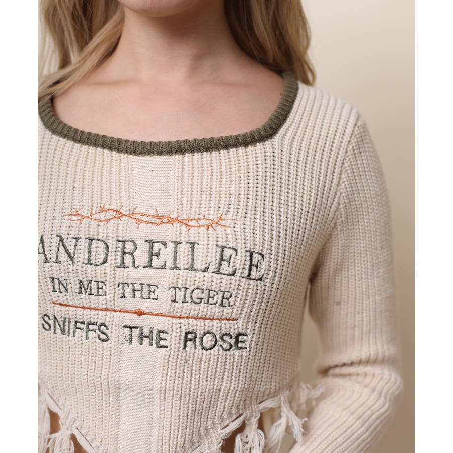 スクエアネックは首を細く長く見せる効果あり!フロントは英字刺繍でアメカジストリートの雰囲気が漂う。裾のフリンジとショート丈が可愛いだけでなく、脚長・細見え効果もある優れモノの一枚です。