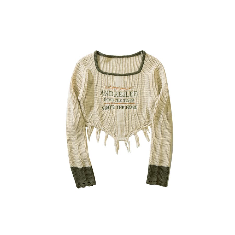 for girls 刺繍入りスクエアネックショット丈ニットソー 裾フリンジ