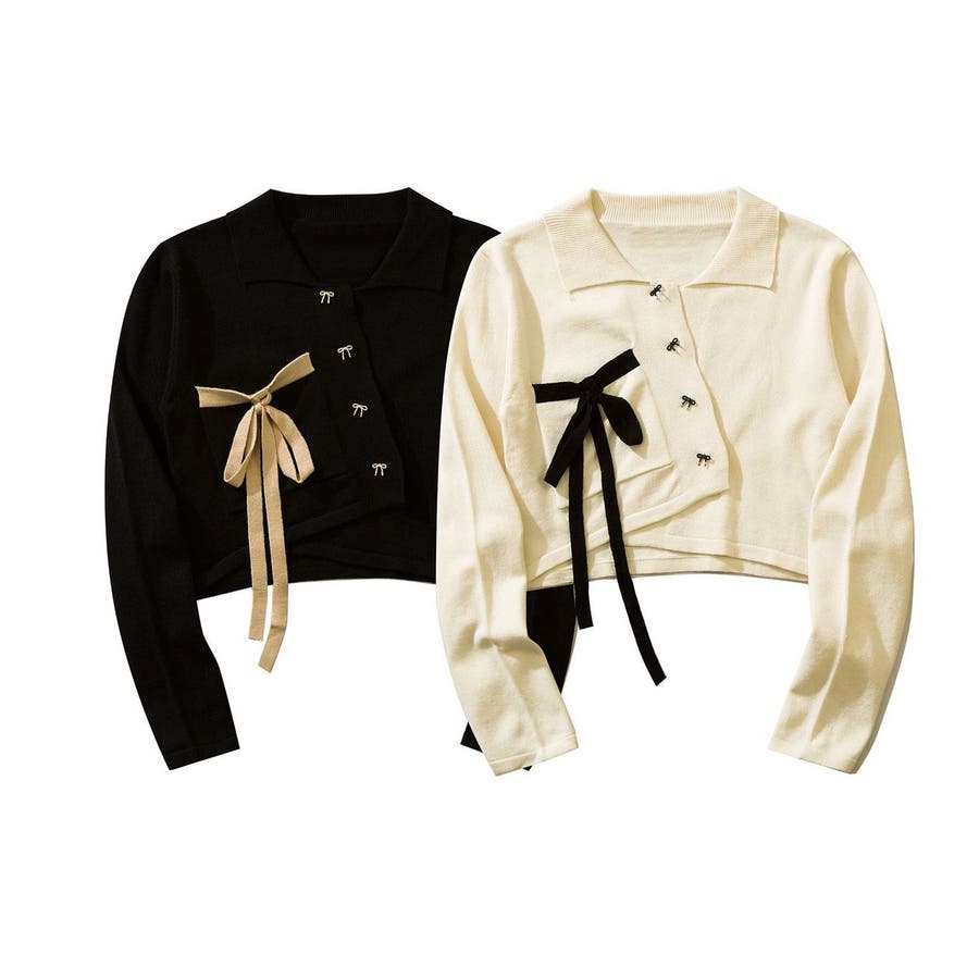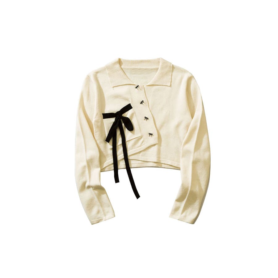 for girls アシンメトリーリボン飾りポロショット丈ニットソー