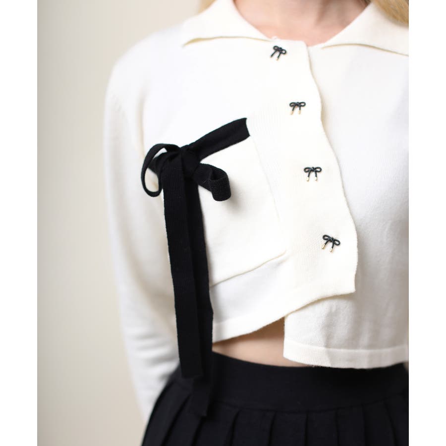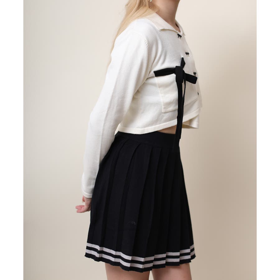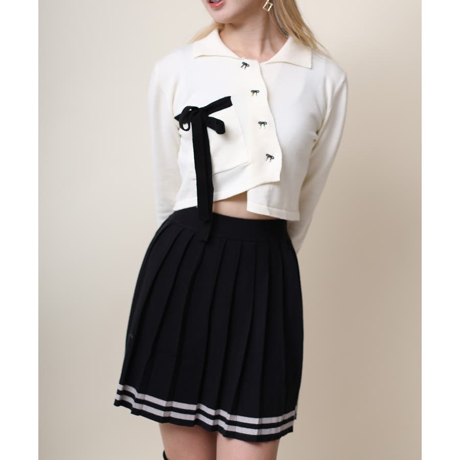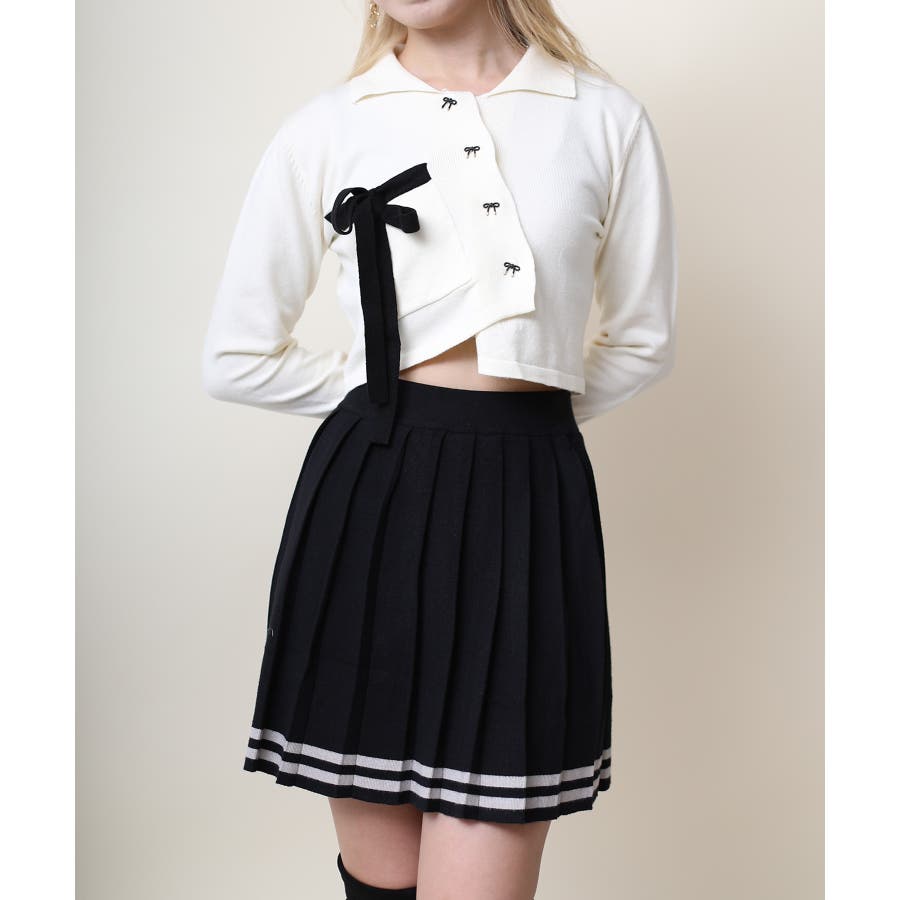 アシンメトリーデザインが特徴の可愛いショート丈ニットソー。リボンモチーフのボタンとリボンで女性らしさをプラス!ショート丈で脚長、細見え効果抜群。肌ざわりもモチモチで着心地も◎