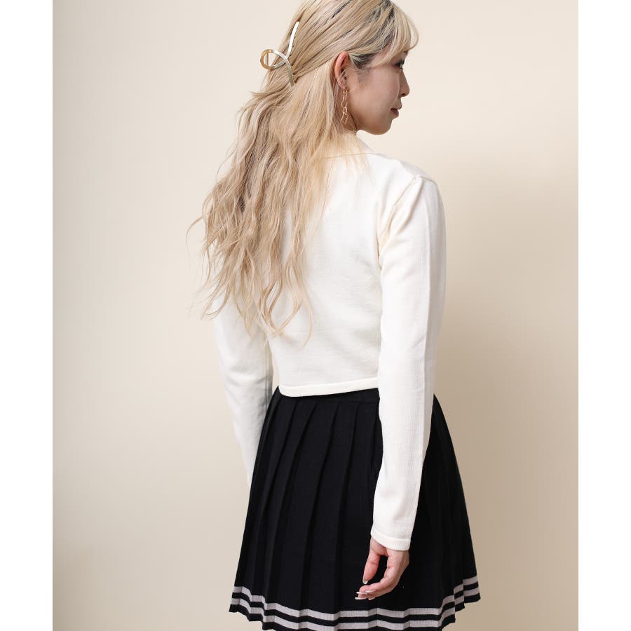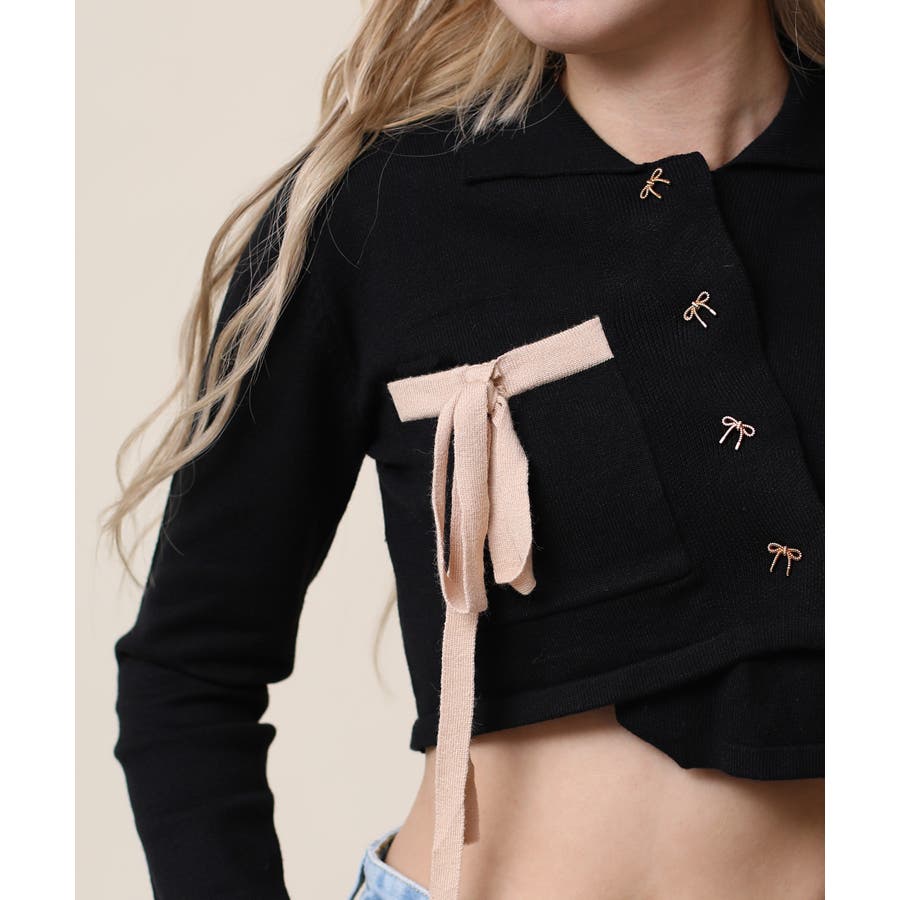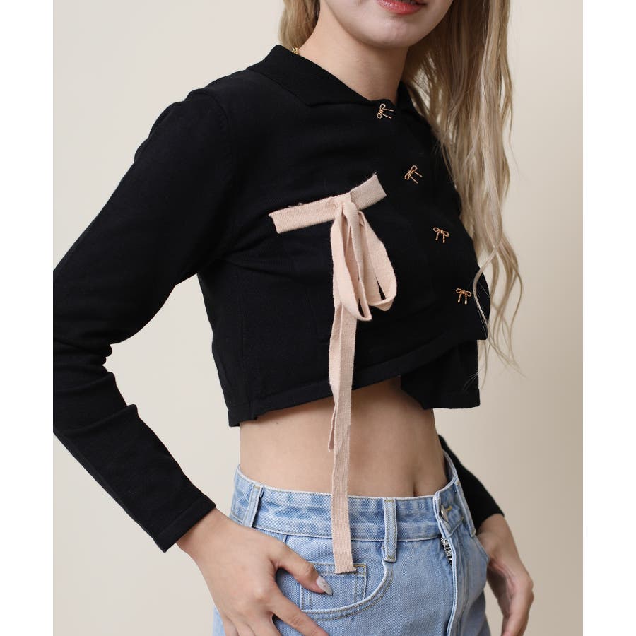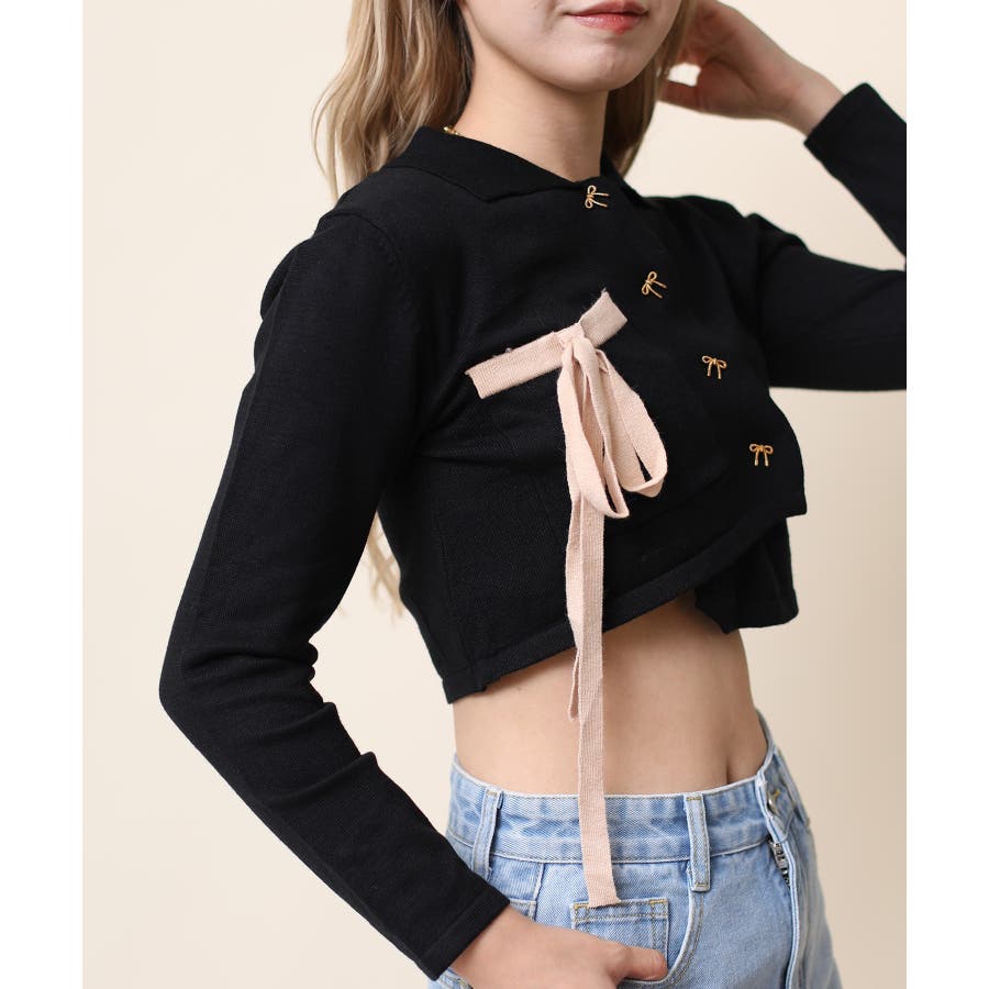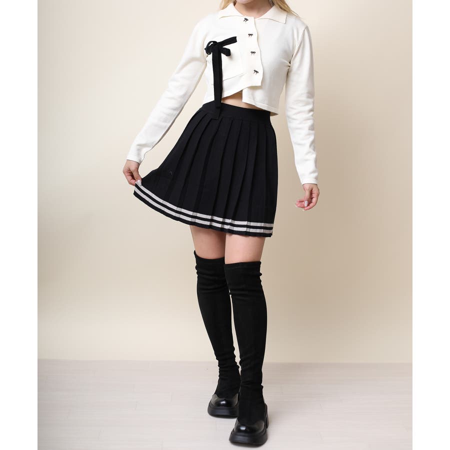 アシンメトリーデザインが特徴の可愛いショート丈ニットソー。リボンモチーフのボタンとリボンで女性らしさをプラス!ショート丈で脚長、細見え効果抜群。肌ざわりもモチモチで着心地も◎
