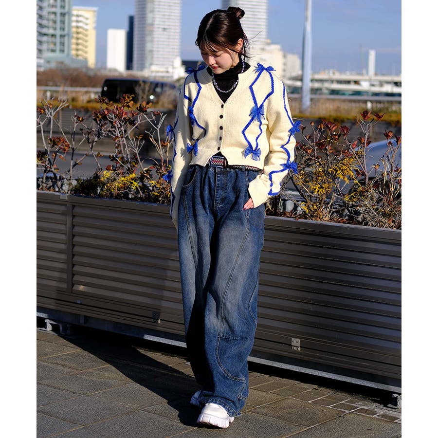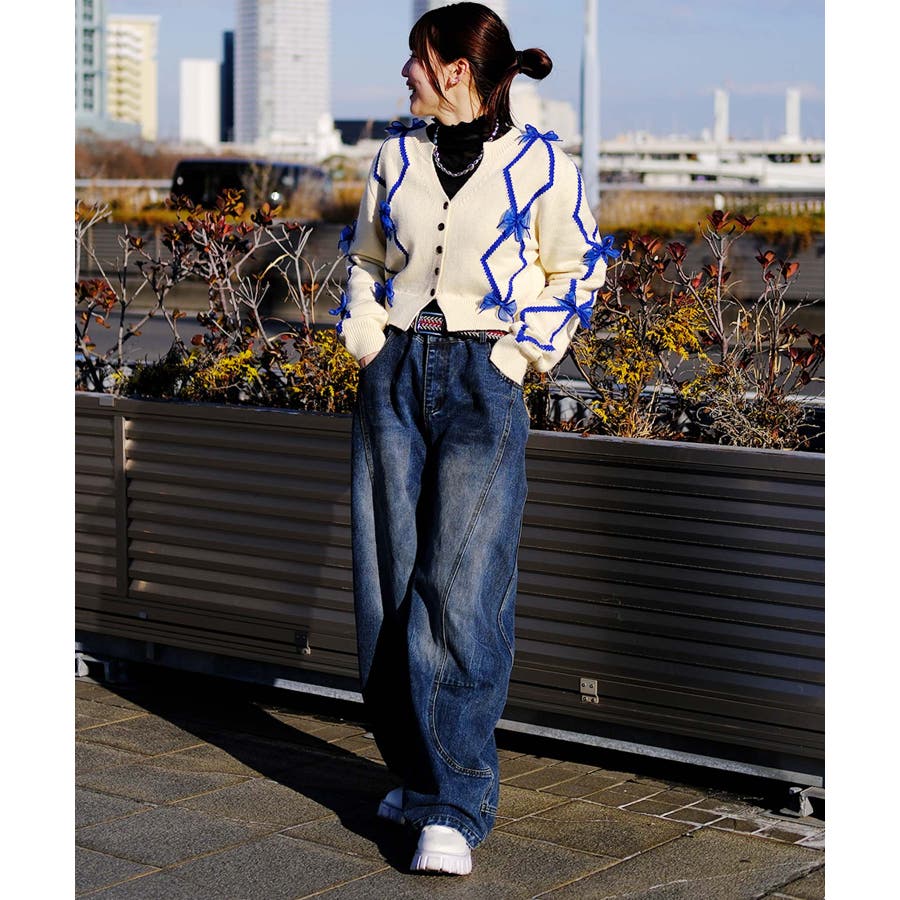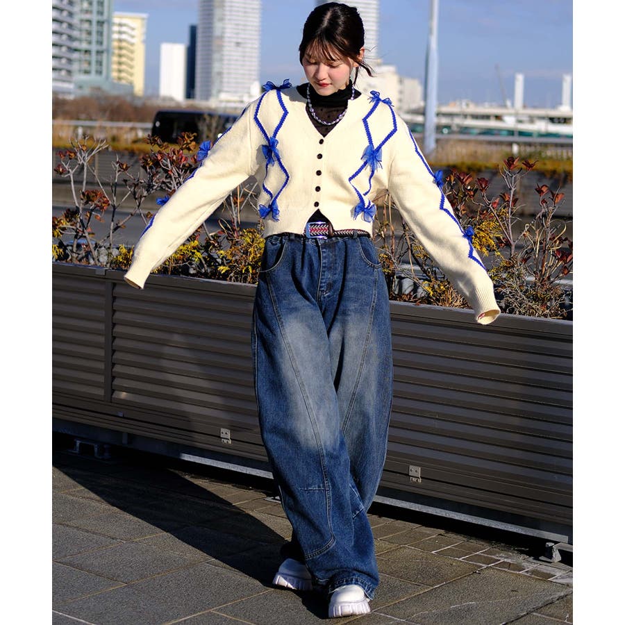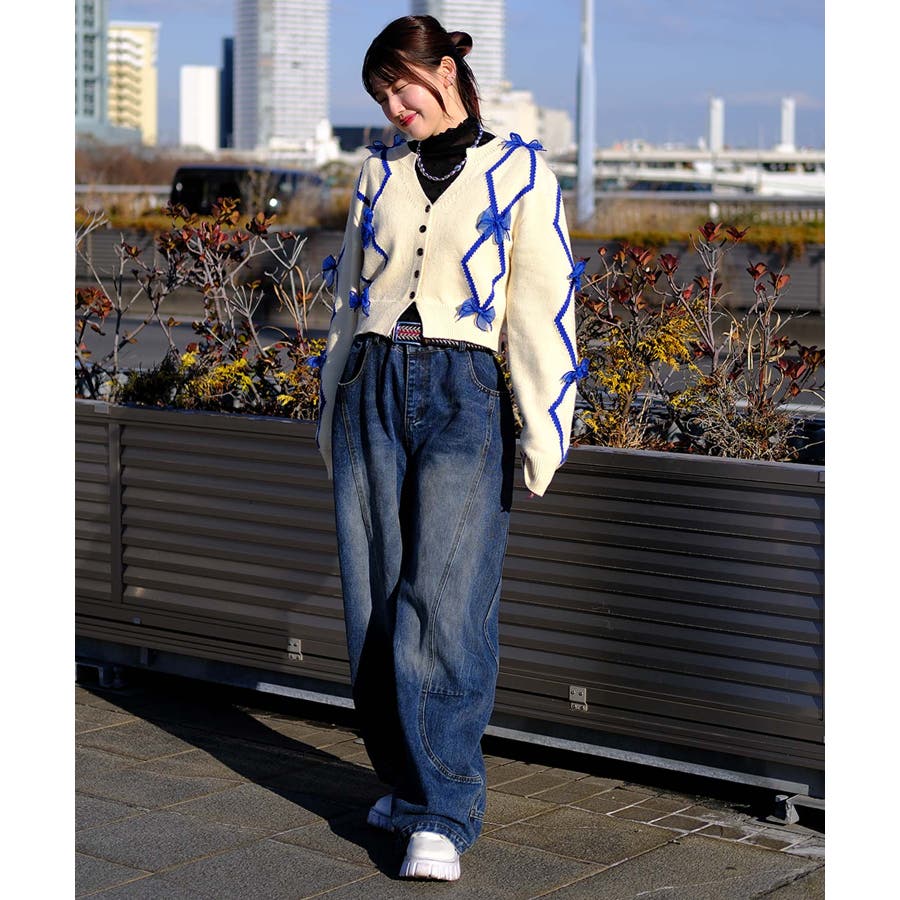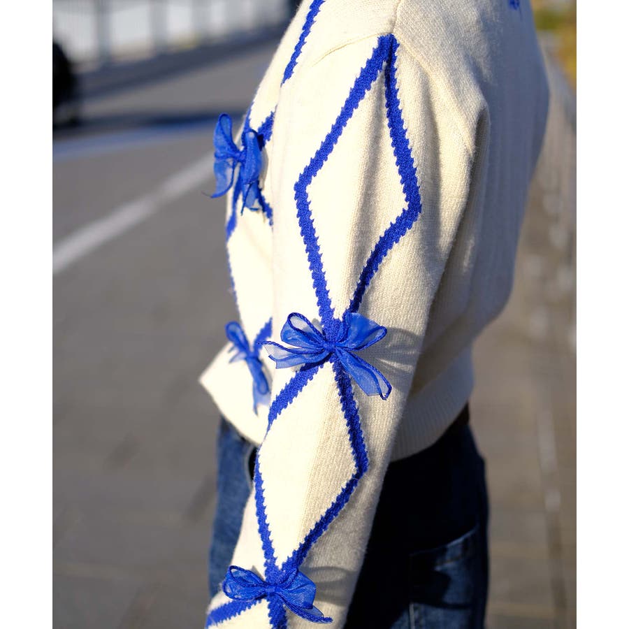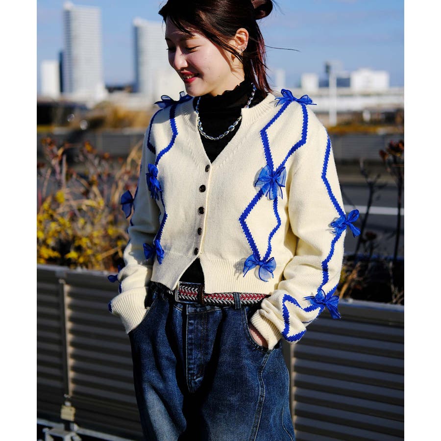 ショート丈のバイカラーダイヤ柄カーディガン。Y2Kファッションに欠かせないシフォンリボンとダイヤ柄がガーリーのアイテム。ふわふわとしたシフォンリボンが可愛らしさとフェミニンさを演出します。レトロな雰囲気漂うバイカラーのダイヤ柄でトレンド感もプラス。トップスインしやすいショート丈なので、ワイドパンツなどボリュームのあるボトムスと合わせてもスタイルアップ効果◎