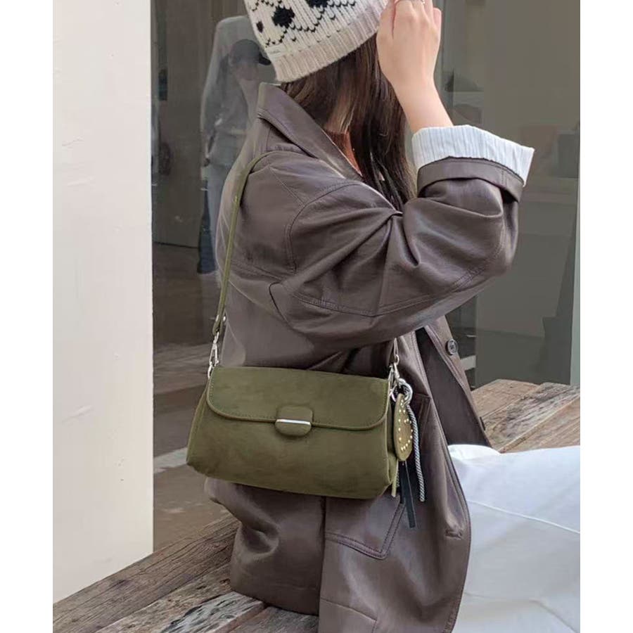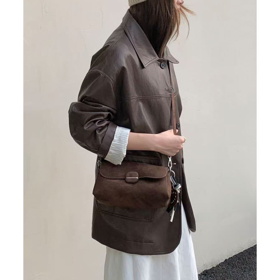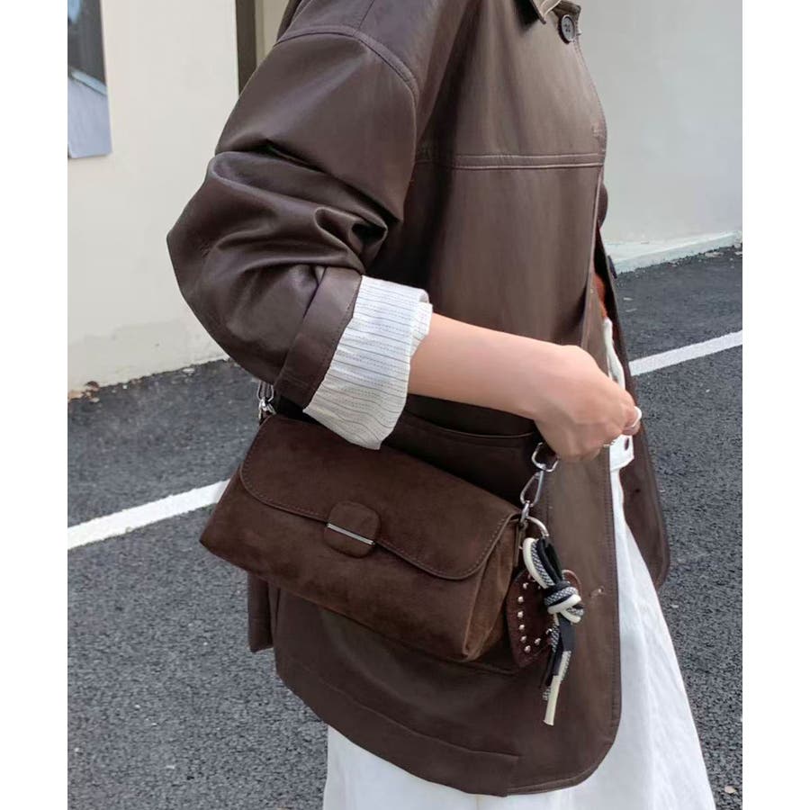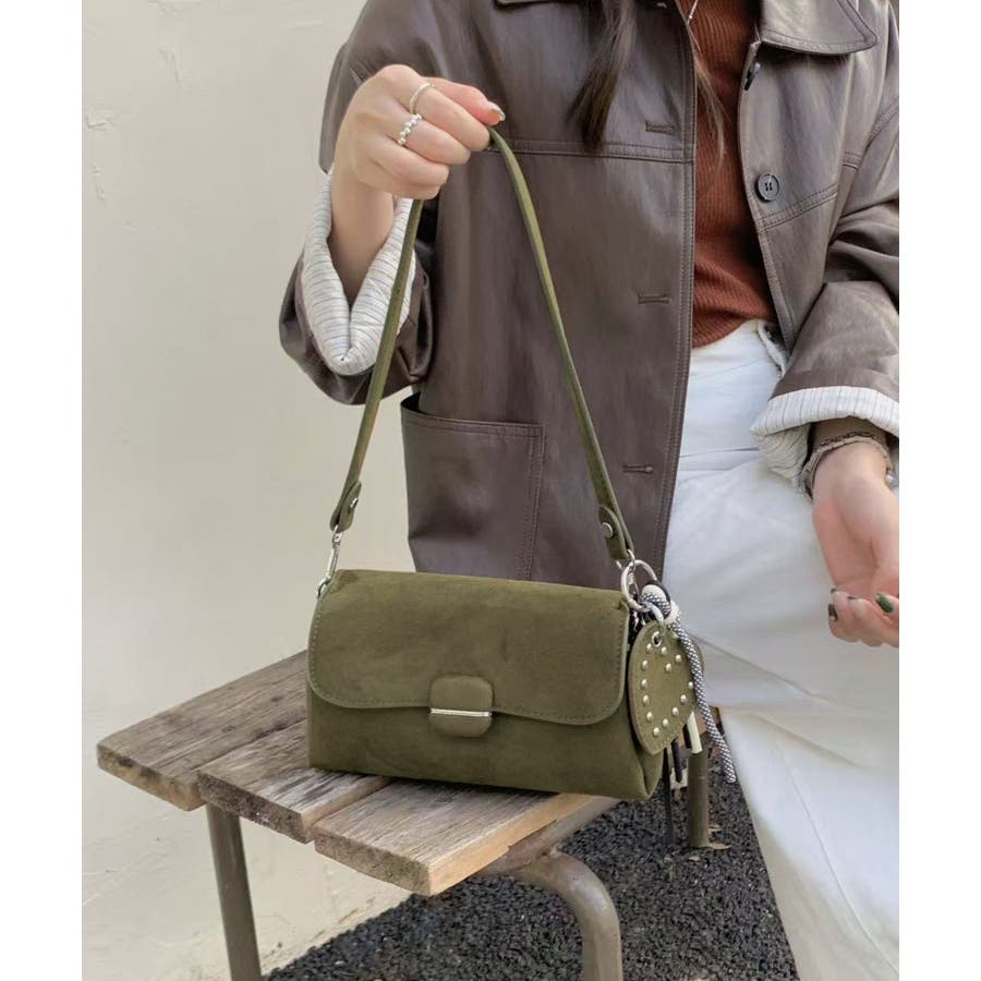 スエードタッチの柔らかな質感で、フラップとメタルパーツが甘すぎない大人可愛いデザイン。