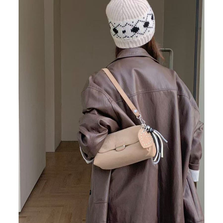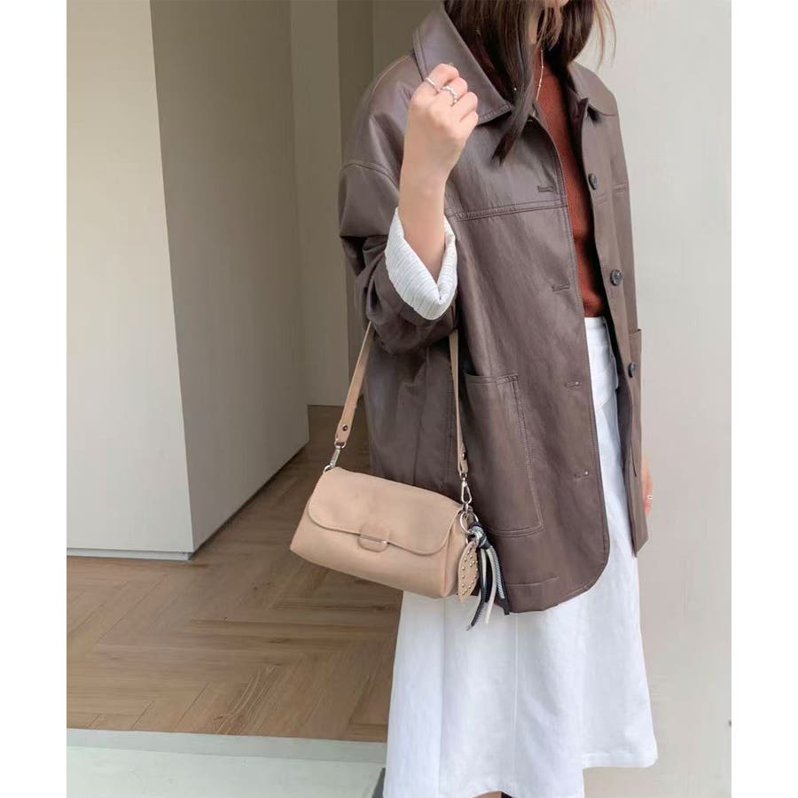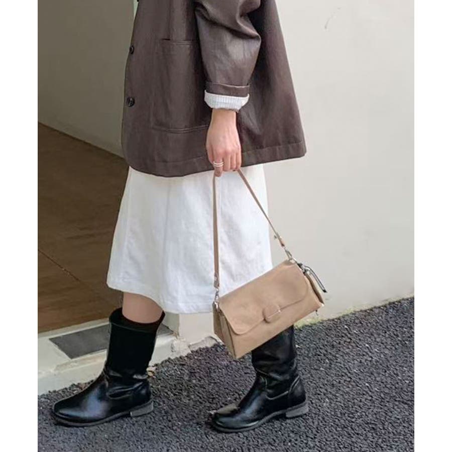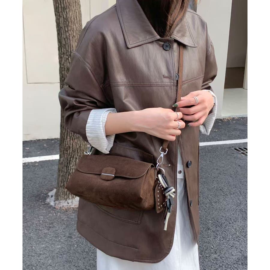 スエードタッチの柔らかな質感で、フラップとメタルパーツが甘すぎない大人可愛いデザイン。
