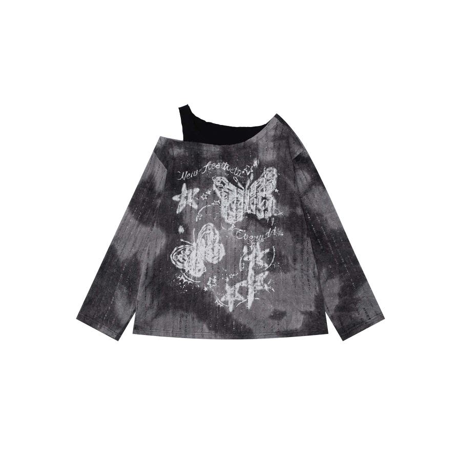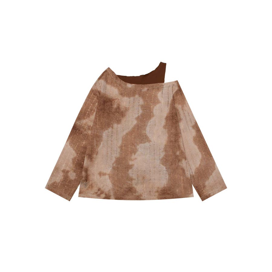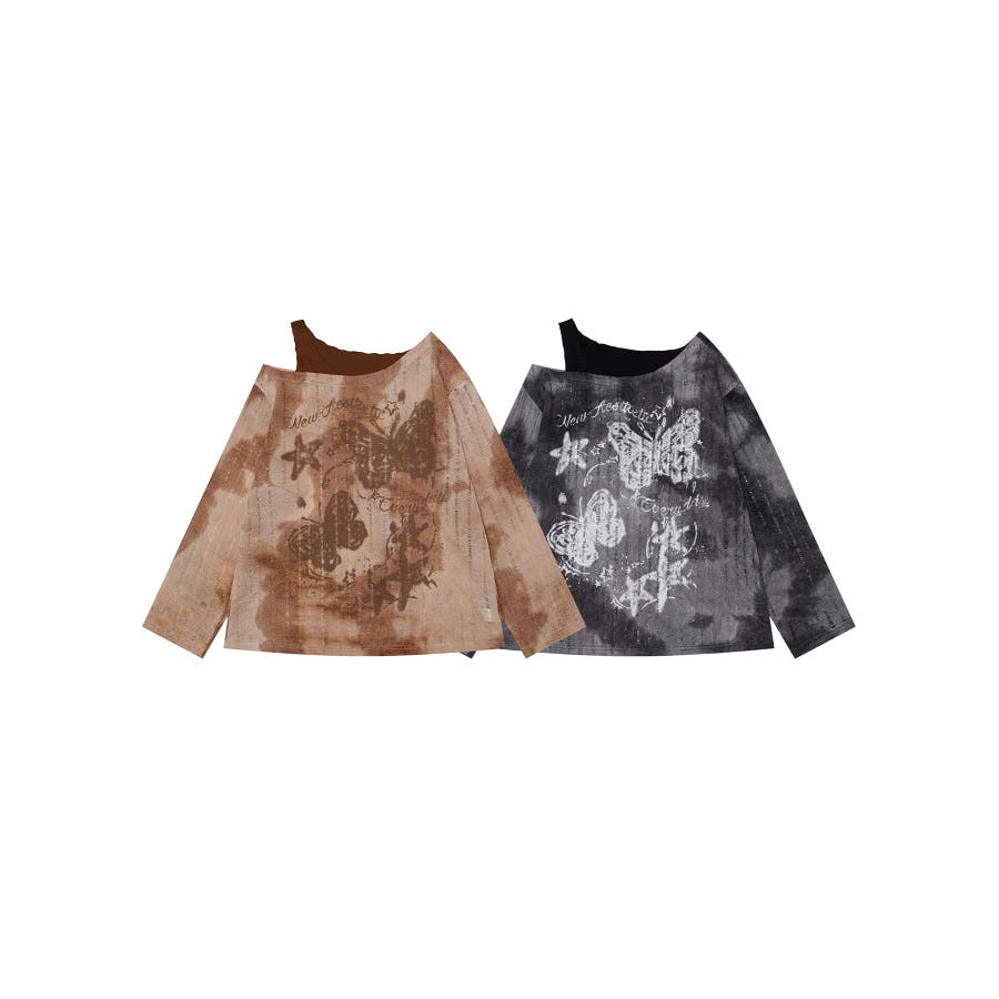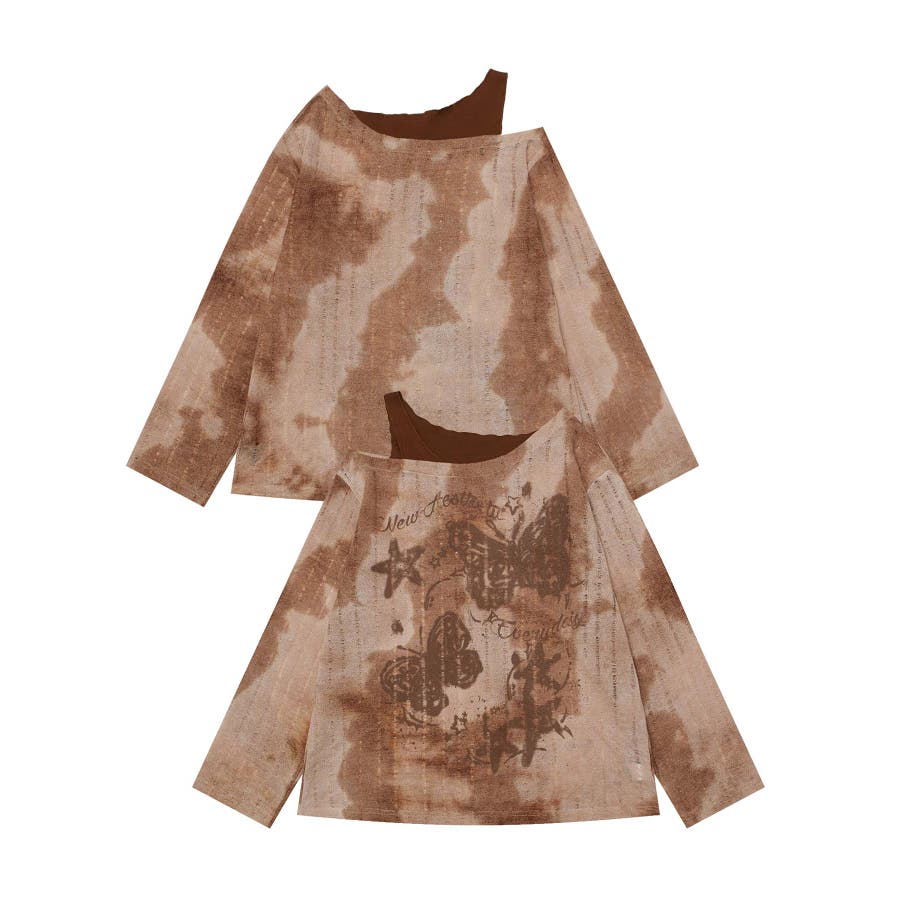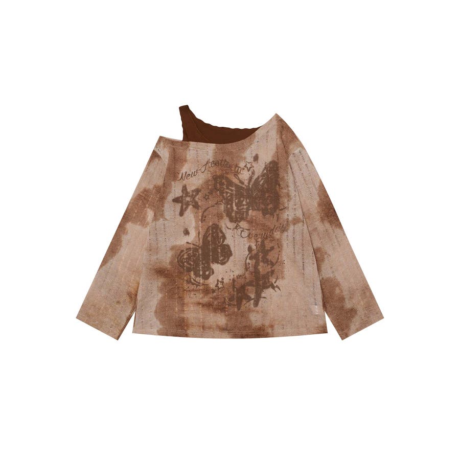ヴィンテージ感漂うタイダイ柄と肩出しデザインが目を引く個性的なトップス。タイダイプリントの味わい深い模様はリラックス感があり。片肩を大胆に開けたレイヤード風のアシンメトリーなデザインがモード感をプラス。フロントにあしらわれた蝶やレタリングのプリントがガーリーな雰囲気を演出します。軽やかな着心地で、シーズンを問わず活躍するアイテムです。適度な厚みがあり、レイヤードスタイルにも対応可能。ヴィンテージブラウンとモノトーンブラックの2色展開。それぞれタイダイ柄のニュアンスが異なり、個性的なコーディネートが楽しめます。ワイドパンツやデニムと合わせてラフに着こなしたり、プリーツスカートやタイトスカートで女性らしさを引き立てたスタイルもおすすめ。インナーにタートルネックを合わせると、季節感を加えた着こなしが完成します。足元にはブーツやスニーカーをチョイスしてアクセントをプラス。
