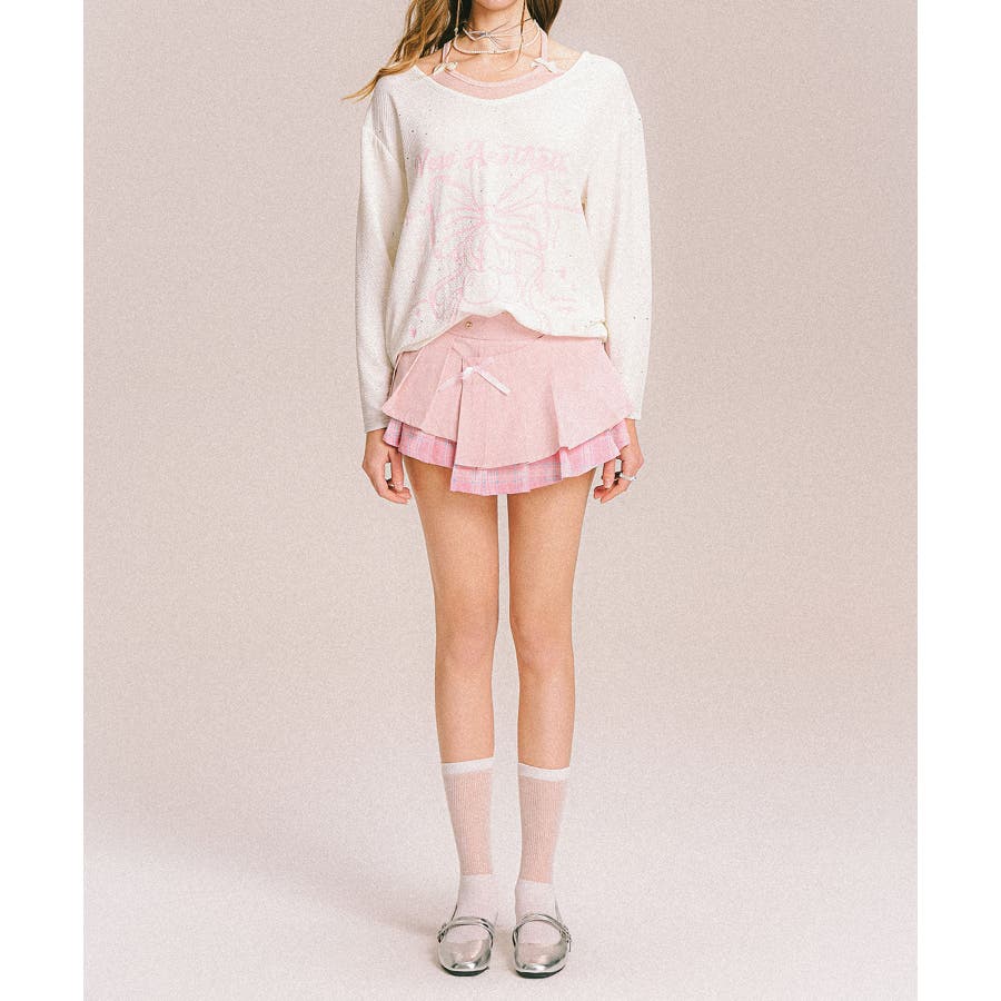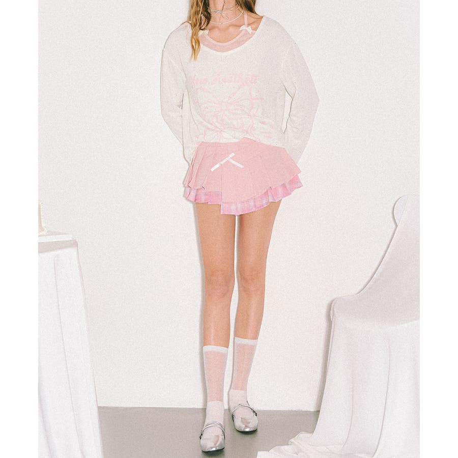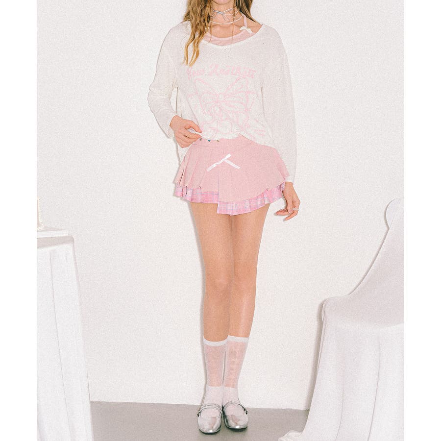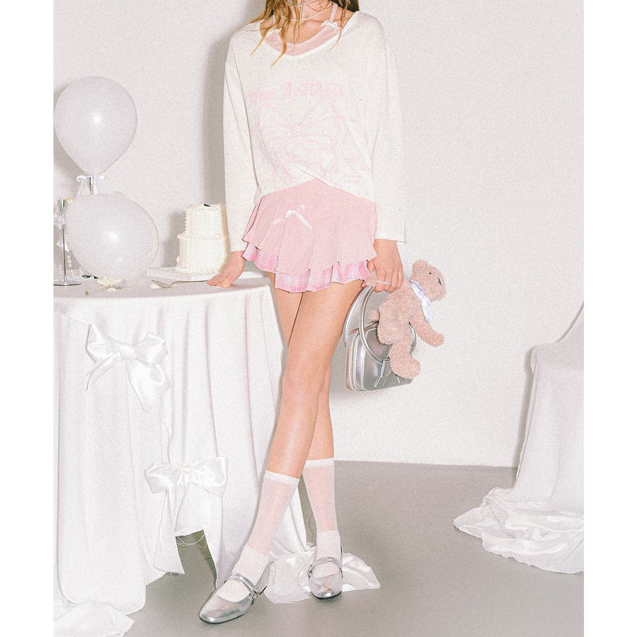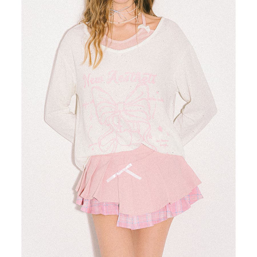 ■デザインフロントにガーリーなリボンプリントをあしらった、ルーズシルエットのトップス。ゆるめのラウンドネックとドロップショルダーで、ラフなこなれ感。カジュアルながらも、ガーリーなアクセントが可愛さをプラス。柔らかく伸縮性のある素材で、リラックスした着心地が魅力。■コーディネート・プリーツスカートやフリルスカートと合わせて、甘めストリートスタイルに。・デニムやカーゴパンツと合わせて、ゆるかわカジュアルにも。・インナーにタンクトップやレースキャミを合わせて、レイヤードコーデもおすすめ。