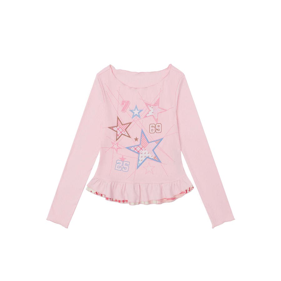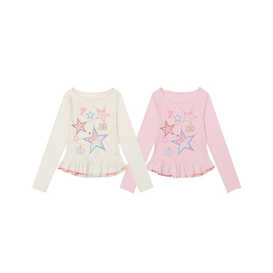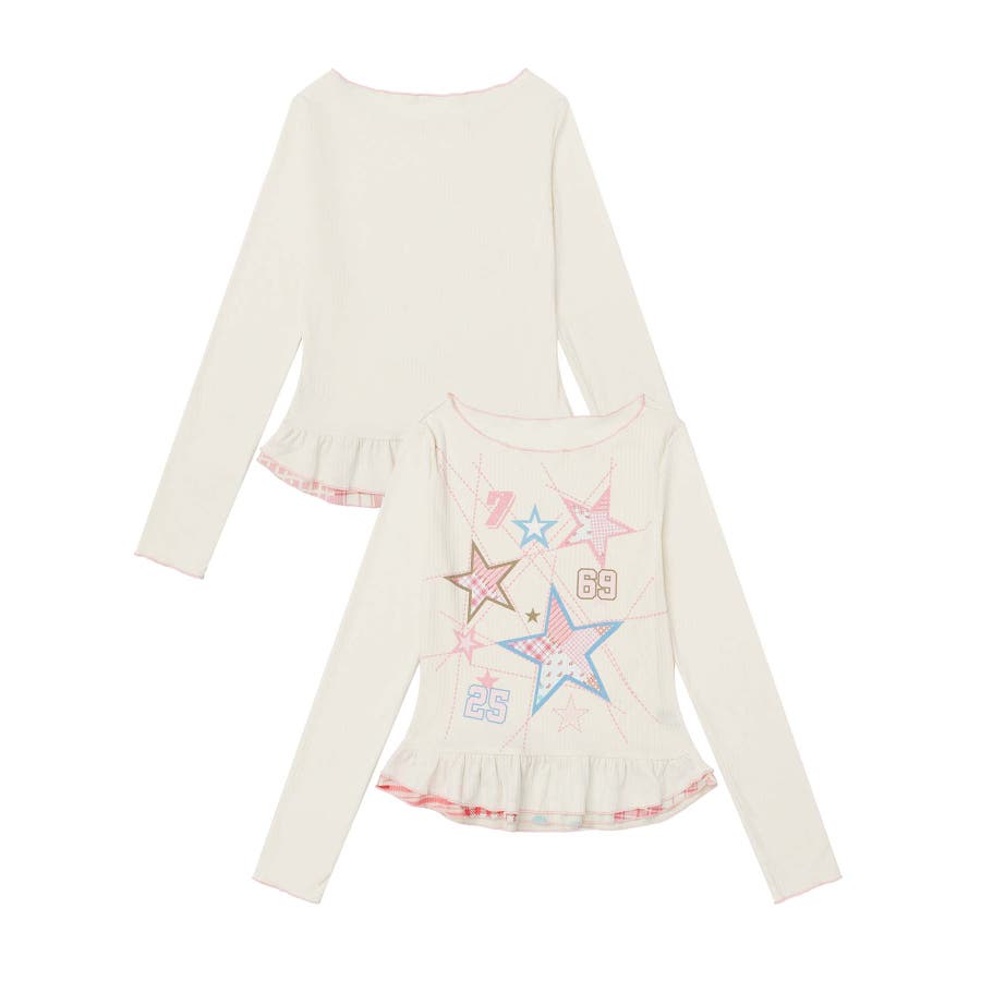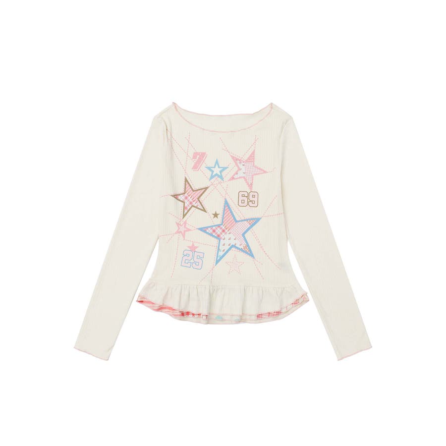 ポップな星プリントとガーリーな裾のフリルが可愛らしい印象を与えるカットソー。フロントに施された大小さまざまな星モチーフが目を引くデザイン。カラフルな色使いがポップな雰囲気を演出します。裾部分にはフリルをあしらい、ガーリーなアクセントをプラス。細部にこだわったステッチが、全体を華やかに仕上げています。柔らかなリブ素材を使用し、伸縮性が高く動きやすい着心地を実現。軽やかな生地感で、季節の変わり目や重ね着にもぴったりです。キュートなベージュとピンクの2色展開。どちらも明るく、女性らしさを引き立てるカラーリングです。デニムパンツやスキニーパンツと合わせて、カジュアルに仕上げるのがおすすめ。フレアスカートやチュールスカートと組み合わせると、さらにフェミニンな印象に。アクセサリーをプラスしてポップなスタイリングを楽しむのも◎