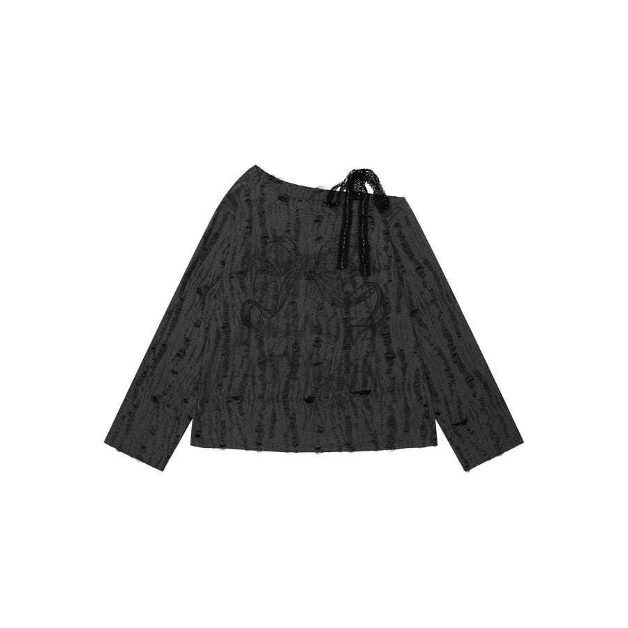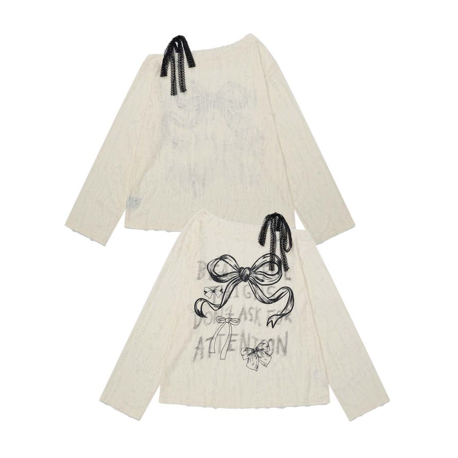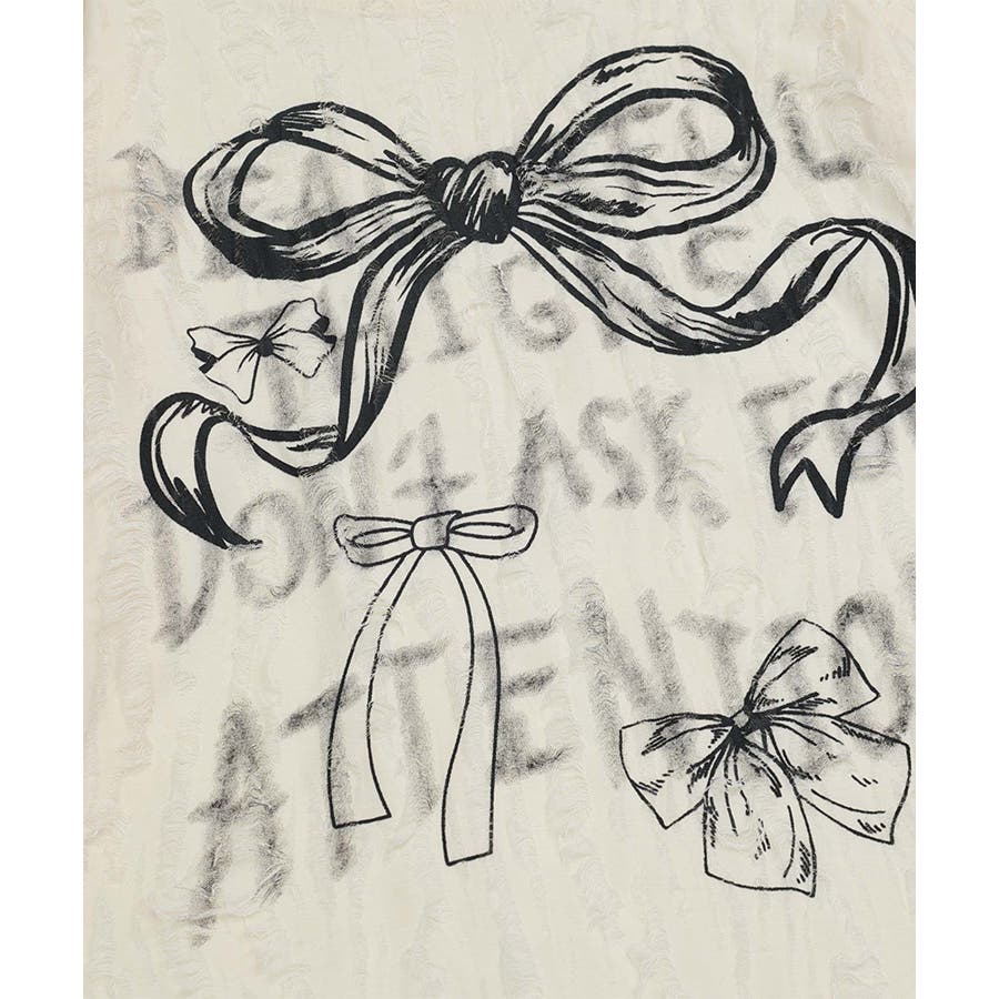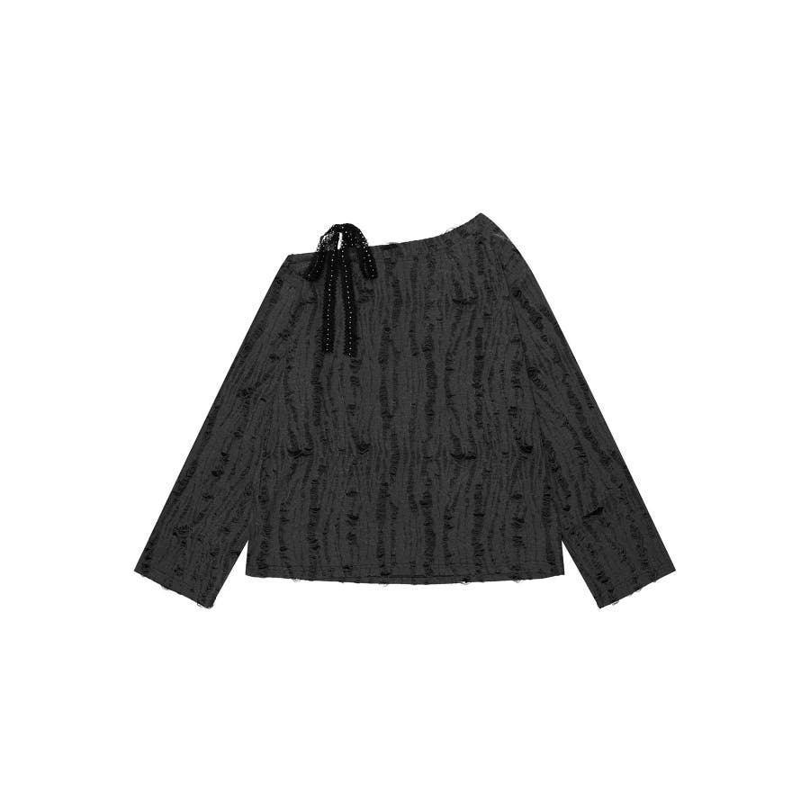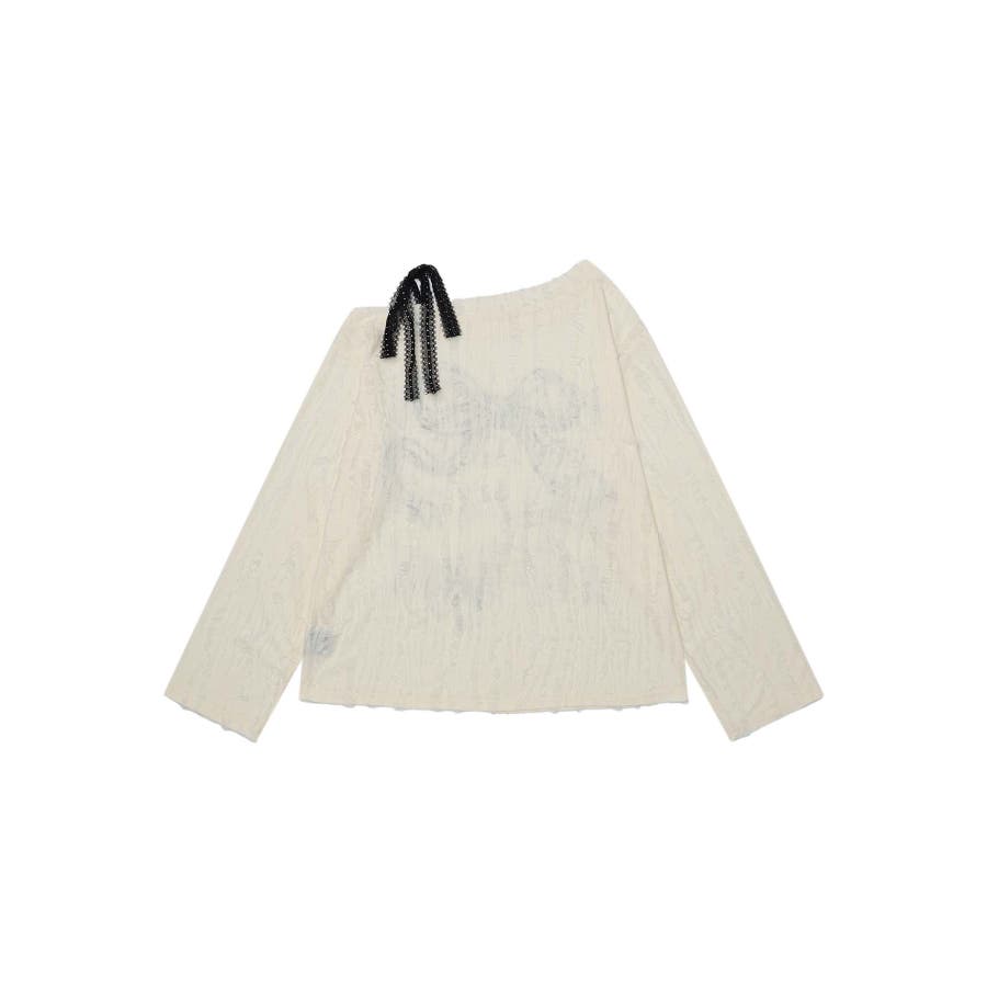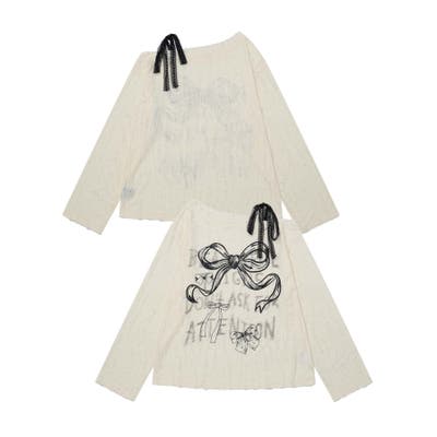繊細なリボンプリントと肩出しデザインが特徴の、個性派トップス。フロントに大きく施されたリボンプリントが印象的で、ガーリーさとモード感を兼ね備えたデザイン。肩部分のオープンディテールに加え、ダメージ加工が全体に施されており、程よい抜け感を演出します。肩のリボン装飾がさらにフェミニンなアクセントに。柔らかく薄手のカットソー素材を採用。軽い着心地でありながら肌寒い季節にも対応可能。加工感のある生地が、ヴィンテージライクな表情を生み出します。ベーシックなベージュとダークグレーの2色展開。どちらも落ち着いたトーンで、スタイリングしやすい万能カラーです。デニムやカーゴパンツでカジュアルにまとめたり、フレアスカートやレーススカートでフェミニンに仕上げても◎インナーとして使う際にはタートルネックやシンプルなカットソーを合わせると、シーズンを通じて着回しが可能です。