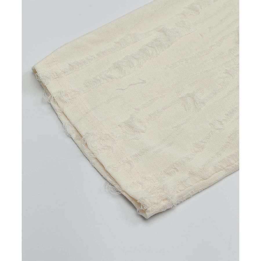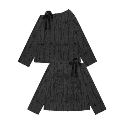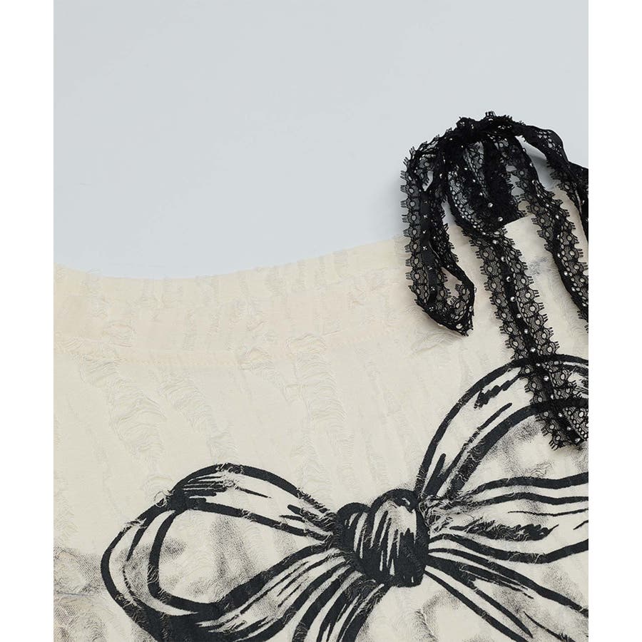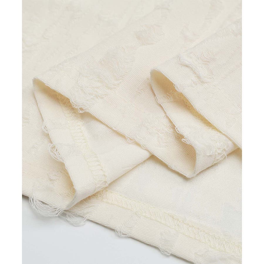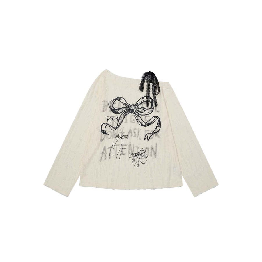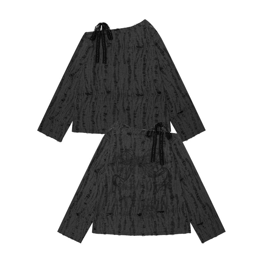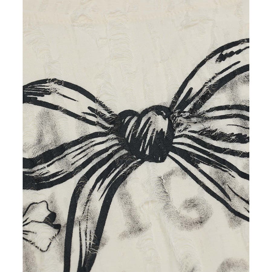 繊細なリボンプリントと肩出しデザインが特徴の、個性派トップス。フロントに大きく施されたリボンプリントが印象的で、ガーリーさとモード感を兼ね備えたデザイン。肩部分のオープンディテールに加え、ダメージ加工が全体に施されており、程よい抜け感を演出します。肩のリボン装飾がさらにフェミニンなアクセントに。柔らかく薄手のカットソー素材を採用。軽い着心地でありながら肌寒い季節にも対応可能。加工感のある生地が、ヴィンテージライクな表情を生み出します。ベーシックなベージュとダークグレーの2色展開。どちらも落ち着いたトーンで、スタイリングしやすい万能カラーです。デニムやカーゴパンツでカジュアルにまとめたり、フレアスカートやレーススカートでフェミニンに仕上げても◎インナーとして使う際にはタートルネックやシンプルなカットソーを合わせると、シーズンを通じて着回しが可能です。