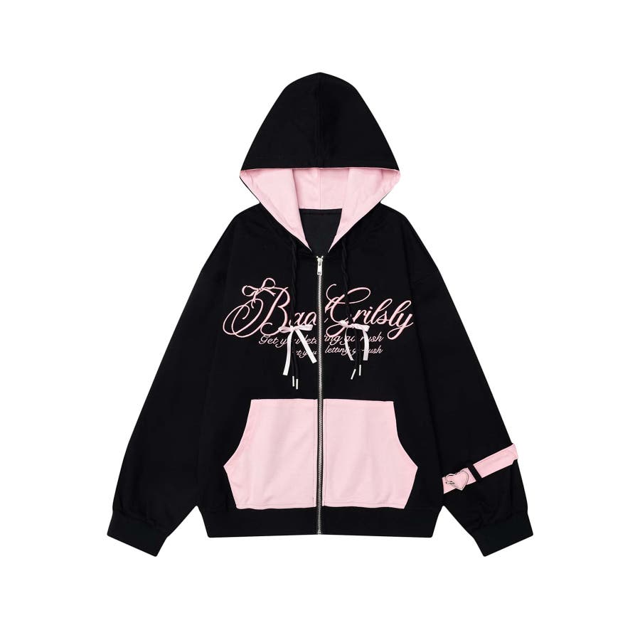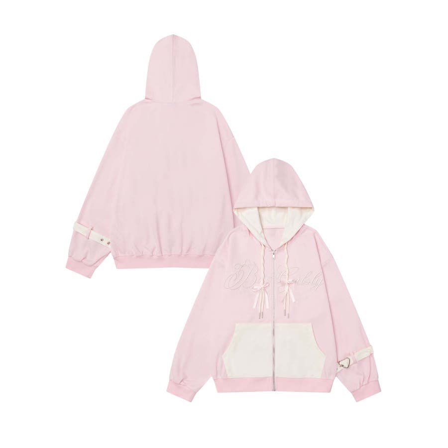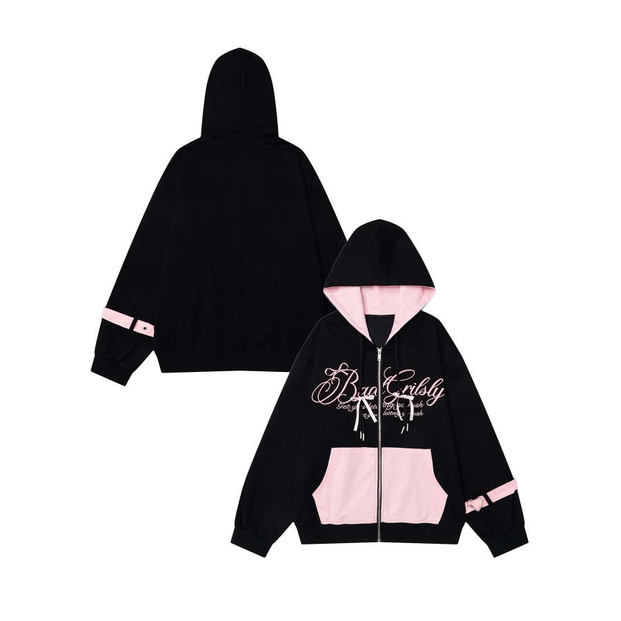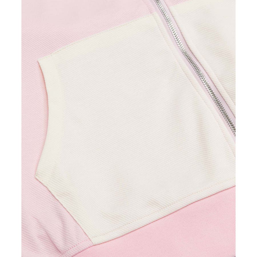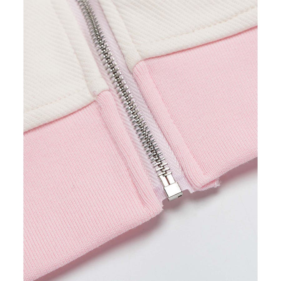 ガーリーな色味のバイカラー配色と繊細な刺繍が特徴のジップパーカー。フードやポケット、袖部分に施されたバイカラーデザインが視線を集めるポイント。胸元にはロゴ刺繍が施され、上品でフェミニンな雰囲気をプラス。袖口のベルトディテールがガーリーさを引き立てます。フロントはジップ仕様で、機能性も兼ね備えたデザインです。柔らかくしなやかなコットン混紡素材を採用。肌触りがよく、軽量で着心地抜群。季節の変わり目やちょっとした羽織りにぴったりです。甘さのあるピンク×ホワイトと、大人っぽいブラック×ピンクの2色展開。それぞれ異なる印象でコーディネートの幅が広がります。ミニスカートやフレアパンツと合わせてガーリーに仕上げたり、デニムやショートパンツでカジュアルダウンしたスタイリングも◎。足元にはスニーカーやローファーを合わせて、軽快なコーデを完成させてください。