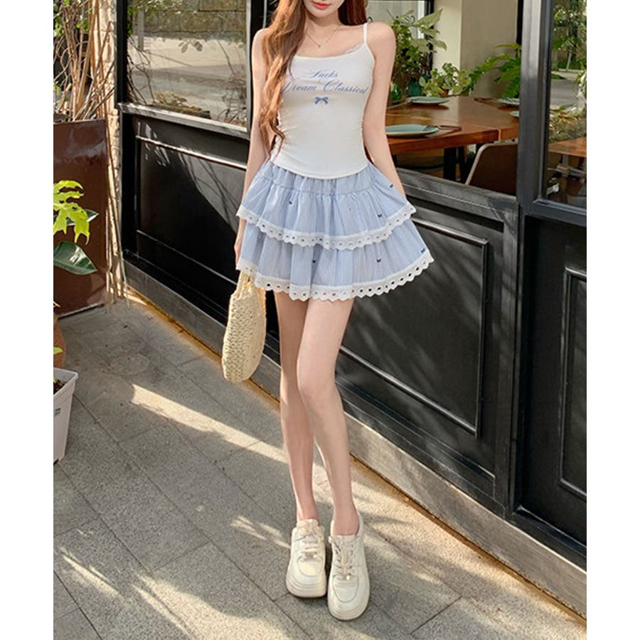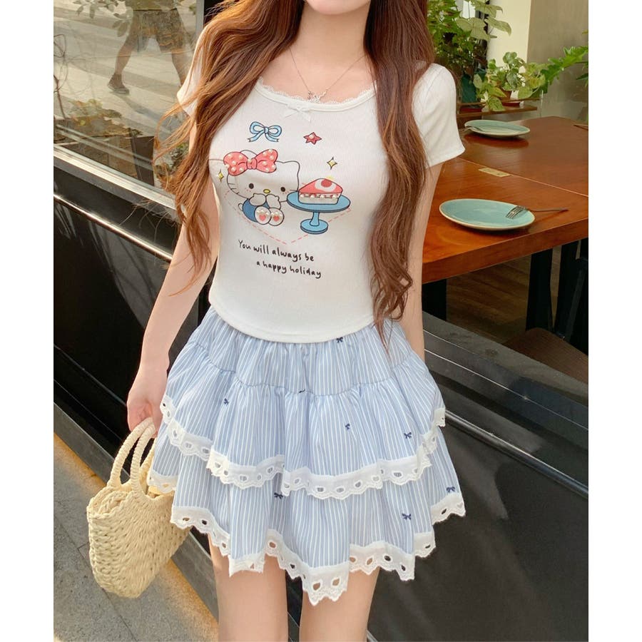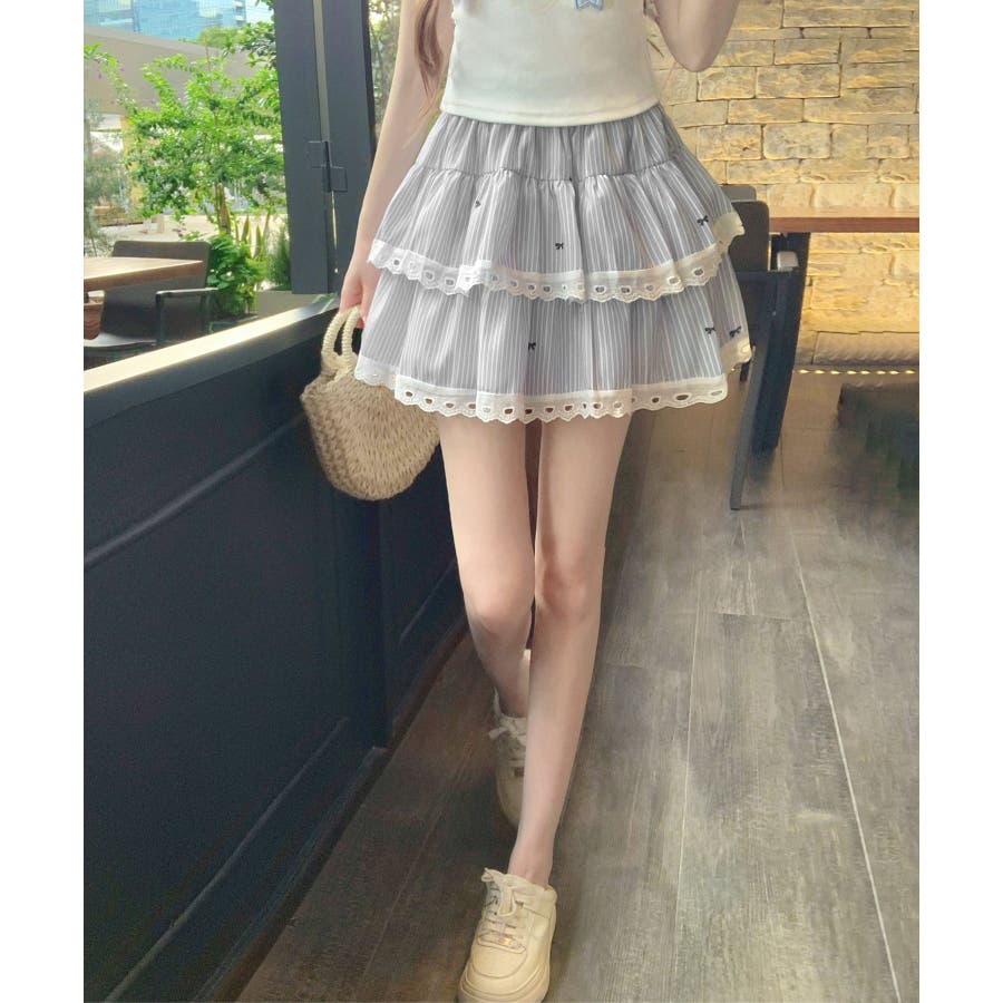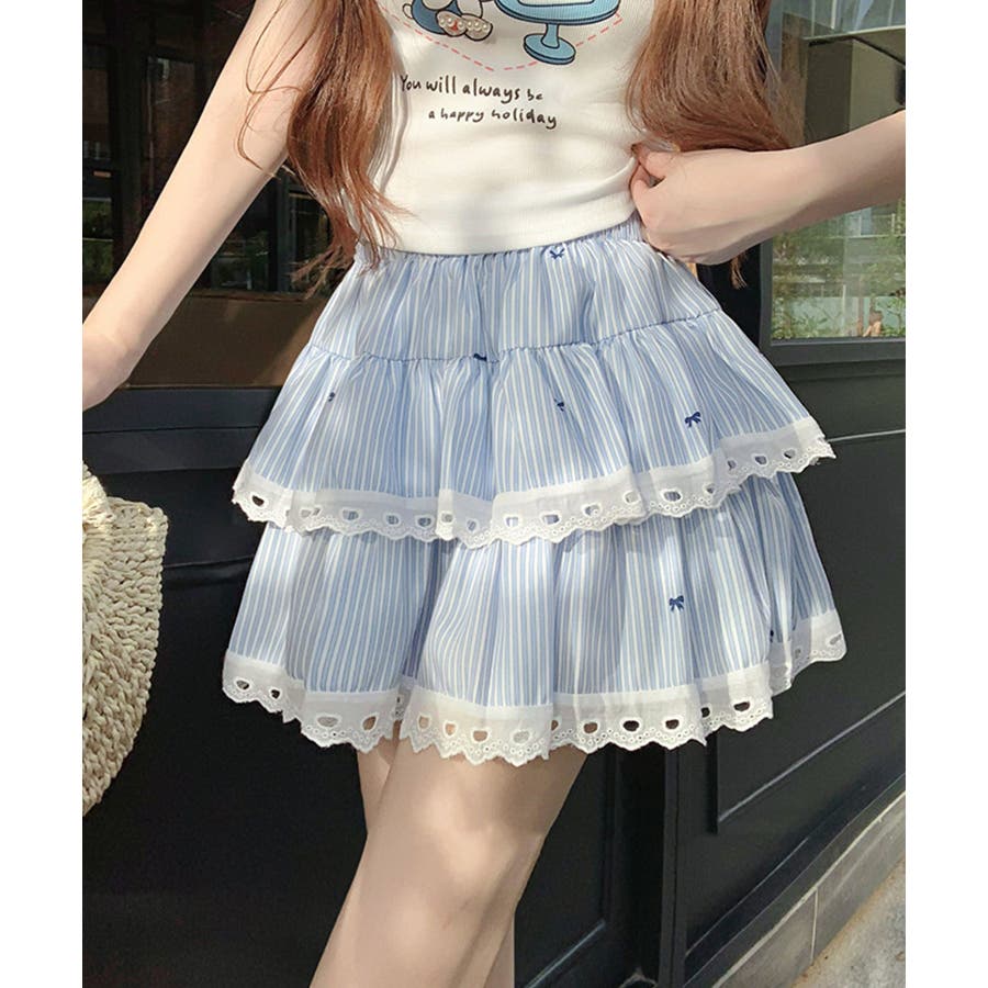 ストライプ柄に小さなリボン刺繍を散りばめた、