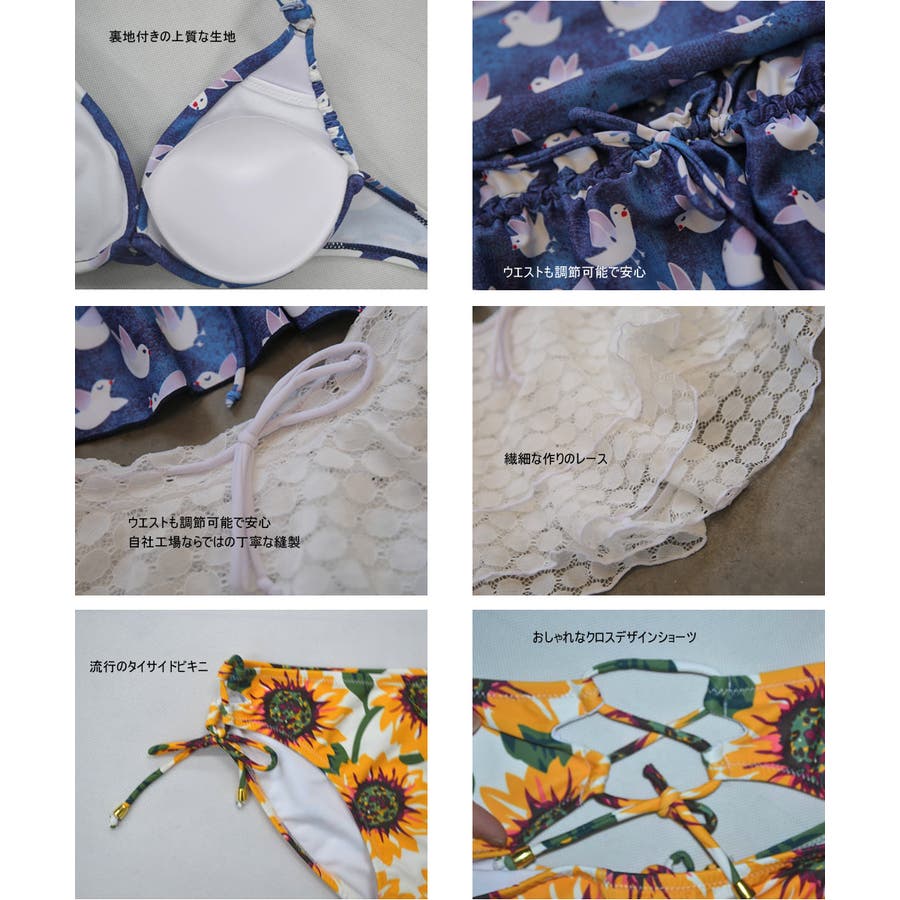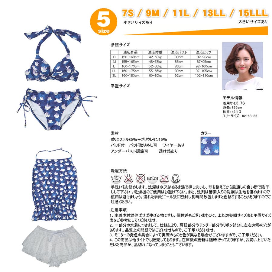 | 注意事項 | 1、水着本体は伸ばせば伸びる物ですし、個体差もございますので、上記の参照サイズ表と平置サイズ表をご参考にしてくださいませ。 2、一部分の水着につきまして、仕様により、肩紐部分やアンダー部分に左右対称の穴があります。品質上の問題ではございませんので、ご了承くださいませ。 3、こちらの商品は返品、交換を承っております。どうぞご安心してお買い物をお楽しみください。 返品、交換の送料及び手数料については、初期不良またはご注文と異なる場合は当社が負担致します。 それ以外の場合、往復送料(送料サービスも無効)、手数料をお客様にご負担頂きますので、ご了承くださいませ。 4、モニターの発色の具合によって実際のものと色が異なる場合がございますので、ご了承ください。 5、この商品は他サイトでも販売しております。在庫数の更新は随時行っておりますが、お買い上げいただいた商品が、品切れになってしまうこともございます。 水着レディース:ビキニ:4点セット | ||||||||||||||||||||||||||||||